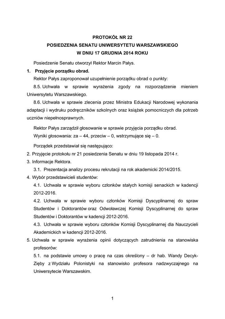 PROTOKÓŁ NR 22 POSIEDZENIA SENATU UNIWERSYTETU WARSZAWSKIEGO W DNIU 17 GRUDNIA 2014 ROKU Posiedzenie Senatu otworzył Rektor Marcin Pałys. 1. Przyjęcie porządku obrad. Rektor Pałys zaproponował uzupełnienie porządku obrad o punkty: 8.5. Uchwała w sprawie wyrażenia zgody na rozporządzenie mieniem Uniwersytetu Warszawskiego. 8.6. Uchwała w sprawie zlecenia przez Ministra Edukacji Narodowej wykonania adaptacji i wydruku podręczników szkolnych oraz książek pomocniczych dla potrzeb uczniów niepełnosprawnych. Rektor Pałys zarządził głosowanie w sprawie przyjęcia porządku obrad. Wyniki głosowania: za – 44, przeciw – 0, wstrzymujące się – 0. Porządek przedstawiał się następująco: 2. Przyjęcie protokołu nr 21 posiedzenia Senatu w dniu 19 listopada 2014 r. 3. Informacje Rektora. 3.1. Prezentacja analizy procesu rekrutacji na rok akademicki 2014/2015. 4. Wybór przedstawicieli studentów: 4.1. Uchwała w sprawie wyboru członków stałych komisji senackich w kadencji 2012-2016. 4.2. Uchwała w sprawie wyboru członków Komisji Dyscyplinarnej do spraw Studentów i Doktorantów oraz Odwoławczej Komisji Dyscyplinarnej do spraw Studentów i Doktorantów w kadencji 2012-2016. 4.3. Uchwała w sprawie wyboru członków Komisji Dyscyplinarnej dla Nauczycieli Akademickich w kadencji 2012-2016. 5. Uchwała w sprawie wyrażenia opinii dotyczących zatrudnienia na stanowiska profesorów: 5.1. na podstawie umowy o pracę na czas określony – dr hab. Wandy DecykZięby z Wydziału Polonistyki na stanowisko profesora nadzwyczajnego na Uniwersytecie Warszawskim. 1 5.2. na podstawie umowy o pracę na czas wykonania określonej pracy: 1) dr. hab. Piotra Bały z Interdyscyplinarnego Centrum Modelowania Matematycznego i Komputerowego na stanowisko profesora nadzwyczajnego na Uniwersytecie Warszawskim; 2) prof. dr. hab. Stanisława Krukowskiego z Interdyscyplinarnego Centrum Modelowania Matematycznego i Komputerowego na stanowisko profesora zwyczajnego na Uniwersytecie Warszawskim. 5.3. na podstawie mianowania na czas określony – prof. dr hab. Joanny Marii Madalińskiej-Michalak z Wydziału Pedagogicznego na stanowisko profesora nadzwyczajnego na Uniwersytecie Warszawskim. 5.4. na podstawie mianowania na czas nieokreślony: 1) prof. dr. hab. Andrzeja Golnika z Wydziału Fizyki na stanowisko profesora nadzwyczajnego na Uniwersytecie Warszawskim; 2) prof. dr. hab. Aleksandra Chłopeckiego z Wydziału Prawa i Administracji na stanowisko profesora zwyczajnego na Uniwersytecie Warszawskim. 6. Sprawy dotyczące studiów. 6.1. Uchwała w sprawie wytycznych dotyczących projektowania programów kształcenia, ich realizacji i oceny rezultatów. 6.2. Uchwała w sprawie zmiany uchwały nr 563 Senatu Uniwersytetu Warszawskiego z dnia 13 czerwca 2012 r. w sprawie wytycznych dla rad podstawowych jednostek organizacyjnych dotyczących projektowania planów i programów studiów podyplomowych. 7. Sprawy dotyczące rekrutacji. 7.1. Uchwała w sprawie zmiany uchwały nr 102 Senatu Uniwersytetu Warszawskiego z dnia 22 maja 2013 r. w sprawie warunków i trybu postępowania rekrutacyjnego na studia pierwszego stopnia, jednolite studia magisterskie i studia drugiego stopnia na Uniwersytecie Warszawskim w roku akademickim 2014/2015. 7.2. Uchwała w sprawie zmiany uchwały nr 239 Senatu Uniwersytetu Warszawskiego z dnia 21 maja 2014 r. w sprawie warunków i trybu postępowania rekrutacyjnego na studia pierwszego stopnia, jednolite studia magisterskie i studia drugiego stopnia na Uniwersytecie Warszawskim 2015/2016. 2 w roku akademickim 7.3. Uchwała w sprawie zmiany uchwały nr 189 Senatu Uniwersytetu Warszawskiego z dnia 19 lutego 2014 r. w sprawie określenia limitów przyjęć na studia pierwszego stopnia, jednolite studia magisterskie i studia drugiego stopnia na Uniwersytecie Warszawskim w roku akademickim 2014/2015. 7.4. Uchwała w sprawie zmiany uchwały nr 240 Senatu Uniwersytetu Warszawskiego z dnia 21 maja 2014 r. w sprawie szczegółowych zasad przyjmowania na studia laureatów i finalistów olimpiad stopnia centralnego oraz laureatów i finalistów konkursów ogólnopolskich i międzynarodowych w roku akademickim 2015/2016, 2016/2017 oraz 2017/2018. 8. Sprawy bieżące. 8.1. Uchwała w sprawie powołania recenzenta i przyjęcia recenzji prof. Jacka Baranowskiego z Wydziału Fizyki dorobku prof. Shūji Nakamury – kandydata do tytułu doktora honoris causa Uniwersytetu Wrocławskiego. 8.2. Uchwała w sprawie tablicy pamiątkowej z okazji 250. rocznicy powstania Szkoły Rycerskiej. 8.3. Uchwała w sprawie zmiany uchwały nr 33 Senatu Uniwersytetu Warszawskiego z dnia 17 grudnia 2008 r. w sprawie przyjęcia perspektywicznego planu inwestycyjnego Uniwersytetu Warszawskiego. 8.4. Uchwała w sprawie zmiany uchwały nr 568 Senatu Uniwersytetu Warszawskiego z dnia 13 czerwca 2012 r. w sprawie wyrażenia zgody na rozporządzenie mieniem Uniwersytetu Warszawskiego. 9. Wolne wnioski. Rektor Pałys powitał nowych przedstawicieli studentów w Senacie: – Marszałka Parlamentu Studentów UW – Błażeja Papiernika z Centrum Studiów Samorządu Terytorialnego i Rozwoju Lokalnego, – Przewodniczącą Zarządu Samorządu Studentów UW – Maję Matuszewską z Wydziałów Dziennikarstwa i Nauk Politycznych oraz Zarządzania, – Mateusza Dąbrowskiego z Wydziału Psychologii, – Adama Harchi z Wydziału Zarządzania, – Krzysztofa Kamińskiego z Wydziału Dziennikarstwa i Nauk Politycznych, – Mateusza Mrozka z Kolegium MISH, – Karolinę Pietkiewicz z Wydziału Zarządzania, – Rafała Skrzypaszka z Wydziału Dziennikarstwa i Nauk Politycznych, 3 – Rafała Smolenia z Kolegium MISH, – Julię Sobolewską z Wydział Stosowanych Nauk Społecznych i Resocjalizacji, – Walerego Stasiaka z Wydziału Geografii i Studiów Regionalnych, – Annę Urbańską z Wydziału Psychologii. Rektor Pałys poinformował, że: usprawiedliwienia nieobecności nadesłali: – dziekan Wydziału Biologii – prof