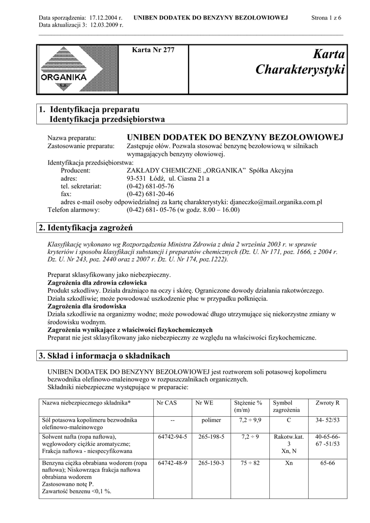 Data sporządzenia: 17.12.2004 r. UNIBEN DODATEK DO BENZYNY BEZOŁOWIOWEJ Strona 1 z 6 Data aktualizacji 3: 12.03.2009 r. __________________________________________________________________________________________________ Karta Nr 277 Karta Charakterystyki 1. Identyfikacja preparatu Identyfikacja przedsiębiorstwa Nazwa preparatu: Zastosowanie preparatu: UNIBEN DODATEK DO BENZYNY BEZOŁOWIOWEJ Zastępuje ołów. Pozwala stosować benzynę bezołowiową w silnikach wymagających benzyny ołowiowej. Identyfikacja przedsiębiorstwa: Producent: ZAKŁADY CHEMICZNE „ORGANIKA” Spółka Akcyjna adres: 93-531 Łódź, ul. Ciasna 21 a tel. sekretariat: (0-42) 681-05-76 fax: (0-42) 681-20-46 adres e-mail osoby odpowiedzialnej za kartę charakterystyki: [email protected] Telefon alarmowy: (0-42) 681- 05-76 (w godz. 8.00 – 16.00) 2. Identyfikacja zagroŜeń Klasyfikację wykonano wg Rozporządzenia Ministra Zdrowia z dnia 2 września 2003 r. w sprawie kryteriów i sposobu klasyfikacji substancji i preparatów chemicznych (Dz. U. Nr 171, poz. 1666, z 2004 r. Dz. U. Nr 243, poz. 2440 oraz z 2007 r. Dz. U. Nr 174, poz.1222). Preparat sklasyfikowany jako niebezpieczny. ZagroŜenia dla zdrowia człowieka Produkt szkodliwy. Działa draŜniąco na oczy i skórę. Ograniczone dowody działania rakotwórczego. Działa szkodliwie; moŜe powodować uszkodzenie płuc w przypadku połknięcia. ZagroŜenia dla środowiska Działa szkodliwie na organizmy wodne; moŜe powodować długo utrzymujące się niekorzystne zmiany w środowisku wodnym. ZagroŜenia wynikające z właściwości fizykochemicznych Preparat nie jest sklasyfikowany jako niebezpieczny ze względu na właściwości fizykochemiczne. 3. Skład i informacja o składnikach UNIBEN DODATEK DO BENZYNY BEZOŁOWIOWEJ jest roztworem soli potasowej kopolimeru bezwodnika olefinowo-maleinowego w rozpuszczalnikach organicznych. Składniki niebezpieczne występujące w preparacie: Nazwa niebezpiecznego składnika* Sól potasowa kopolimeru bezwodnika olefinowo-maleinowego Nr CAS Nr WE StęŜenie % (m/m) Symbol zagroŜenia Zwroty R -- polimer 7,2 ÷ 9,9 C 34- 52/53 Solwent nafta (ropa naftowa), węglowodory cięŜkie aromatyczne; Frakcja naftowa - niespecyfikowana 64742-94-5 265-198-5 7,2 ÷ 9 Rakotw.kat. 3 Xn, N 40-65-6667 -51/53 Benzyna cięŜka obrabiana wodorem (ropa naftowa); Niskowrząca frakcja naftowa obrabiana wodorem Zastosowano notę P. Zawartość benzenu <0,1 %. 64742-48-9 265-150-3 75 ÷ 82 Xn 65-66 Data sporządzenia: 17.12.2004 r. UNIBEN DODATEK DO BENZYNY BEZOŁOWIOWEJ Strona 2 z 6 Data aktualizacji 3: 12.03.2009 r. __________________________________________________________________________________________________ *Wymienione substancje nie posiadają w chwili obecnej numeru rejestracyjnego zgodnie z rozporządzeniem REACH, podlegają przepisom okresu przejściowego. 4. Pierwsza pomoc Na skutek wdychania: Wyprowadzić osobę poszkodowaną na świeŜe powietrze. W razie potrzeby zapewnić pomoc lekarską. Kontakt ze skórą: W przypadku oblania skóry, zdjąć zanieczyszczoną odzieŜ, skaŜoną skórę zmyć duŜą ilością wody z mydłem. Wyprać skaŜoną odzieŜ. W przypadku podraŜnienia, zaczerwienienia zapewnić konsultację dermatologiczną. Kontakt z oczami: W przypadku dostania się do oka, płukać oko ciągłym strumieniem wody przez około 15 minut. W razie potrzeby zapewnić konsultację okulistyczną. Po spoŜyciu: Przepłukać usta wodą i popić duŜą ilością wody. Nie wywoływać wymiotów. Zapewnić pomoc lekarską. Wskazówki dla lekarza: Przy aspiracji (np. przy wymiotach) niebezpieczeństwo odmy płucnej i/lub zapalenie płuc. Postępowanie: Leczenie objawowe (detoksykacja, podtrzymywanie funkcji Ŝyciowych), nie jest znane Ŝadne specyficzne antidotum, w celu zapobieŜenia odmie płucnej: inhalacja kortykosterydem w aerozolu. 5. Postępowanie w przypadku poŜaru Odpowiednie środki gaśnicze: Piana, dwutlenek węgla, suchy proszek gaśniczy, mgła wodna. Nieodpowiednie środki gaśnicze: nie uŜywać silnego strumienia wody. Szczególne zagroŜenie: Produkty niecałkowitego spalania mogą zawierać tlenek węgla. Środki ochrony indywidualnej dla straŜaków: Ubranie ochronne i aparat do oddychania. Inne informacje: Chłodzić sąsiednie pojemniki rozpylając na nie wodę. 6. Postępowanie w przypadku niezamierzonego uwolnienia do środowiska Indywidualne środki ostroŜności: Unikać kontaktu z preparatem. Nie wdychać oparów. Przy zbieraniu wycieków nosić odzieŜ ochronną, rękawice ochronne, okulary ochronne /gogle/ . Środki ochrony środowiska: Zebrać lub przepompować wyciek do wydzielonych pojemników w celu utylizacji bądź dalszego przerobu. Nie dopuścić do przedostania się preparatu do kanalizacji lub wód gruntowych przez usypanie wałów z piachu. Metoda unieszkodliwiania wycieków: Małe wycieki posypać piachem lub innym niepalnym materiałem chłonnym a następnie zebrać łopatą i przenieść do zamykanych pojemników w celu dalszego usunięcia. SkaŜone miejsca zmyć wodą. W przypadku nie moŜności opanowania sytuacji wezwać Jednostkę Ratownictwa Chemicznego. W przypadku skaŜenia wód gruntowych zawiadomić odpowiednie władze. 7. Postępowanie z preparatem i jego magazynowanie Postępowanie z preparatem: Preparat stosować z zachowaniem ogólnych zasad bezpieczeństwa i higieny pracy. Magazynowanie: Preparat pakowany jest w butelki polietylenowe o poj. od 60 ml do 500 ml, kanistry o poj.5L, beczki blaszane nielakierowane wewnątrz poj. 60L, oraz w paletopojemniki PE. Preparat naleŜy przechowywać w pomieszczeniach magazynowych w temperaturze do 30 ºC, w odległości od źródeł ciepła nie mniejszej niŜ 2 m. Okres trwałości preparatu – 3 lata od daty produkcji. Specyficzne zastosowania: Zastępuje ołów. Pozwala stosować benzynę bezołowiową w silnikach wymagających benzyny ołowiowej. Data sporządzenia: 17.12.2004 r. UNIBEN DODATEK DO BENZYNY BEZOŁOWIOWEJ Strona 3 z 6 D