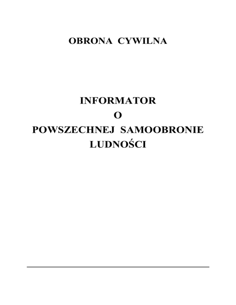 OBRONA CYWILNA INFORMATOR O POWSZECHNEJ SAMOOBRONIE LUDNOŚCI CELE I ZADANIA OBRONY CYWILNEJ Obrona cywilna ma na celu ochronę ludności, zakładów pracy i urządzeń użyteczności publicznej, dóbr kultury, ratowanie i udzielanie pomocy poszkodowanym w czasie wojny oraz współdziałanie w zwalczaniu klęsk żywiołowych i zagrożeń środowiska oraz usuwaniu ich skutków. Zadania obrony cywilnej obejmują w szczególności: wykrywanie zagrożeń oraz ostrzeganie i alarmowanie, organizowanie ewakuacji ludności, przygotowanie budowli ochronnych, zaopatrywanie ludności w sprzęt i środki ochrony indywidualnej, zaciemnianie i wygaszanie oświetlenia, organizowanie i prowadzenie akcji ratunkowych, udzielanie poszkodowanym pomocy medycznej, walkę z pożarami, przygotowanie oraz prowadzenie likwidacji skażeń i zakażeń, ochrona żywności i innych dóbr niezbędnych do przetrwania, organizowanie doraźnych pomieszczeń i zaopatrzenia dla poszkodowanej ludności, zabezpieczenie dóbr kultury, urządzeń użyteczności publicznej, ważnej dokumentacji, doraźne przywracanie działania niezbędnych służb użyteczności publicznej, w tym pomocy w budowie i odbudowie awaryjnych ujęć wody pitnej, doraźną pomoc w przywracaniu i utrzymaniu porządku w strefach dotkniętych klęskami, doraźną pomoc w grzebaniu zmarłych. Zadania Obrony Cywilnej w czasie pokoju obejmują: działalność planistyczną i prace organizacyjne, działalność szkoleniową i upowszechniającą w zakresie problematyki obrony cywilnej, przygotowanie ludności do uczestnictwa w powszechnej samoobronie. Organizacje obrony cywilnej w okresie pokoju mogą również współdziałać w zwalczaniu klęsk żywiołowych i zagrożeń środowiska oraz usuwaniu ich skutków, organizowanym i prowadzonym przez inne organy. 2 SYSTEM ALARMOWY OBRONY CYWILNEJ Jednym z przedsięwzięć obrony cywilnej jest organizacja systemów alarmowych, które mają ostrzegać ludność przed grożącym niebezpieczeństwem napadu z powietrza oraz skażeniem promieniotwórczym i chemicznym, a także o klęskach żywiołowych i zagrożeniu środowiska w celu umożliwienia jej odpowiedniego zareagowania. Do ogłaszania i odwoływania alarmów wykorzystuje się: syreny alarmowe, radiowęzły radiofonii przewodowej oraz zastępcze środki alarmowania (syreny ręczne, gongi, dzwony nagłośniającymi, itp.). 3 kościelne, pojazdy z urządzeniami RODZAJE ALRMÓW, TREŚĆ KOMUNIKATÓW OSTRZEGAWCZYCH, SYGNAŁY ALARMOWE RODZAJE ALARMÓW, TERŚĆ KOMUNIKATÓW OSTRZEGAWCZYCH, SYGNAŁY ALARMOWE Sposób ogłoszenia alarmów Lp. Rodzaj alarmu Alarm powietrzny 1 Alarm o skażeniach 2 akustyczny system alarmowy - Ciągły, modulowany dźwięk syreny w okresie jednej minuty - Następujące po sobie sekwencje długich dźwięków sygnałów dźwiękowych pojazdów, gwizdków, trąbek lub innych przyrządów na sprężone powietrze w stosunku 3:1; w przybliżeniu 3 sekundy dźwięku oraz 1 sekunda przerwy - Przerywany modulowany dźwięk syreny - Sekwencja krótkich sygnałów wydawanych sygnałem dźwiękowym pojazdu lub innym podobnym urządzeniem lub też uderzenia metalem czy też innym przedmiotem w stosunku 1:1, w przybliżeniu 1 sekunda wydawania dźwięku oraz 1 sekunda przerwy środków masowego przekazu wizualny sygnał alarmowy Powtarzana trzykrotnie zapowiedź słowna: Uwaga! Uwaga! Znak czerwony Uwaga! ogłaszam najlepiej w kształcie alarm powietrzny kwadratu dla ............ Powtarzana trzykrotnie zapowiedź słowna: Uwaga! Uwaga! ogłaszam alarm o skażeniach ........... (podać rodzaj skażenia) dla .............. Sposób odwołania alarmów akustyczny środków masowego system alarmoprzekazu wy Dźwięk ciągły trwający 3 minuty Dźwięk ciągły trwający 3 minuty Znak czarny najlepiej w kształcie trójkąta 4 Powtarzana trzykrotnie zapowiedź słowna: Uwaga! Uwaga! Odwołuję alarm powietrzny dla ............. Powtarzana trzykrotnie zapowiedź słowna: Uwaga! Uwaga! Odwołuję alarm o skażeniach dla ............. KOMUNIKATY OSTRZEGAWCZE Lp. Rodzaj komunikatu Sposób ogłoszenia komunikatu akustyczny system alarśrodków masowego przekazu mowy Sposób odwołania komunikatu akustyczny system alar- środków masowego przekazu mowy Powtarzana trzykrotnie zapowiedź słowna: Uwaga! Uwaga! Osoby znajdująca się na terenie ......... około godz. ........ min. ......... może nastąpić skażenie ............ (podać rodzaj skażenia) w kierunku ........................ (podać kierunek) Uprzedzenie o zagrożeniu skażeniami 1 Uprzedzenie o zagrożeniu zakażeniami Powtarzana trzykrotnie zapowiedź słowna: Uwaga! Uwaga! Odwołuję uprzedzenie o zagrożeniu ........... (rodzaj skażenia) dla ......... Formę i treść komunikatu uprzedzenia o zagrożeniu zakażeniami ustalają organy Państwowej Inspekcji Sanitarnej 2 Uprzedzenie o klęskach żywiołowych i zagrożeniu środowiska Powtarzana trzykrotnie zapowiedź słowna: Uwaga! Uwaga! Odwołuję alarm o klęskach ............. dla .................. Powtarzana trzykrotnie zapowiedź słowna: Informacja o zagrożeniu i sposobie postępowania mieszkańców 3 Akt prawny opublikowany przez Dom Wydawniczy ABC POSTĘPOWANIE PO OGŁOSZENIU SYGNAŁÓW ALARMOWYCH Po usłyszeniu sygnałów alarmowych należy: zachowywać się spokojnie, przeciwdziałać panice i lękowi, ściśle wykonywać zarządzenia służb porządkowych. Stosować się do zaleceń i informacji przekazywanych w komunikatach, przebywając na terenie otwartym należy opuścić zagrożony rejon stosując się do poleceń zawartych w komunikatach przekazywanych przez ruchome środki nagłaśniające, 5 przebywając w pomieszczeniach: należy włączyć odbiornik radiowy lub telewizyjny na jedno z pasm lokalnych, zastosować się do przekazywanych komunikatów i poleceń. ALARM POWIETRZNY Po usłyszeniu sygnału alarmu powietrznego należy działać szybko, ale rozważnie i bez paniki. Osoby znajdujące się w domu powinny: ubrać się
