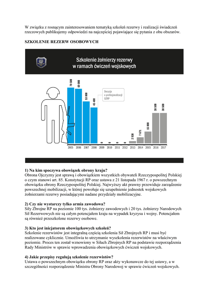 W związku z rosnącym zainteresowaniem tematyką szkoleń rezerwy i realizacji świadczeń rzeczowych publikujemy odpowiedzi na najczęściej pojawiające się pytania z obu obszarów. SZKOLENIE REZERW OSOBOWYCH 1) Na kim spoczywa obowiązek obrony kraju? Obrona Ojczyzny jest sprawą i obowiązkiem wszystkich obywateli Rzeczypospolitej Polskiej o czym stanowi art. 85. Konstytucji RP oraz ustawa z 21 listopada 1967 r. o powszechnym obowiązku obrony Rzeczypospolitej Polskiej. Najwyższy akt prawny przewiduje zarządzenie powszechnej mobilizacji, w której powołuje się uzupełnienie jednostek wojskowych żołnierzami rezerwy posiadającymi nadane przydziały mobilizacyjne. 2) Czy nie wystarczy tylko armia zawodowa? Siły Zbrojne RP na poziomie 100 tys. żołnierzy zawodowych i 20 tys. żołnierzy Narodowych Sił Rezerwowych nie są całym potencjałem kraju na wypadek kryzysu i wojny. Potencjałem są również przeszkolone rezerwy osobowe. 3) Kto jest inicjatorem obowiązkowych szkoleń? Szkolenie rezerwistów jest integralną częścią szkolenia Sił Zbrojnych RP i musi być realizowane cyklicznie. Umożliwia to utrzymanie wyszkolenia rezerwistów na właściwym poziomie. Proces ten został wznowiony w Siłach Zbrojnych RP na podstawie rozporządzenia Rady Ministrów w sprawie wprowadzenia obowiązkowych ćwiczeń wojskowych. 4) Jakie przepisy regulują szkolenie rezerwistów? Ustawa o powszechnym obowiązku obrony RP oraz akty wykonawcze do tej ustawy, a w szczególności rozporządzenie Ministra Obrony Narodowej w sprawie ćwiczeń wojskowych. 5) Dlaczego do tej pory nie szkoliliśmy rezerw osobowych? Zaprzestanie prowadzenia ćwiczeń wojskowych wprowadzono głównie w celu zapewnienia płynnej reorganizacji sił zbrojnych polegającej na zmianach strukturalnych w jednostkach wojskowych w ramach profesjonalizacji, a powrót do obowiązkowych ćwiczeń wojskowych przewidziano dopiero po osiągnięciu właściwego przygotowania struktur zawodowych do organizacji atrakcyjnych w formie i treści ćwiczeń. 6) Kiedy zawiesiliśmy zasadniczą służbę wojskową? Zasadnicza służba wojskowa oraz przeszkolenie wojskowe absolwentów szkół wyższych zostały zawieszone w 2008 r. Ostatni pobór do wojska odbył się w połowie 2008 r., a ostatnie wcielenie w ramach tego poboru w grudniu 2008 r. Zwolnienie z zasadniczej służby wojskowej ostatnich poborowych odbyło się w sierpniu 2009 r. 7) Jak długo nie szkoliliśmy rezerw osobowych? Szkolenie nie było realizowane w latach 2009-2012. Powróciliśmy do niego w 2013 r. i planujemy kontynuację w kolejnych latach. Jednak należy pamiętać, że szkolenie rezerw osobowych to również szkolenie żołnierzy NSR, które było realizowane w minionych latach. 8) Ilu rezerwistów szkoliliśmy przed czteroletnią przerwą, a ilu planujemy przeszkolić w kolejnych latach? 2006 r. – ok. 69 tys., 2007 r. – ok. 53 tys., 2008 r. – ok. 45 tys., 2009-2012 – nie realizowano szkolenia, 2013 r. – ok. 3 tys., 2014 r. – ok. 7 tys. W 2015 r. założyliśmy przeszkolenie ok. 15 tys. rezerwistów, a w 2016 r. ok. 38 tys. W kolejnych latach planujemy sukcesywny wzrost poziomów szkolenia rezerwistów. 9) Dlaczego teraz MON wraca do pomysłu? Powrót do obowiązkowej formy ćwiczeń żołnierzy rezerwy to planowe działanie mające na celu utrzymanie zdolności obronnych państwa. Wynika z konieczności utrzymania na właściwym poziomie wyszkolenia obywateli planowanych do realizacji zadań, w ramach reakcji na ewentualne zagrożenia (militarne i niemilitarne) kraju. Odbywanie obowiązkowych ćwiczeń wojskowych umożliwi przeszkalanie żołnierzy rezerwy na nowym sprzęcie wdrażanym do Sił Zbrojnych Rzeczypospolitej Polskiej w ramach profesjonalizacji oraz utrzymywanie przez żołnierzy rezerwy na właściwym poziomie nabytych już umiejętności i kwalifikacji. 10) Jaka jest procedura powołania? Wojskowy komendant uzupełnień w celu powołania żołnierza rezerwy na ćwiczenia wojskowe wydaje decyzję administracyjną w tej sprawie. Jest nią karta powołania. W karcie tej podaje się termin i miejsce stawienia się żołnierza rezerwy na ćwiczenia wojskowe. 11) Kto powołuje na ćwiczenia rezerwy? Wojskowi komendanci uzupełnień, właściwi terytorialnie dla powoływanych żołnierzy. 12) Kto będzie powoływany na obowiązkowe ćwiczenia? Żołnierze rezerwy, którzy posiadają nadane przydziały mobilizacyjne do jednostek wojskowych, lub którym planuje się nadać taki przydział, w wieku określonym ustawą o powszechnym obowiązku obrony, tj. szeregowi do 50 lat, a podoficerowie lub oficerowie do 60 lat. 13) Czy będą powoływani kawalerowie, jedyni żywiciele lub ojcowie rodzin wielodzietnych np. 3 do 5 dzieci. Kto wtedy pomoże zająć się dziećmi, czy wezwania na ćwiczenia będą przychodziły znienacka, czy też będzie czas na przygotowanie się do nich np. planując w tym czasie wolne? Przeprowadzenie ćwiczeń wojskowych jest przedsięwzięciem planowym. Termin przeprowadzania ćwiczeń jest ustalany z odpowiednim wyprzedzeniem, w celu przygotowania logistycznego jednostki wojskowej oraz zgromadzenia niezbędnych środków materiałowych przewidzianych do umundurowania, wyposażenia i przeszkolenia powoływanych żołnierzy rezerwy. Na obowiązkowe ćwiczenia żołnierzy rezerwy będą powoływani żołnierze rezerwy, którzy posiadają nadane przydziały mobilizacyjne do jednostek wojskowych, lub którym planuje się nadać taki przydział. Karty powołania na ćwiczenia mają moc decyzji administracyjnej i w związku z tym nie mogą być doręczane na krócej niż 14 dni przed terminem stawiennictwa. 14) Ile miesięcy trwa szkolenie? Nie miesięcy, a dni. Ćwiczenia mogą trwać od 2 do 30 dniu w przypadku ćwiczeń krótkotrwałych lub do 90 dni w przypadku ćwiczeń długotrwałych. Reguluje to ustawa o powszechnym obowiązku obrony RP w art. 101. 15) Czy dorośli, którzy nie byli w wojsku, a mają kategorię A, będ