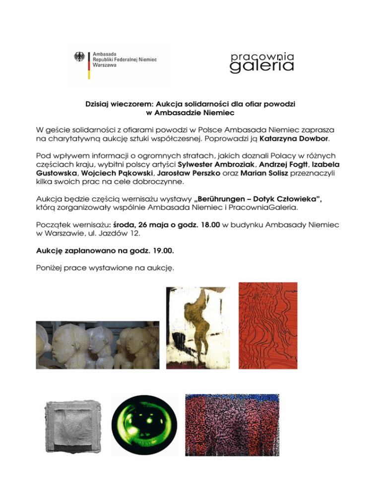 Dzisiaj wieczorem: Aukcja solidarności dla ofiar powodzi w Ambasadzie Niemiec W geście solidarności z ofiarami powodzi w Polsce Ambasada Niemiec zaprasza na charytatywną aukcję sztuki współczesnej. Poprowadzi ją Katarzyna Dowbor. Pod wpływem informacji o ogromnych stratach, jakich doznali Polacy w róŜnych częściach kraju, wybitni polscy artyści Sylwester Ambroziak, Andrzej Fogtt, Izabela Gustowska, Wojciech Pąkowski, Jarosław Perszko oraz Marian Solisz przeznaczyli kilka swoich prac na cele dobroczynne. Aukcja będzie częścią wernisaŜu wystawy „Berührungen – Dotyk Człowieka”, którą zorganizowały wspólnie Ambasada Niemiec i PracowniaGaleria. Początek wernisaŜu: środa, 26 maja o godz. 18.00 w budynku Ambasady Niemiec w Warszawie, ul. Jazdów 12. Aukcję zaplanowano na godz. 19.00. PoniŜej prace wystawione na aukcję.
