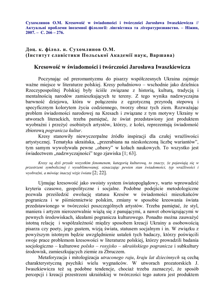 Сухомлинов О.М. Kresowość w świadomości i twórczości Jarosława Iwaszkiewicza // Актуальні проблеми іноземної філології: лінгвістика та літературознавство. – Ніжин, 2007. – С. 266 – 276. Доц. к. філол. н. Сухомлинов О.М. (Інститут славістики Польської Академії наук, Варшава) Kresowość w świadomości i twórczości Jarosława Iwaszkiewicza Poczynając od preromantyzmu do pisarzy współczesnych Ukraina zajmuje ważne miejsce w literaturze polskiej. Kresy południowo – wschodnie jako dzielnica Rzeczypospolitej Polskiej były ściśle związane z historią, kulturą, tradycją i mentalnością narodów zamieszkujących te tereny. Z tego wynika nadzwyczajna barwność dziejowa, która w połączeniu z egzotyczną przyrodą stepową i specyficznym kolorytem życia codziennego, tworzy obraz tych ziem. Rozważając problem świadomości narodowej na Kresach i związane z tym motywy Ukrainy w utworach literackich, trzeba pamiętać, że świat przedstawiony jest produktem wyobraźni i przeżyć osobistych artystów, którzy, z kolei, reprezentują świadomość zbiorową pogranicza kultur. Kresy stanowiły niewyczerpalne źródło inspiracji dla czułej wrażliwości artystycznej. Tematyka ukraińska, „przerabiana na nieskończoną liczbę wariantów”, tym samym wywoływała pewne „obawy” w kołach naukowych. To wszystko jest świadectwem „nadzwyczajności” tego zjawiska [1; 63]. Kresy są dziś przede wszystkim fenomenem, kategorią kulturową, to znaczy, że pojawiają się w przestrzeni symbolicznej i wysublimowanej, oznaczając pewien stan świadomości, typ wrażliwości i wyobraźni, a mówiąc inaczej wizje świata [2; 22]. Ujmując kresowość jako swoisty system światopoglądowy, warto wprowadzić kryteria czasowe, geopolityczne i socjalne. Podobne podejście metodologiczne pozwala prześledzić ewolucję statusu Kresów w świadomości mieszkańców pogranicza i w piśmiennictwie polskim, zmiany w sposobie kreowania świata przedstawionego w twórczości poszczególnych artystów. Trzeba pamiętać, że styl, maniera i artyzm nierozerwalnie wiążą się z panującymi, a nawet obowiązującymi w pewnych środowiskach, ideałami pogranicza kulturowego. Ponadto można zauważyć istotną relację i współzależność między sposobem kreacji Ukrainy a osobowością pisarza czy poety, jego gustem, wizją świata, statusem socjalnym i in. W związku z powyższym istotnym będzie uwzględnienie ustaleń tych badaczy, którzy poświęcili swoje prace problemom kresowości w literaturze polskiej, którzy prowadzili badania socjologiczno – kulturowe polsko – rosyjsko – ukraińskiego pogranicza i subkultury środowisk, zamieszkujących ziemie za Zbruczem. Metaforyzacja i mitologizacja utraconego raju, kraju lat dziecinnych są cechą charakterystyczną psychiki wielu wygnańców. W utworach prozatorskich J. Iwaszkiewicza też są podobne tendencje, chociaż trzeba zaznaczyć, że sposób percepcji i kreacji przestrzeni ukraińskiej w twórczości tego autora jest produktem specyficznej wizji świata, wyróżniającej się z powszechnego ujęcia świadomości i artyzmu kresowego. Analizując zmiany geopolityczne, związane z wybuchem I wojny światowej i rewolucją październikową (właśnie w tym czasie powstają pierwsze utwory J. Iwaszkiewicza), B. Hadaczek wyróżnia dwie postawy podmiotu lirycznego, ilustrując swoje twierdzenie wierszem autora „Sławy i chwały”. Pierwsza z nich, bardziej emocjonalna, zasadzała się na ożywiającej nadziei powrotu, na czekaniu i na wierze, że taki dzień nadejdzie. (...) Druga postawa, bardziej filozoficzna, wyraża pogodzenie się z faktem utraty ojczyzny prywatnej: Przeminęło. Zamknięte. Skończone. Na wieki! Nie wstrzymuje tej wody. Odpływa, odchodzi. Niechże bieży, gdzie giną wszystkie, wszystkie rzeki, Stary świat się pochylił, inny dzień się rodzi. ( J. Iwaszkiewicz, Odwiedziny miejsc ulubionych młodości, z cyklu Elegie, w tomie Inne życie ) [3; 59]. Dokonując wyboru i wyjeżdżając z Ukrainy, która była jedna, była dana wraz z narodzinami, jak dla każdego artysty miejsce urodzenia było krainą najpiękniejszą – tak, jak najpiękniejszym okresem życia było dzieciństwo i młodość [4; 54]. Iwaszkiewicz zanurza się w nową, całkiem odmienną atmosferę życia warszawskiego. Swoista obcość, często wrogość stolicy młodego państwa, odmienność krajobrazów przyczyniły się do zaostrzenia zmysłowości, wywołując odruchowe, czy jak pisał Iwaszkiewicz „machinalne” zestawienie „nowej” rzeczywistości i „starej” przeszłości. Ukraina, którą widział autor „Nowel włoskich” w pejzażach Hiszpanii, Italii, Ameryki – jest fenomenem Iwaszkiewiczowskiej świadomości kresowej. Temat naszego referatu odsyła do utworów należących do różnych okresów życia i twórczości artysty, gdzie stale obecna jest Ukraina, która oprócz tradycyjnej krajobrazowości ma inny poziom wyrażania się. Ukraina Iwaszkiewicza często funkcjonuje jako koncepcja filozoficzno – estetyczna i wywodzi się z okresu kijowskiego, miasta z wyraźnym klimatem pogranicza kulturowego. Później świadomość artysty będzie modyfikowana i transformowana, mamy na myśli ewolucję światopoglądów, wizji świata uobecniającej się w utworach artysty, przy czym trzeba pamiętać, że jej źródła znajdują się w młodzieńczych fascynacjach i rzeczywistości minionej czyli pamięci autora Prozy poetyckiej [5; 57]. Kresowa świadomość ma swoje przejawy w różnych płaszczyznach, dlatego tematyka ukraińska czyli kresowo-pograniczna obecna jest w utworach różnych okresów życia artysty: Młodość pana Twardowskiego (1914), Legendy i Demeter (1921), Księżyc wschodzi (1924), Sława i chwała (1956), Dzień sierpniowy (1956 ),