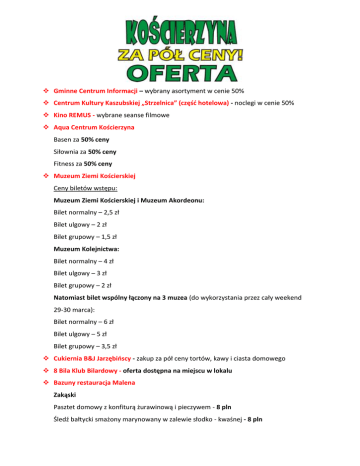 Gminne Centrum Informacji – wybrany asortyment w cenie 50% Centrum Kultury Kaszubskiej „Strzelnica” (część hotelowa) - noclegi w cenie 50% Kino REMUS - wybrane seanse filmowe Aqua Centrum Kościerzyna Basen za 50% ceny Siłownia za 50% ceny Fitness za 50% ceny Muzeum Ziemi Kościerskiej Ceny biletów wstępu: Muzeum Ziemi Kościerskiej i Muzeum Akordeonu: Bilet normalny – 2,5 zł Bilet ulgowy – 2 zł Bilet grupowy – 1,5 zł Muzeum Kolejnictwa: Bilet normalny – 4 zł Bilet ulgowy – 3 zł Bilet grupowy – 2 zł Natomiast bilet wspólny łączony na 3 muzea (do wykorzystania przez cały weekend 29-30 marca): Bilet normalny – 6 zł Bilet ulgowy – 5 zł Bilet grupowy – 3,5 zł Cukiernia B&J Jarzębińscy - zakup za pół ceny tortów, kawy i ciasta domowego 8 Bila Klub Bilardowy - oferta dostępna na miejscu w lokalu Bazuny restauracja Malena Zakąski Pasztet domowy z konfiturą żurawinową i pieczywem - 8 pln Śledź bałtycki smażony marynowany w zalewie słodko - kwaśnej - 8 pln Filet z matijasa z cebulką w oliwie i pieczywem - 9 pln Zupy Rosół drobiowy z makaronem domowym – 5 pln Zupa pomidorowa z kluseczkami lanymi – 5 pln Żurek staropolski z jajkiem i białą kiełbasą – 7 pln Zupa ogórkowa z ziemniakami i świeżo siekanym koprem – 6 pln Dania Główne Karkówka marynowana w czosnku i majeranku z grilla z ziemniakami smażonymi i zestawem surówek – 13 pln Filet z kurczaka z grilla podany z ziemniakami opiekanymi, sosem pieczarkowym i sałatką ze świeżych warzyw – 14 pln Kotlet schabowy smażony na smalcu z ziemniakami aromatyzowanymi koprem i kapustą zasmażaną - 13 pln Filet z dorsza z patelni z ziemniakami aromatyzowanymi koprem i zestawem surówek – 17 pln Tradycyjny śledź w śmietanie z cebulką i jabłkiem z pulkami – 13 pln Pierogi z mięsem kraszone grillowanym boczkiem i rumianą cebulką – 11 pln Pierogi z mięsem gęsim polane sosem kurkowym – 12 pln Desery Puchar lodowy z owocami i bitą śmietaną – 9 pln Tradycyjna szarlotka na ciepło z gałką lodów waniliowych – 7 pln Domowy placek ze śliwkami i kruszonką – 7 pln Bazuny SPA Center Zabiegi na twarz Masaż twarzy, szyi i dekoltu na marokańskim złocie - 40 PLN Luksusowy zabieg nawilżający Dermalogica połączony z mezoterapią bezigłową - 130 PLN Zabieg oczyszczający połączony z peelingiem kawitacyjnym oraz sonoforezą - 100 PLN Zabiegi na ciało Peeling całego ciała (solny lub cukrowy) (25 min) - 30 PLN Peeling całego ciała połączony z relaksacyjnym przemasowaniem ciała (55 min) - 60 PLN Masaż relaksacyjny całego ciała wykonany na maśle bursztynowym (55 min) - 70 PLN Kaszubski Rytuał (Lipa lub Len) – autorski zabieg Bazuny SPA (100 min) – 120 PLN Masaż częściowy relaksacyjny (25 min)– 35 PLN Relaksacyjny masaż głowy (25 min) - 35 PLN Masaż stóp połączony z akupresurą wykonany na bursztynowym maśle (25 min) - 35 PLN Zabiegi dodatkowe Manicure tradycyjny z malowaniem paznokci - 30 PLN Manicure Gel Color – 40 PLN Strefa Wellness (sauna sucha, łaźnia parowa, jacuzzi) - 15 PLN Gabinet Fizjoterapii i Terapii Manualnej „FIZJO-VITAL” - oferta dostępna na miejscu w lokalu Pizzeria Da Grasso - menu dostępne za 50% ceny tylko w lokalu Pizze 1. Margherita (ser, sos pomidorowy, oregano) 2. Capriciosa (ser, szynka, pieczarki) 6. Pepe Roso (ser, salami, papryka konserwowa) 11. Bendare (ser, boczek wędzony, cebula biała) 13. Mafioso (ser, salami, czosnek, papryczki jalapenos, sos Chilli Louisiana) 15. Sparare (ser, boczek wędzony, pieczarki, cebula biała, pomidory świeże, czosnek) 17. Havai (ser, szynka, ananasy) 21. Włoska (ser typu mozzarella, pomidory świeże, bazylia świeża) 24. Tricolore (ser, papryka konserwowa, cebula biała, oliwki zielone, kukurydza) 26. Frutti di Mare (ser, mieszanka frutti di mare) Restauracja Pizzeria HAMLET - oferta dostępne tylko w lokalu Zestaw obiadowy – 17 zł - Rosół z makaronem własnego wyrobu - Pulpety w sosie koperkowym z ziemniakami i buraczkami Pizza Margherita – 10 zł Hotel „GRYF” Żurek - 3,50 zł Naleśniki z dżemem - 6,00 zł Naleśniki z twarogiem - 6,50 zł Pierogi z mięsem - 7,00 zł Pierogi ruskie - 6,00 zł Pierogi z jagodami - 5,00 zł Pierogi z kapustą i grzybami 6,00 zł Filet z kurczaka po parysku, frytki, zestaw surówek - 12,00 zł Golonka na piwie, ziemniaki, kapusta zasmażana - 15,00 zł Sola w cieście, frytki, surówka z kiszonej kapusty - 16,00 zł Pizzeria Stary Browar - wszystkie pizze i sosy za 50% ceny Restauracja „Pod kurem” zupa serowa po chłopsku z grzanką ziołową - 4,50 zł żeberka duszone ze śliwką na kapuście zasmażanej z ziemniakami z koperkiem i buraczkami - 12,00 zł łosoś z rusztu na sałatce koktajlowej z grzanką ziołową - 12,00 zł Pracownia BHP EWA MARSZK Szkolenie okresowe BHP dla pracodawców i innych osób kierujących pracownikami Forma - kurs Czas trwania - 16 godzin lekcyjnych (sobota i niedziela 29-30.03.2014 r.) Cena - 1/2 x300 zł =150 zł. Kurs kończy się egzaminem, jest prowadzony dziennik obecności, sporządzany protokół i zgodnie z wymaganiami rozporządzenia wydaję zaświadczenie o ukończeniu szkolenia ważne 5 lat. Miejsce - Powiatowy Zespół Szkół Nr 2, ul. Wybickiego 1, 83-400 Kościerzyna. Restauracja "Otwarta" Marynowana łopatka wieprzowa, ziemniaki z kapustą zasmażaną, Zapiekany kotlet schabowy z ogórkiem i serem Baba po kaszubsku w sosie śmietanowo-grzybowym Domowy jabłecznik i kawą. Restauracja „Rzemyk” Zupy: Krem pomidorowy z makaronem - 3,50 zł Żurek z kiełbasą i ziemniakami - 4 zł Dania główne: Kotlet schabowy - 7,50 zł D’volaile - 6 zł Kluska mięsna (Kartacz) – 4 zł Kaczka pieczona ½ szt. z żurawiną na modrej kapuście – 28 zł Dodatki: Frytki 2,50 zł Ziemniaki gotowane 2,50 zł Kapusta zasmażana. 2,50 zł Napoje: Kawa 3 zł Herbata 3 zł Sok jabłkowy, pomarańczowy 2 zł Coca-cola, fanta, sprite 0,2l 2 zł Woda mineralna gaz i ng