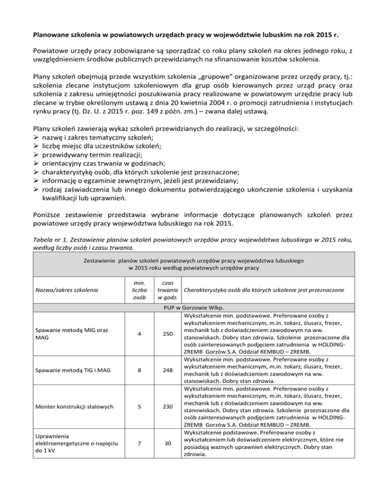 Planowane szkolenia w powiatowych urzędach pracy w województwie lubuskim na rok 2015 r. Powiatowe urzędy pracy zobowiązane są sporządzać co roku plany szkoleń na okres jednego roku, z uwzględnieniem środków publicznych przewidzianych na sfinansowanie kosztów szkolenia. Plany szkoleń obejmują przede wszystkim szkolenia „grupowe” organizowane przez urzędy pracy, tj.: szkolenia zlecane instytucjom szkoleniowym dla grup osób kierowanych przez urząd pracy oraz szkolenia z zakresu umiejętności poszukiwania pracy realizowane w powiatowym urzędzie pracy lub zlecane w trybie określonym ustawą z dnia 20 kwietnia 2004 r. o promocji zatrudnienia i instytucjach rynku pracy (tj. Dz. U. z 2015 r. poz. 149 z późn. zm.) – zwana dalej ustawą. Plany szkoleń zawierają wykaz szkoleń przewidzianych do realizacji, w szczególności: nazwę i zakres tematyczny szkoleń; liczbę miejsc dla uczestników szkoleń; przewidywany termin realizacji; orientacyjny czas trwania w godzinach; charakterystykę osób, dla których szkolenie jest przeznaczone; informację o egzaminie zewnętrznym, jeżeli jest przewidziany; rodzaj zaświadczenia lub innego dokumentu potwierdzającego ukończenie szkolenia i uzyskania kwalifikacji lub uprawnień. Poniższe zestawienie przedstawia wybrane informacje dotyczące planowanych szkoleń przez powiatowe urzędy pracy województwa lubuskiego na rok 2015. Tabela nr 1. Zestawienie planów szkoleń powiatowych urzędów pracy województwa lubuskiego w 2015 roku, według liczby osób i czasu trwania. Zestawienie planów szkoleń powiatowych urzędów pracy województwa lubuskiego w 2015 roku według powiatowych urzędów pracy Nazwa/zakres szkolenia min. liczba osób Spawanie metodą MIG oraz MAG 4 Spawanie metodą TIG i MAG 8 Monter konstrukcji stalowych 5 Uprawnienia elektroenergetyczne o napięciu do 1 kV 7 czas trwania Charakterystyka osób dla których szkolenie jest przeznaczone w godz. PUP w Gorzowie Wlkp. Wykształcenie min. podstawowe. Preferowane osoby z wykształceniem mechanicznym, m.in. tokarz, ślusarz, frezer, mechanik lub z doświadczeniem zawodowym na ww. 250 stanowiskach. Dobry stan zdrowia. Szkolenie przeznaczone dla osób zainteresowanych podjęciem zatrudnienia w HOLDINGZREMB Gorzów S.A. Oddział REMBUD – ZREMB. Wykształcenie min. podstawowe. Preferowane osoby z wykształceniem mechanicznym, m.in. tokarz, ślusarz, frezer, 248 mechanik lub z doświadczeniem zawodowym na ww. stanowiskach. Dobry stan zdrowia. Wykształcenie min. podstawowe. Preferowane osoby z wykształceniem mechanicznym, m.in. tokarz, ślusarz, frezer, mechanik lub z doświadczeniem zawodowym na ww. 230 stanowiskach. Dobry stan zdrowia. Szkolenie przeznaczone dla osób zainteresowanych podjęciem zatrudnienia w HOLDINGZREMB Gorzów S.A. Oddział REMBUD – ZREMB. Wykształcenie podstawowe. Preferowane osoby z wykształceniem lub doświadczeniem elektrycznym, które nie 30 posiadają ważnych uprawnień elektrycznych. Dobry stan zdrowia. Szkolenia z zakresu umiejętności poszukiwania pracy 24 - 30 Suma osób Suma szkoleń Szkolenia z zakresu umiejętności poszukiwania pracy Suma osób Suma szkoleń 24 Osoby, które: nie posiadają doświadczenia w poszukiwaniu pracy, utraciły motywację do poszukiwania pracy w związku z 80 długotrwałym niepowodzeniem w jej poszukiwaniu, chcą powrócić na rynek pracy po długim okresie braku aktywność zawodowej. 54 5 PUP w Krośnie Odrzańskim 80 Osoby bezrobotne w szczególnej sytuacji na rynku pracy. 24 1 PUP w Międzyrzeczu Operator wózka widłowego + magazynier 10 75 Osoby bezrobotne zarejestrowane w PUP. Wykształcenie min. zawodowe. Brak przeciwwskazań zdrowotnych. Operator frezarki CNC wieloosiowej 10 100 Osoby bezrobotne zarejestrowane w PUP. Wykształcenie min. zawodowe. Brak ograniczeń zdrowotnych. Profesjonalny sprzedawca 10 150 Osoby bezrobotne zarejestrowane w PUP. Wykształcenie min. zawodowe. Samodzielność, operatywność, skuteczność, zdolności organizacyjne, dobra pamięć. Brak przeciwwskazań zdrowotnych. Spawacz metoda TIG 5 100 Osoby bezrobotne, wykształcenie min. podstawowe, brak przeciwwskazań zdrowotnych. Elektryk do 1 kw 5 10 Osoby bezrobotne. Wykształcenie min. zawodowe. Drwal- operator pilarki 10 120 Opiekun osób starszych z podstawami języka niemieckiego 10 260 18 80 Szkolenia z zakresu umiejętności poszukiwania pracy Suma osób Suma szkoleń Osoby bezrobotne i poszukujące pracy zarejestrowane w PUP. 78 8 Mały biznes 20 Szkolenia z zakresu umiejętności poszukiwania pracy 64 Suma osób Suma szkoleń Szkolenie grupowe w ramach trójstronnych umów szkoleniowych Osoby bezrobotne, wykształcenie min. podstawowe, brak przeciwwskazań zdrowotnych. Osoby bezrobotne. Wykształcenie min. podstawowe. Cechy osobowości: wrażliwość na problemy i choroby ludzi. Umiejętność pracy z osobami starszymi , odporność na stres i specyficzne warunki pracy. 14 PUP w Nowej Soli Osoby bezrobotne z ustalonym profilem I lub II lub ubiegające się o jednorazowe środki na rozpoczęcie działalności 40 gospodarczej w ramach środków FP, których wnioski zostały rozpatrzone pozytywnie. Osoby bezrobotne z ustalonym profilem II lub poszukujące pracy, w szczególności: bez doświadczenia w poszukiwaniu pracy, bez motywacji do poszukiwania pracy, w związku z 80 długotrwałym niepowodzeniem w jej poszukiwaniu, chcące powrócić na rynek pracy po długim okresie braku aktywności zawodowej. 84 2 PUP w Słubicach Przeznaczone dla osób bezrobotnych i uprawnionych poszukujących pracy. PUP zakłada możliwość realizacji szkoleń grupowych, jednakże w ramach trójstronnych umów wg szkoleniowych, których postanowienia stanowią gwarancję potrzeb zatrudnienia skierowanych osób uprawnionych przez okres co najmniej 6 miesięcy po zakończeniu wsparcia, zatem w przypadku złożenia wniosku spełniającego wymagania, to jest Suma osób Suma szkoleń Opiekun osoby starszej z językiem niemieckim 8 M