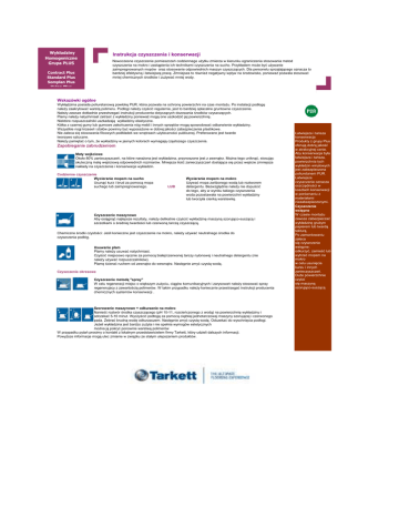 Wykładziny Homogeniczne Grupa PLUS Instrukcja czyszczenia i konserwacji Nowoczesne czyszczenie pomieszczeń codziennego uŜytku zmierza w kierunku ograniczenia stosowania metod czyszczenia na mokro i zastąpienia ich technikami czyszczenia na sucho. Przykładem moŜe być uŜywanie zaimpregnowanych mopów oraz stosowanie odpowiednich maszyn czyszczących. Dla personelu sprzątającego oznacza to bardziej efektywną i łatwiejszą pracę. Zmniejsza to równieŜ negatywny wpływ na środowisko, poniewaŜ pozwala stosować mniej chemicznych środków i zuŜywać mniej wody. Contract Plus Standard Plus Somplan Plus Vylon Plus Wskazówki ogólne Wykłądzima posiada poliuretanową powłokę PUR, która pozwala na ochronę powierzchni na czas montaŜu. Po instalacji podłogę naleŜy zaakrylować warstą polimeru. Podłogi naleŜy czyścić regularnie, jest to bardziej opłacalne gruntowne czyszczenie. NaleŜy zawsze dokładnie przestrzegać instrukcji producenta dotyczących dozowania środków czyszczących. Plamy naleŜy natychmiast zetrzeć z wykładziny poniewaŜ mogą one uszkodzić jej powierzchnię. Niektóre rozpuszczalniki uszkadzają wykładziny elastyczne. Kółka z czarnej gumy lub gumowe zakończenia nóg mebli i innych sprzętów mogą spowodować odbarwienie wykładziny. Wszystkie nogi krzeseł i stołów powinny być wyposaŜone w dobrej jakości zabezpieczenia plastikowe. Nie zaleca się stosowania filcowych podkładek we wnętrzach uŜyteczności publicznej. Preferowane jest twarde tworzywo sztuczne. NaleŜy pamiętać o tym, Ŝe wykładziny w jasnych kolorach wymagają częstszego czyszczenia. Zapobieganie zabrudzeniom Maty wejściowe Około 80% zanieczyszczeń, na które naraŜona jest wykładzina, przynoszone jest z zewnątrz. MoŜna tego uniknąć, stosując skuteczną matę wejściową odpowiednich rozmiarów. Mniejsza ilość zanieczyszczeń dostająca się przez wejście zmniejsza nakłady na czyszczenie i konserwacje wykładzin. Codzienne czyszczenie Wycieranie mopem na sucho Usunąć kurz i brud za pomocą mopa suchego lub zaimpregnowanego. LUB Wycieranie mopem na mokro UŜywać mopa zwilŜonego wodą lub roztworem detergentu. Bezwzględnie naleŜy nie dopuścić do tego, aby w wyniku takiego czyszczenia woda pozostawała na powierzchni wykładziny lub tworzyła cienką warstewkę. Czyszczenie maszynowe Aby osiągnąć najlepsze rezultaty, naleŜy delikatnie czyścić wykładzinę maszyną szorująco-suszącą i szczotkami o średniej twardości lub czerwoną tarczą czyszczącą. Chemiczne środki czystości: Jeśli konieczne jest czyszczenie na mokro, naleŜy uŜywać neutralnego środka do czyszczenia podłóg. Usuwanie plam Plamy naleŜy usuwać natychmiast. Czyścić miejscowo ręcznie za pomocą białej/czerwonej tarczy nylonowej i neutralnego detergentu (nie naleŜy uŜywać rozpuszczalników). Plamę ścierać ruchem od zewnątrz do wewnątrz. Następnie zmyć czystą wodą. Czyszczenie okresowe Czyszczenie metodą "spray" W celu regeneracji miejsc o większym zuŜyciu, ciągów komunikacyjnych i zarysowań naleŜy stosować spray regenerujacy z zawartością polimerów. W takim przypadku naleŜy koniecznie przestrzegać instrukcji producenta chemicznych systemów konserwacji . Szorowanie maszynowe + odkurzanie na mokro Nanieść roztwór środka czyszczącego (pH 10-11, rozcieńczonego z wodą) na powierzchnię wykładziny i odczekać 5-10 minut. Wyczyścić podłogę za pomocą cięŜkiej jednotarczowej maszyny szorującej i czerwonego pada. Zebrać brudną wodę odkurzaczem. Następnie zmyć czystą wodą. Odczekać do wyschnięcia podłogi. JeŜeli wykładzina jest bardzo zuŜyta i nie spełnia wymogów estetycznych moŜna ją pokryć ponownie warstwą polimerów W przypadku pytań prosimy o kontakt z lokalnym przedstawicielem firmy Tarkett, który udzieli dalszych informacji. PowyŜsze informacje mogą ulec zmianie w związku ze stałym ulepszaniem produktów. Łatwiejsza i tańsza konserwacja Produkty z grupy Plus oferują dobrą jakość w atrakcyjnej cenie. Aby konserwacja była łatwiejsza i tańsza, powierzchnia tych wykładzin winylowych jest zabezpieczona poliuretanem PUR. Łatwiejsze czyszczenie oznacza oszczędności w kosztach konserwacji w porównaniu z materiałami niezabezpieczonymi. Czyszczenie wstępne W czasie montaŜu zawsze zabezpieczać wykładzinę grubym papierem lub twardą tekturą. Po zamontowaniu zaleca się czyszczenie wstępne: odkurzyć, zamieść lub wytrzeć mopem na mokro w celu usunięcia kurzu i innych zanieczyszczeń. DuŜe powierzchnie czyści się maszyną szorująco-suszącą