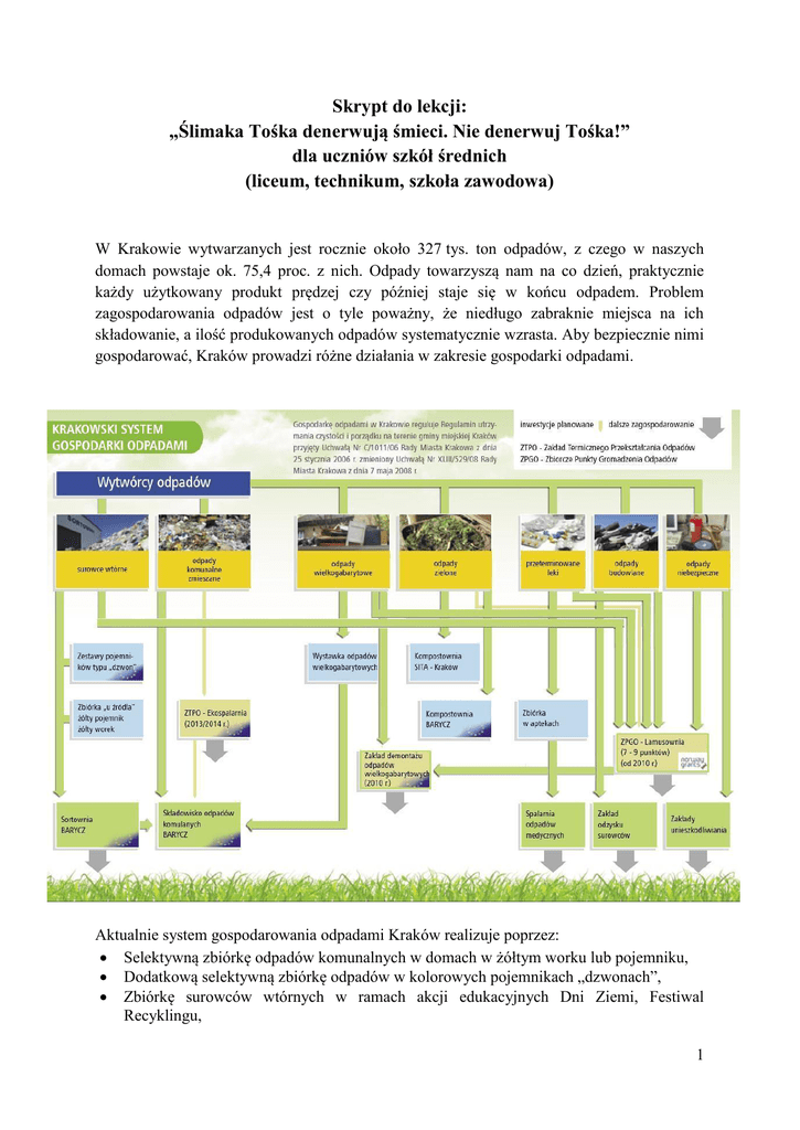 Skrypt do lekcji: „Ślimaka Tośka denerwują śmieci. Nie denerwuj Tośka!” dla uczniów szkół średnich (liceum, technikum, szkoła zawodowa) W Krakowie wytwarzanych jest rocznie około 327 tys. ton odpadów, z czego w naszych domach powstaje ok. 75,4 proc. z nich. Odpady towarzyszą nam na co dzień, praktycznie każdy użytkowany produkt prędzej czy później staje się w końcu odpadem. Problem zagospodarowania odpadów jest o tyle poważny, że niedługo zabraknie miejsca na ich składowanie, a ilość produkowanych odpadów systematycznie wzrasta. Aby bezpiecznie nimi gospodarować, Kraków prowadzi różne działania w zakresie gospodarki odpadami. Aktualnie system gospodarowania odpadami Kraków realizuje poprzez: Selektywną zbiórkę odpadów komunalnych w domach w żółtym worku lub pojemniku, Dodatkową selektywną zbiórkę odpadów w kolorowych pojemnikach „dzwonach”, Zbiórkę surowców wtórnych w ramach akcji edukacyjnych Dni Ziemi, Festiwal Recyklingu, 1 Zbiórkę odpadów wielkogabarytowych w „Akcji Wystawka”, Zbiórkę przeterminowanych leków w aptekach, Zbiórkę zużytych baterii w wielu punktach w mieście (np. w Marketach), Zbiórkę zużytych świetlówek kompaktowych w różnych punktach w mieście, Zbiórkę odpadów zielonych w kompostowniach. Aby możliwe było właściwe postępowanie z odpadami, w mieście powstały nowoczesne obiekty i instalacje: Składowisko odpadów komunalnych Barycz, cześć Centrum Ekologicznego Barycz wraz z instalacją do odzysku biopaliwa; Sortownia (np. Sortownia Barycz w Centrum Ekologicznym Barycz); Kompostownia (np. Kompostownia w Centrum Ekologicznym Barycz); Lamusownia (Zbiorcze Punkty Gromadzenia Odpadów) – dotychczas funkcjonuje jedna, jednak w planach jest 7-9 takich obiektów w mieście; Zakład Demontażu Odpadów Wielkogabarytowych. Są również takie, których budowa jest konieczna i są zaplanowane na najbliższą przyszłość czyli Ekospalarnia. Dla naszego życia i zdrowia, oraz dla przyszłych pokoleń, bardzo ważne jest aby właściwie postępować z odpadami. Odpady nie powinny być zbierane i mieszane razem, tylko powinny być zbierane w sposób selektywny. Surowce wtórne: papier, plastik, szkło i metal, są najlepszym źródłem do ponownego wykorzystania. Można z nich otrzymać te same (np. ze szkła, aluminium) oraz wiele nowych produktów: polar z plastikowych butelek, plastikowe doniczki i meble ogrodowe z nakrętek, lekkie pokrycia dachowe z makulatury, itp. Odpady zielone – zajmują dużo miejsca na składowisku, nie można ich spalać (w Krakowie jest całkowity zakaz palenia odpadów, w tym trawy i liści – powodem jest duże zanieczyszczenie powietrza nad miastem, co wynika z ukształtowania terenu). W wyniku kompostowania (kontrolowany proces rozkładu) z odpadów tych powstaje wartościowy nawóz, który może być wykorzystany w rolnictwie. Odpady wielkogabarytowe – w wyniku ich zmielenia i przetworzenia w Zakładzie Demontażu Odpadów Wielkogabarytowych powstaje paliwo alternatywne, które zamiast węgla może być spalane np. w cementowniach, Odpady elektryczne i elektroniczne – w wyniku ich rozłożenia, cenne składniki mogą być ponownie wykorzystane, a niebezpieczne jak metale ciężkie (toksyczne dla organizmów żywych) unieszkodliwione, np. z 200 telefonów komórkowych można odzyskać złoto, z którego jubiler może zrobić obrączkę ślubną. Przeterminowane leki nie mogą dostać się do środowiska. Muszą być unieszkodliwione. Dla osoby chorej, są drogą do zdrowia, ale dla środowiska, w tym dla innych ludzi są śmiertelnym zagrożeniem, gdyż zawierają wiele toksycznych i trujących związków. Nigdy nie wrzucaj leków do toalety! Oczyszczalnie nie radzą sobie dobrze z takimi substancjami a ich obecność w wodzie sprawia, że bakterie i wirusy uodparniają się na nie i do terapii potrzebne będą nowe leki lub większe ich dawki. 2 Zużyte baterie i akumulatory są odpadami niebezpiecznymi i stanowią zagrożenie, głównie ze względu na zawartość metali ciężkich: ołów, kadm i nikiel. Gdy zostaną wprowadzone do środowiska powodują zakłócenia procesów samooczyszczania w wodach i glebie oraz powodują, że oczyszczalnie ścieków pracują z dużo mniejszą wydajnością. Może nastąpić: skażenie wód gruntowych, stanowiących źródło wody pitnej. Świetlówki zawierają niebezpieczną rtęć i luminofory. Zatrucie rtęcią powoduje m.in. uszkodzenie nerek, zaburzenia wzroku, słuchu, mowy i koordynacji ruchów, deformuje kości i może powodować zmiany nowotworowe. Dlatego właśnie świetlówki powinny być zbierane w sposób selektywny. Składowanie odpadów, jest najstarszym i najgorszym sposobem zagospodarowania odpadów. Składowane odpady przepadają bezpowrotnie, nie można ich już ponownie wykorzystać. Zalegają, zajmując ogromną przestrzeń, pod powierzchnią Ziemi dziesiątki – tysiące lat, wpływając na nasze otoczenie. Fot. ZIKiT Lamusownia to nowoczesny punkt odbioru surowców wtórnych oraz innych problemowych odpadów, których nie można wyrzucać do kosza na śmieci. Jest to idealne rozwiązanie w celu ochrony środowiska naturalnego, poprawy estetyki miasta, zapewnienia skutecznej formy odbioru odpadów nadających się do ponownego przetworzenia. Dla wygody mieszkańców miasto Kraków zaplanowało budowę od siedmiu do dziewięciu Lamusowni, zwanych inaczej Zbiorczymi Punktami Gromadzenia Odpadów. Lamusownia to nie wysypisko, ani stacja przeładunkowa! To nowoczesny obiekt gospodarki odpadami, sprawdzone rozwiązanie w krajach szczególnie dbających o ochronę środowiska, jak: Norwegia, Dania, Szwecja, Francja. Zapewnia mieszkańcom bezpłatny odbiór 3 dostarczonych odpadów. Jest to skuteczna forma ochrony środowiska naturalnego, poprzez przechwycenie i unieszkodliwienie odpadów powodujących ogromne szkody w środowisku. Główne cele i korzyści Lamusowni to wydzielenie odpadów nieb