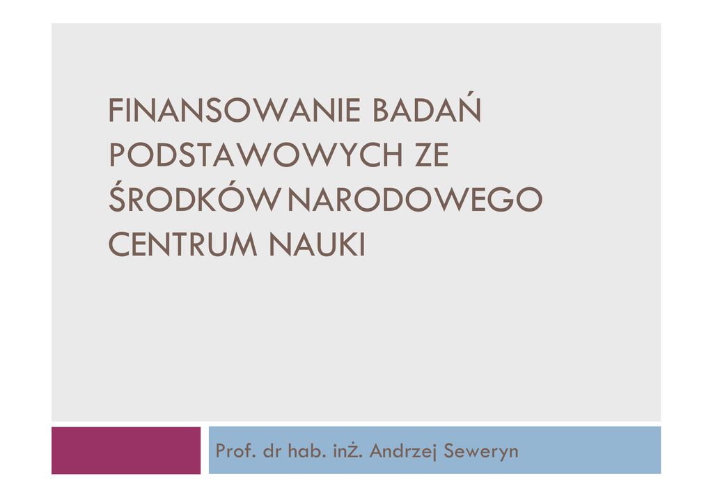 FINANSOWANIE BADAŃ PODSTAWOWYCH ZE ŚRODKÓW NARODOWEGO CENTRUM NAUKI Prof. dr hab. inż. Andrzej Seweryn Badania podstawowe - definicja 2 Zgodnie z ustawą z dn. 30 kwietnia 2010 o zasadach finansowania nauki (Dz. U. Nr 96, poz. 615), przez badania podstawowe rozumiemy „oryginalne prace badawcze eksperymentalne lub teoretyczne podejmowane przede wszystkim w celu zdobywania nowej wiedzy o podstawach zjawisk i obserwowalnych faktów bez nastawienia na bezpośrednie praktyczne zastosowanie lub użytkowanie”. Typy konkursów 3 Konkurs na finansowanie projektów badawczych, w tym finansowanie zakupu lub wytworzenia aparatury naukowo-badawczej niezbędnej do realizacji tych projektów. Konkurs na finansowanie projektów badawczych, realizowanych przez osoby rozpoczynające karierę naukową nieposiadające stopnia naukowego doktora. Konkurs na finansowanie projektów badawczych realizowanych przez osoby rozpoczynające karierę naukową posiadające stopień naukowy doktora. Konkurs na finansowanie międzynarodowych projektów badawczych niewspółfinansowanych. Konkurs dla doświadczonych naukowców na finansowanie projektów badawczych mających na celu realizację pionierskich badań naukowych, w tym interdyscyplinarnych, ważnych dla rozwoju nauki, wykraczających poza dotychczasowy stan wiedzy, i których efektem mogą być odkrycia naukowe. Konkurs na finansowanie stypendiów doktorskich i staży po uzyskaniu stopnia naukowego doktora. Konkurs na finansowanie projektów badawczych, w tym finansowanie zakupu lub wytworzenia aparatury naukowo-badawczej niezbędnej do realizacji tych projektów. 4 Z wnioskami o przyznanie środków finansowych na realizację projektów badawczych mogą występować podmioty określone w art. 10 ustawy z dnia 30 kwietnia 2010 r. o zasadach finansowania nauki (Dz. U. Nr 96, poz. 615). Wymagane kryteria: obejmuje badania podstawowe, czyli oryginalne prace badawcze eksperymentalne lub teoretyczne podejmowane przede wszystkim w celu zdobywania nowej wiedzy o podstawach zjawisk i obserwowalnych faktów bez nastawienia na bezpośrednie praktyczne zastosowanie lub użytkowanie, do konkursu mogą być zgłaszane projekty ze wszystkich istniejących dziedzin naukowych, według wykazu Paneli Dyscyplin NCN, czas realizacji projektu nie przekracza 36 miesię ęcy, zadania objęte wnioskiem nie mogą być finansowane ze środków pochodzących z innych źródeł. Konkurs na finansowanie projektów badawczych, realizowanych przez osoby rozpoczynające karierę naukową nieposiadające stopnia naukowego doktora. 5 Wnioskodawca: Osoby rozpoczynające karierę naukową nieposiadające stopnia naukowego doktora, w formie określonej w art. 10 ustawy z dnia 30 kwietnia 2010 r. o zasadach finansowania nauki (Dz. U. Nr 96, poz. 615). Wymagane kryteria: obejmuje badania podstawowe, czyli oryginalne prace badawcze eksperymentalne lub teoretyczne podejmowane przede wszystkim w celu zdobywania nowej wiedzy o podstawach zjawisk i obserwowalnych faktów bez nastawienia na bezpośrednie praktyczne zastosowanie lub użytkowanie, do konkursu mogą być zgłaszane projekty ze wszystkich istniejących dziedzin naukowych, według wykazu Paneli Dyscyplin NCN, czas realizacji projektu nie przekracza 36 miesię ęcy, zadania objęte wnioskiem nie mogą być finansowane ze środków pochodzących z innych źródeł. Konkurs na finansowanie projektów badawczych realizowanych przez osoby rozpoczynające karierę naukową posiadają ące stopień naukowy doktora. 6 Wnioskodawca: Osoby rozpoczynające karierę naukową posiadające stopień naukowy doktora. Przez osobę rozpoczynającą karierę naukową posiadającą stopień naukowy doktora, należy rozumieć osobę, która nie wcześniej niż 5 lat przed rokiem wystąpienia z wnioskiem uzyskała stopień naukowy doktora. Do okresu tego nie wlicza się urlopu macierzyńskiego i wychowawczego, udzielanych na zasadach określonych w kodeksie pracy. Konkurs na finansowanie projektów badawczych realizowanych przez osoby rozpoczynające karierę naukową posiadające stopień naukowy doktora. 7 Wymagane kryteria: obejmuje badania podstawowe, czyli oryginalne prace badawcze eksperymentalne lub teoretyczne podejmowane przede wszystkim w celu zdobywania nowej wiedzy o podstawach zjawisk i obserwowalnych faktów bez nastawienia na bezpośrednie praktyczne zastosowanie lub użytkowanie, do konkursu mogą być zgłaszane projekty ze wszystkich istniejących dziedzin naukowych, według wykazu Paneli Dyscyplin NCN, okres realizacji projektu jest nie krótszy niż 36 miesię ęcy i nie przekracza 60 miesię ęcy. W pierwszym etapie zapewnia się finansowanie na okres 36 miesięcy realizacji projektu oraz gwarantuje możliwość przedłużenia finansowania o dalszy okres nieprzekraczający 24 miesięcy. Warunkiem przedłużenia jest pozytywna ocena realizacji projektu w okresie pierwszych 30 miesięcy, dokonana przez Zespół Ekspertów, wysokość finansowania nie powinna przekraczać 1 mln złł na cały okres 60 miesięcy, zadania objęte wnioskiem nie mogą być finansowane ze środków pochodzących z innych źródeł. Konkurs na finansowanie międzynarodowych projektów badawczych niewspółłfinansowanych. 8 Wnioskodawca: Z wnioskami o przyznanie środków finansowych na realizację projektów badawczych mogą występować podmioty określone w art. 10 ustawy z dnia 30 kwietnia 2010 r. o zasadach finansowania nauki (Dz. U. Nr 96, poz. 615). Wymagane kryteria: Wnioskodawca może wystąpić o ten typ projektu, jeśli spełnia co najmniej jeden z poniższych warunków: posiada zgłoszony na lata (2010-2011, 2011-2012, 2013) temat, w ramach programów lub inicjatyw międzynarodowych ogłaszanych we współpracy dwu- lub wielostronnej lub projektów badawczych realizowanych przy wykorzystaniu wielkich międzynarodowych urządzeń, posiada inną umowę międzynarodową (między uczelniami), w ramach której będzie realizowany projekt, dołączy do wni