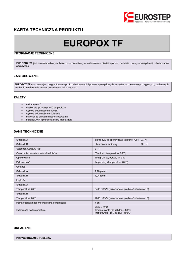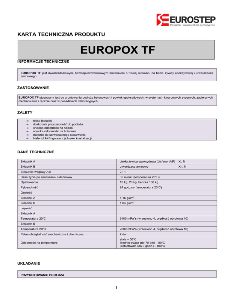 KARTA TECHNICZNA PRODUKTU EUROPOX TF INFORMACJE TECHNICZNE EUROPOX TF jest dwuskładnikowym, bezrozpuszczalnikowym materiałem o niskiej lepkości, na bazie żywicy epoksydowej i utwardzacza aminowego. ZASTOSOWANIE EUROPOX TF stosowany jest do gruntowania podłoży betonowych i powłok epoksydowych, w systemach kwarcowych sypanych, zacieranych mechanicznie i ręcznie oraz w posadzkach dekoracyjnych. ZALETY • • • • • • niska lepkość doskonała przyczepność do podłoża wysoka odporność na nacisk wysoka odporność na ścieranie materiał do uniwersalnego stosowania bisfenol A+F- gwarancja braku krystalizacji DANE TECHNICZNE Składnik A ciekła żywica epoksydowa (bisfenol A/F) Xi, N Składnik B utwardzacz aminowy Xn, N Stosunek wagowy A:B 2:1 Czas życia po zmieszaniu składników 35 minut (temperatura 20oC) Opakowania 10 kg, 20 kg, beczka 180 kg Pyłosuchość 24 godziny (temperatura 200C) Gęstość Składnik A 1,16 g/cm3 Składnik B 1,04 g/cm3 Lepkość Składnik A Temperatura 200C 6400 mPa*s (wrzeciono 4, prędkość obrotowa 10) Składnik B Temperatura 200C 2000 mPa*s (wrzeciono 4, prędkość obrotowa 10) Pełna obciążalność mechaniczna i chemiczna 7 dni Odporność na temperaturę stała – 50oC średnio-trwała (do 70 dni) – 80oC krótkotrwała (do 9 godz.) - 100oC UKŁADANIE PRZYGOTOWANIE PODŁOŻA 1 Podłoże powinno mieć wysoką wytrzymałość ( beton B25 ) i być wolne od zanieczyszczeń typu : tłuszcz, olej, brud, itp. WARUNKI UKŁADANIA Temperatura pomieszczenia i podłoża nie powinna być niższa niż +10 oC. Zalecana temperatura materiału przed nałożeniem go to 20 oC. Materiału nie należy nanosić na podłoże jeżeli jego temperatura jest niższa lub równa temperaturze rosy. MIESZANIE MATERIAŁU Materiał składa się z dwóch składników zdolnych do reagowania. Składniki przed wylaniem muszą być razem dokładnie wymieszane z zachowaniem przepisowych stosunków mieszania, które mają bardzo duży wpływ na jakość końcowego wyrobu. Poszczególne składniki są dostarczane w ilościach wzajemnie dostosowanych. Przy przelewaniu składników celem wymieszania należy pojemniki całkowicie opróżnić. Przy przetwarzaniu części zawartości opakowania, należy koniecznie odważyć składniki zachowując podane proporcje. Nie należy spowalniać lub przyspieszać reakcji przez zmianę ilości utwardzacza. Przy mieszaniu należy używać odpowiednich mieszadeł napędzanych wiertarkami o obrotach max. 400/min. W przypadku zwiększenia obrotów następuje wmieszanie powietrza, oraz nadmierne nagrzewanie się mieszanego materiału, co powoduje przyspieszenie reakcji utwardzanie i skrócenia czasu żywotności mieszaniny. Wszystkie składniki należy miksować około 2-3min. Tworzenie się smug wskazuje na niedostateczne wymieszanie. Po wymieszaniu masa jest gotowa do układania. W przypadku wątpliwości kontaktować się z serwisem firmy. KOLORYSTYKA KOLORY – bezbarwny WARUNKI PRZECHOWYWANIA KOMPONENTÓW • • • • • • składować w dobrze zamkniętych beczkach lub pojemnikach minimalna temperatura składowania +5oC nie dopuszczać do kontaktu ze skórą unikać wdychania oparów z nagrzanego materiału nie dopuszczać do kontaktu poszczególnych składników z kwasami, silnymi utleniaczami, zasadami materiał nie grozi samoistnym wybuchem PIERWSZA POMOC SKÓRA • zabrudzoną odzież należy zdjąć • zabrudzoną skórę należy zmyć wodą z dodatkiem łagodnego środka myjącego • nie należy stosować rozpuszczalnika • powstałe rany należy zabandażować bandażem wyjałowionym • należy zasięgnąć porady lekarza w razie utrzymujących się dolegliwości DROGI ODDECHOWE • po zatruciu oparami należy poszkodowanemu dostarczyć obficie świeżego powietrza • należy ułożyć poszkodowanego w pozycji spoczynkowej • chronić przed utratą ciepła oraz utratą przytomności OCZY • • • oko należy płukać obficie czystą wodą pod powiekę wtryskać wodę w przypadku utrzymujących się dolegliwości należy skonsultować się z okulistą UKŁAD POKARMOWY • należy spowodować wymioty • popić obficie wodą • należy podać węgiel aktywny • w przypadku utrzymujących się dolegliwości należy skonsultować się z lekarzem. ŚRODKI OCHRONY 2 1. 2. 3. 4. 5. Wszyscy pracownicy powinni być szczegółowo przeszkoleni w zakresie obchodzenia się z żywicami epoksydowymi i utwardzaczami, odnośnie istniejących zagrożeń. Nie wolno zlecać wykonywania prac przy żywicach alergikom. Należy używać rękawic ochronnych i okularów jeżeli istnieje niebezpieczeństwo rozbryzgiwania żywicy. Po każdorazowym kontakcie żywicy ze skórą należy umyć ręce wodą z dodatkiem łagodnych środków czyszczących (jest to szczególnie ważne przed posiłkami) nie należy używać benzenu, toluenu lub czterochlorku węgla ! Ze względów higienicznych nie należy spożywać posiłków i napojów w miejscu pracy oraz nie należy tam palić tytoniu. OGÓLNE INFORMACJE EKOLOGICZNE • • • • Poszczególne składniki oraz ich nieutwardzona mieszanina mogą zanieczyścić wodę. Nie wolno dopuścić do ich przedostania się do wód gruntowych, wód powierzchniowych i kanalizacji. Należy zawsze doprowadzić do utwardzenia resztek materiału. Utwardzone resztki produktu należy zutylizować tak jak tworzywo sztuczne. 3