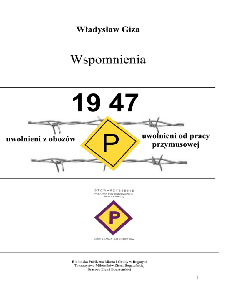 Władysław Giza Wspomnienia 19 47 uwolnieni z obozów P uwolnieni od pracy przymusowej Biblioteka Publiczna Miasta i Gminy w Bogatyni Towarzystwo Miłośników Ziemi Bogatyńskiej Bractwo Ziemi Bogatyńskiej 1 Urodziłem się w 1924 roku . Wychowywałem się na ziemi krakowskiej . W czasie wojny zostałem wywieziony na roboty przymusowe nad granicę francuską. Tu wraz z Francuzem i dwoma Rosjankami pracowałem w duŜym gospodarstwie rolnym. Po wkroczeniu Amerykanów dalsza praca i zamieszkiwanie u Niemców zostały zakazane. Dla byłych robotników przymusowych zorganizowano obozy przejściowe i ja zamieszkałem w jednym z nich. Do Polski wróciłem w maju 1946 transportem zorganizowanym przez Amerykanów. Zamieszkałem z rodzicami w rodzinnej wiosce. Tutaj widziałem jak moi sąsiedzi – rodzina Budyniów- przesiedla się na zachód. Wśród nich była moja koleŜanka szkolna Stanisława. Zachęcony ich opowiadaniami o czekającej na zachodzie pracy, postanowiłem iść ich śladem. W maju 1946 roku przyjechałem do ówczesnego Rychwałdu – dzisiejszej Bogatyni. Tu zamieszkałem w domu zajmowanym przez rodzinę Budyniów. Po kilku dniach od przyjazdu rozpocząłem pracę w Zakładach Bawełnianych. Na początku 1946 roku oŜeniłem się ze Stanisławą – siostrzenicą mojego gościnnego gospodarza. Jako małŜeństwo postanowiliśmy zamieszkać w domu naprzeciwko (dzisiejsza ulica Kurzańska 5 ). Tutaj zamieszkaliśmy wspólnie z wielopokoleniową rodziną niemiecką. Wkrótce nasi współlokatorzy niemieccy dostali nakaz opuszczenia Polski i przesiedlenia się do strefy okupacyjnej Niemiec. W domu tym urodziło się i wychowało naszych pięć córek . Józef Budyń – wujek mojej Ŝony był prawdopodobnie pierwszym Polakiem osiadłym po wojnie w Bogatyni. Wychowywał się na Ziemi Krakowskiej. Po odbyciu słuŜby wojskowej oŜenił się i mieszkał w Naszej Wsi. Urodziła mu się córka (dziś mieszka w Zgorzelcu). Jego teściowa Ŝyła na emigracji w okolicach Zittau. Za jej namową tuŜ przed wybuchem wojny równieŜ wyemigrował. Pracę znalazł u gospodarza w Oybin (koło Zittau). W gospodarstwie tym pełnił funkcję oborowego. Tutaj rodzina powiększyła się o dwóch synów. Gdy nadciągała armia sowiecka jego niemiecki gospodarz opuścił gospodarstwo i uciekł na stronę Amerykanów. Po wkroczeniu armii radzieckiej zabrał z gospodarstwa 2 konie i wóz , załadował niezbędny dobytek , przekroczył Nysę i przyjechał do dzisiejszej Bogatyni. Tutaj zajął gospodarstwo nr 158 połoŜone przy dzisiejszej ulicy Zamkniętej. Właścicielem tego gospodarstwa był Niemiec – Wilhelm Menges. Gospodarstwo to dzisiaj nie istnieje , zostało rozebrane. Po przybyciu Ŝołnierzy polskich wujek został zmuszony do opuszczenia tego gospodarstwa, gdyŜ było ono przeznaczone pod osadnictwo wojskowe. Przeprowadził się do gospody – dzisiejsza Kurzańska 2. Gospoda nazywała się Albertschloschen. Jej właścicielem był Kurt Knospe. Tutaj zadomowił się na dobre. Jesienią 1945 roku udał się do swojej rodzinnej wsi w celu wyrobienia polskich dokumentów. Wracając , zabrał ze sobą do Bogatyni swojego brata 2 Leopolda i siostrzenicę Stanisławę. PodróŜ powrotna z Krakowa odbywała się wagonami towarowymi i trwała 3 dni. Pociąg dojeŜdŜał do stacji Mikułowa , a drogę do Bogatyni trzeba było pokonywać pieszo . Na pierwszą Wigilię obchodzoną w nowym domu została zaproszona niemiecka siostra zakonna , która mieszkała po sąsiedzku . W maju 1946 roku Stanisława pojechała do rodzinnej wsi a wracając zabrała ze sobą ojca i rodzeństwo , tak więc gospoda stała się ośrodkiem polskości. Kto chciał się spotkać ze znajomymi lub przyjechał i szukał mieszkania , mógł zawsze liczyć na gościnę. W tych czasach Bogatynię zaczęto nazywać Rychwałd ,lecz drogowskazy i tablice nosiły wciąŜ nazwy niemieckie. O minionej wojnie świadczyły: pojazdy pancerne pozostawione obok kościoła przez uciekającą armię niemiecką. Niedaleko naszego domu zalegało wyposaŜenie Ŝołnierzy i sterty amunicji róŜnego kalibru porzuconych przez armię niemiecką. Sam byłem świadkiem jak dwaj chłopcy manipulujący przy amunicji spowodowali wybuch. Jeden z chłopców zginął na miejscu. Drugi z chłopców (syn burmistrza Czopa) cięŜko rany zdołał dotrzeć do naszego domu. Szpital w Bogatyni nie mógł mu pomóc. Został przewieziony do szpitala w Zittau, gdzie został wyleczony z odniesionych ran. Stojący obok kościół katolicki był mocno zaniedbany i pozbawiony dzwonów, które zostały zarekwirowane przez niemiecki przemysł zbrojeniowy. Dopiero w 1952 roku postanowiono przenieść jeden dzwon z kościoła w Opolnie do kościoła w Bogatyni. Byłem wśród pracowników Zakładów Bawełnianych, którzy postanowili dokonać tych przenosin. Mimo prymitywnych narzędzi udało się nam umieścić dzwon na wieŜy kościoła. Niemiecki proboszcz kościoła rzadko odprawiał naboŜeństwa ,ale chętnie słuŜył Polakom w posłudze religijnej. Obok kościoła ( dzisiejszy Target) mieszkały niemieckie siostry zakonne , posługiwały one w kościele oraz opiekowały się sadem wiśniowym. Okoliczne sady owocowe stanowiły zaplecze surowcowe dzisiejszej winiarni. W tym czasie sytuacja Ŝywnościowa była trudna . Obowiązywał system kartkowy. Chleb i pomoc Ŝywnościową z UNRA otrzymywało się za pośrednictwem zakładu pracy. Sytuacja komunikacyjna stopniowo się poprawiała. W roku 1946 wprowadzono komunikację samochodową do stacji kolejowej w Sulikowie. Rano i wieczorem samochód cięŜarowy przystosowany do przewozu ludzi dowoził i przywoził podróŜnych . Kolej wąskotorowa przywoziła węgiel brunatny z kopalni w Turoszowie do zakładów bawełnianych. Surową bawełnę do zakładów przywoŜono samochodami cięŜarowymi . Niemieccy mieszkańcy Bogatyni otrzymywali stopniowo nakazy przesiedlenia się do stref okupacyjnych Niemiec. Pozostawiony prz