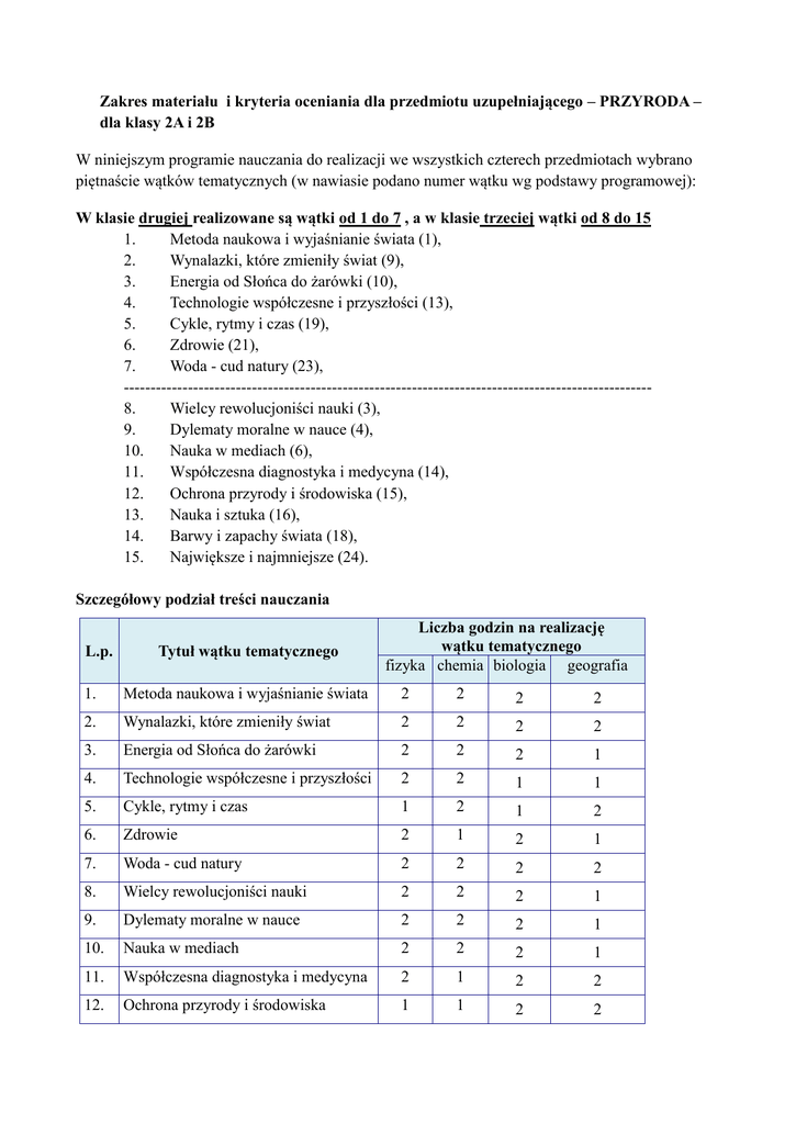 Zakres materiału i kryteria oceniania dla przedmiotu uzupełniającego – PRZYRODA – dla klasy 2A i 2B W niniejszym programie nauczania do realizacji we wszystkich czterech przedmiotach wybrano piętnaście wątków tematycznych (w nawiasie podano numer wątku wg podstawy programowej): W klasie drugiej realizowane są wątki od 1 do 7 , a w klasie trzeciej wątki od 8 do 15 1. Metoda naukowa i wyjaśnianie świata (1), 2. Wynalazki, które zmieniły świat (9), 3. Energia od Słońca do żarówki (10), 4. Technologie współczesne i przyszłości (13), 5. Cykle, rytmy i czas (19), 6. Zdrowie (21), 7. Woda - cud natury (23), --------------------------------------------------------------------------------------------------8. Wielcy rewolucjoniści nauki (3), 9. Dylematy moralne w nauce (4), 10. Nauka w mediach (6), 11. Współczesna diagnostyka i medycyna (14), 12. Ochrona przyrody i środowiska (15), 13. Nauka i sztuka (16), 14. Barwy i zapachy świata (18), 15. Największe i najmniejsze (24). Szczegółowy podział treści nauczania L.p. Tytuł wątku tematycznego Liczba godzin na realizację wątku tematycznego fizyka chemia biologia geografia 1. Metoda naukowa i wyjaśnianie świata 2 2 2 2 2. Wynalazki, które zmieniły świat 2 2 2 2 3. Energia od Słońca do żarówki 2 2 2 1 4. Technologie współczesne i przyszłości 2 2 1 1 5. Cykle, rytmy i czas 1 2 1 2 6. Zdrowie 2 1 2 1 7. Woda - cud natury 2 2 2 2 8. Wielcy rewolucjoniści nauki 2 2 2 1 9. Dylematy moralne w nauce 2 2 2 1 10. Nauka w mediach 2 2 2 1 11. Współczesna diagnostyka i medycyna 2 1 2 2 12. Ochrona przyrody i środowiska 1 1 2 2 13. Nauka i sztuka 2 2 1 1 14. Barwy i zapachy świata 2 2 2 1 15. Największe i najmniejsze 1 2 2 Utrwalanie i sprawdzanie wiadomości 3 3 1 4 30 30 30 Razem: 4 30 Zakres materiału dla klasy drugiej Wątek 1 – Metoda naukowa i wyjaśnienie świata FIZYKA Widzę, doświadczam, więc rozumiem. CHEMIA Jak działa nauka, czyli co to jest metoda naukowa?; Eksperyment jako sposób zdobywania wiedzy o świecie. BIOLOGIA Metoda naukowa pozwala zrozumieć świat.; W stronę teorii naukowej. GEOGRAFIA Teoria powstania i ewolucji wszechświata.; Układ słoneczny - co czeka go w przyszłości? Wątek 2- Wynalazki które zmieniły świat FIZYKA Telegraf, telefon, radio – co jeszcze przed nami; Od torbinu Herona z Aleksandrii do wysokowydajnych silników elektrycznych i cieplnych. CHEMIA Metale, szkło, ceramika, papier. ; Środki czystości, leki włókna i tworzywa sztuczne, materiały wybuchowe. BIOLOGIA Pierwszy mikroskop i rozwój technik mikroskopowych, pierwsze szczepionki. ;Od antybiotyków po łańcuchową reakcję polimerazy. GEOGRAFIA Wynalazki, które zmieniły świat (odkrycia i ich znaczenie gospodarcze i społeczne).; GPS – rewolucja w nawigacji. Wątek 3 – Energia od słońca do żaróki FIZYKA Czy słowo światło zawsze oznacza to samo? CHEMIA Reakcje chemiczne jako sposób pozyskiwania energii. ; Tradycyjne i nowoczesne źródła światła okiem chemika. BIOLOGIA Fotosynteza i oddychanie.; Energia w ekosystemie. GEOGRAFIA Odnawialne i nieodnawialne źródła energii.; Czy energia słoneczna stanie się rozwiązaniem problemów energetycznych na ziemi? Wątek 4 – Technologie współczesne i przyszłości FIZYKA Wizje czyli jak nauka zmieni się w XXI wieku. CHEMIA Polimery przewodzące i świecące. ; "Nano-" w chemii. BIOLOGIA Technologie współczesne i przyszłości (biopolimery, biodegradowalność, mikromacierze DNA). GEOGRAFIA Przemysł zaawansowanej technologii high -tech. Wątek 5 – Cykle rytmy i czas FIZYKA Czy naprawdę żyjemy coraz szybciej? CHEMIA Od czego zależy szybkość reakcji chemicznej?; Czy zawsze warto przyspieszać reakcje chemiczne – kataliza i korozja. BIOLOGIA Cykle, rytmy i czas (rytm okołodobowy, cykliczne zjawiska biologiczne, fotoperiodyzm roślin). GEOGRAFIA Pory roku a krajobrazy. ; Cykle geograficzne i geologiczne. Wątek 6 – Zdrowie FIZYKA Komfort cieplny. ; Kręgosłup jako układ biomechaniczny. CHEMIA Chemia zdrowia. BIOLOGIA Stan zdrowia, czynniki wpływające na zdrowie.; Choroba jako zakłócenie homeostazy. GEOGRAFIA Zagrożenia cywilizacyjne. ; Co każdy turysta wiedzieć powinien wyjeżdżając do dalekich państw? Wątek 7 – Woda – cud natury FIZYKA Woda - cud natury. CHEMIA Budowa cząsteczki wody i jej właściwości.; Roztwory wodne i ich właściwości. BIOLOGIA Woda jako środowisko życia. ; Woda w organizmie. GEOGRAFIA Zasoby wody na ziemi a potrzeby człowieka. Racjonalne gospodarowanie wodą wyzwaniem dla każdego. Kryteria wymagań Poziom podstawowy obejmuje wymagania konieczne i podstawowe, a poziom ponadpodstawowy wymagania rozszerzające i dopełniające. Wymagania konieczne (K) obejmują wiadomości i umiejętności, których opanowanie pozwoli uczniowi kontynuować naukę na danym poziomie nauczania. Wymaganiom koniecznym odpowiadają cele kategorii A (uczeń wie). Uczeń zapamiętuje i odtwarza wiadomości (definiuje, wymienia, nazywa), opisuje działania (ale niekoniecznie je wykonuje). Uczeń, który spełnia te wymagania, uzyskuje ocenę dopuszczającą. Wymagania podstawowe (P) obejmują wiadomości i umiejętności, które są stosunkowo łatwe do opanowania, użyteczne w życiu codziennym i konieczne do kontynuowania nauki. Wymaganiom podstawowym odpowiadają cele kategorii B (uczeń rozumie). Uczeń rozumie wiadomości (wyjaśnia, streszcza, rozróżnia), odtwarzania działania. Uczeń, który spełnia wymagania konieczne i podstawowe, uzyskuje ocenę dostateczną. Wymagania rozszerzające (R) obejmują wiadomości o średnim poziomie trudności, a ich przyswojenie nie jest niezbędne do kontynuowania nauki. Mogą one, ale nie muszą być użyteczne w życiu codziennym. Są pogłębione i rozszerzone w stosunku do wymagań podstawowych. Wymaganiom rozszerzonym odpowiadają cele kategorii C (uczeń stosuje wiadomości). Uczeń wykorzystuje wiadomości i umiejętności w sytuacjach typowych (r