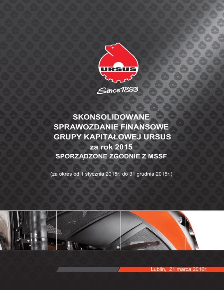 SKONSOLIDOWANE SPRAWOZDANIE FINANSOWE GRUPY KAPITAŁOWEJ URSUS za rok 2015 SPORZĄDZONE ZGODNIE Z MSSF (za okres od 1 stycznia 2015r. do 31 grudnia 2015r.) Lublin, 21 marca 2016r. Skonsolidowane Sprawozdanie Finansowe Grupy Kapitałowej URSUS za 2015 rok SPIS TREŚCI 1. SKONSOLIDOWANE SPRAWOZDANIE Z CAŁKOWITYCH DOCHODÓW ..................... 4 2. SKONSOLIDOWANE SPRAWOZDANIE Z SYTUACJI FINANSOWEJ ........................... 5 3. SKONSOLIDOWANE SPRAWOZDANIE Z PRZEPŁYWÓW PIENIĘŻNYCH ................... 7 4. SKONSOLIDOWANE SPRAWOZDANIE ZE ZMIAN W KAPITALE WŁASNYM .............. 8 5. INFORMACJE OGÓLNE ........................................................................................... 8 6. SKŁAD GRUPY........................................................................................................ 9 7. SKŁAD ZARZĄDU I RADY NADZORCZEJ ................................................................ 10 8. ZATWIERDZENIE SPRAWOZDANIA FINANSOWEGO ............................................. 11 9. PODSTAWA SPORZĄDZENIA ROCZNEGO SPRAWOZDANIA FINANSOWEGO ......... 11 10. OŚWIADCZENIE O ZGODNOŚCI ........................................................................... 11 11. WALUTA POMIARU I WALUTA SPRAWOZDAŃ FINANSOWYCH ............................. 11 12. DOBROWOLNA ZMIANA ZASAD RACHUNKOWOŚCI .............................................. 11 13. KOREKTA BŁĘDU.................................................................................................. 11 14. NOWE STANDARDY I INTERPRETACJE ................................................................. 12 15. ISTOTNE WARTOŚCI OPARTE NA PROFESJONALNYM OSĄDZIE I SZACUNKACH .. 16 16. ISTOTNE ZASADY RACHUNKOWOŚCI .................................................................. 16 17. INFORMACJE DOTYCZĄCE SEGMENTÓW OPERACYJNYCH .................................... 24 18. PRZYCHODY I KOSZTY......................................................................................... 28 19. PODATEK DOCHODOWY ....................................................................................... 34 20. MAJĄTEK SOCJALNY ORAZ ZOBOWIĄZANIA ZFŚS ............................................... 37 21. ZYSK PRZYPADAJĄCY NA JEDNĄ AKCJĘ............................................................... 37 22. DYWIDENDY WYPŁACONE I ZAPROPONOWANE DO WYPŁATY............................. 39 23. RZECZOWE AKTYWA TRWAŁE .............................................................................. 39 24. NIERUCHOMOŚCI INWESTYCYJNE ....................................................................... 42 25. WARTOŚCI NIEMATERIALNE ............................................................................... 44 26. POŁĄCZENIA JEDNOSTEK GOSPODARCZYCH ....................................................... 47 27. INWESTYCJE W JEDNOSTKACH STOWARZYSZONYCH WYCENIANYCH METODĄ PRAW WŁASNOŚCI ........................................................................................................ 47 28. AKTYWA FINANSOWE DOSTĘPNE DO SPRZEDAŻY ORAZ POZOSTAŁE AKTYWA FINANSOWE ........................................................................................................ 47 29. ZAPASY ............................................................................................................... 48 Strona 2 z 72 Skonsolidowane Sprawozdanie Finansowe Grupy Kapitałowej URSUS za 2015 rok 30. NALEŻNOŚCI Z TYTUŁU DOSTAW I USŁUG ORAZ POZOSTAŁE NALEŻNOŚCI ........ 49 31. ŚRODKI PIENIĘŻNE I ICH EKWIWALENTY........................................................... 50 32. KAPITAŁ ZAKŁADOWY I POZOSTAŁE KAPITAŁY .................................................. 50 33. UDZIAŁY MNIEJSZOŚCI ....................................................................................... 52 34. REZERWY ............................................................................................................ 53 35. ŚWIADCZENIA PRACOWNICZE ............................................................................ 53 36. OPROCENTOWANE KREDYTY BANKOWE I POŻYCZKI ........................................... 54 37. ZOBOWIĄZANIA Z TYTUŁU DOSTAW I USŁUG ORAZ POZOSTAŁE ZOBOWIĄZANIA58 38. ZOBOWIĄZANIA I NALEŻNOŚCI WARUNKOWE .................................................... 59 39. INFORMACJE O PODMIOTACH POWIĄZANYCH .................................................... 60 40. WYNAGRODZENIE WYŻSZEJ KADRY KIEROWNICZEJ GRUPY ............................... 61 41. CELE I ZASADY ZARZĄDZANIA RYZYKIEM FINANSOWYM .................................... 62 42. ZARZĄDZANIE KAPITAŁEM .................................................................................. 68 43. INSTRUMENTY FINANSOWE ................................................................................ 69 44. PRZYCZYNY WYSTĘPOWANIA RÓŻNIC POMIĘDZY BILANSOWYMI ZMIANAMI NIEKTÓRYCH POZYCJI ORAZ ZMIANAMI WYNIKAJĄCYMI Z RACHUNKU PRZEPŁYWÓW PIENIĘŻNYCH. ..................................................................................................... 71 45. STRUKTURA ZATRUDNIENIA ............................................................................... 72 46. ZDARZENIA NASTĘPUJĄCE PO DNIU BILANSOWYM ............................................ 72 Strona 3 z 72 Skonsolidowane Sprawozdanie Finansowe Grupy Kapitałowej URSUS za 2015 rok 1. SKONSOLIDOWANE SPRAWOZDANIE Z CAŁKOWITYCH DOCHODÓW za okres 12 miesięcy zakończony dnia 31 grudnia 2015 roku ( w tys. zł.) Nota okres zakończony 31.12.2015 okres zakończony 31.12.2014 w tys. PLN w tys. PLN Działalność kontynuowana Przychody ze sprzedaży 18 324 427 236 204 Koszt własny sprzedaży 18 (255 412) (193 235) 69 015 42 969 Zysk (strata) brutto ze sprzedaży Koszty sprzedaży 18 (32 097) (9 730) Koszty ogólnego zarządu 18 (21 377) (17 282) Pozostałe przychody operacyjne 18 1 076 1 838 Aktualizacja nieruchomości inwestycyjnych 18 2 592 4 034 Pozostałe koszty operacyjne 18 (3 106) (3 975) 16 