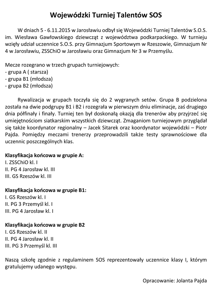Wojewódzki Turniej Talentów SOS W dniach 5 - 6.11.2015 w Jarosławiu odbył się Wojewódzki Turniej Talentów S.O.S. im. Wiesława Gawłowskiego dziewcząt z województwa podkarpackiego. W turnieju wzięły udział uczennice S.O.S. przy Gimnazjum Sportowym w Rzeszowie, Gimnazjum Nr 4 w Jarosławiu, ZSSChiO w Jarosławiu oraz Gimnazjum Nr 3 w Przemyślu. Mecze rozegrano w trzech grupach turniejowych: - grupa A ( starsza) - grupa B1 (młodsza) - grupa B2 (młodsza) Rywalizacja w grupach toczyła się do 2 wygranych setów. Grupa B podzielona została na dwie podgrupy B1 i B2 i rozegrała w pierwszym dniu eliminacje, zaś drugiego dnia półfinały i finały. Turniej ten był doskonałą okazją dla trenerów aby przyjrzeć się umiejętnościom siatkarskim wszystkich dziewcząt. Zmaganiom turniejowym przyglądał się także koordynator regionalny – Jacek Sitarek oraz koordynator wojewódzki – Piotr Pajda. Pomiędzy meczami trenerzy przeprowadzili także testy sprawnościowe dla uczennic poszczególnych klas. Klasyfikacja końcowa w grupie A: I. ZSSChiO kl. I II. PG 4 Jarosław kl. III III. GS Rzeszów kl. III Klasyfikacja końcowa w grupie B1: I. GS Rzeszów kl. I II. PG 3 Przemyśl kl. I III. PG 4 Jarosław kl. I Klasyfikacja końcowa w grupie B2 I. GS Rzeszów kl. II II. PG 4 Jarosław kl. II III. PG 3 Przemyśl kl. III Naszą szkołę zgodnie z regulaminem SOS reprezentowały uczennice klasy I, którym gratulujemy udanego występu. Opracowanie: Jolanta Pajda