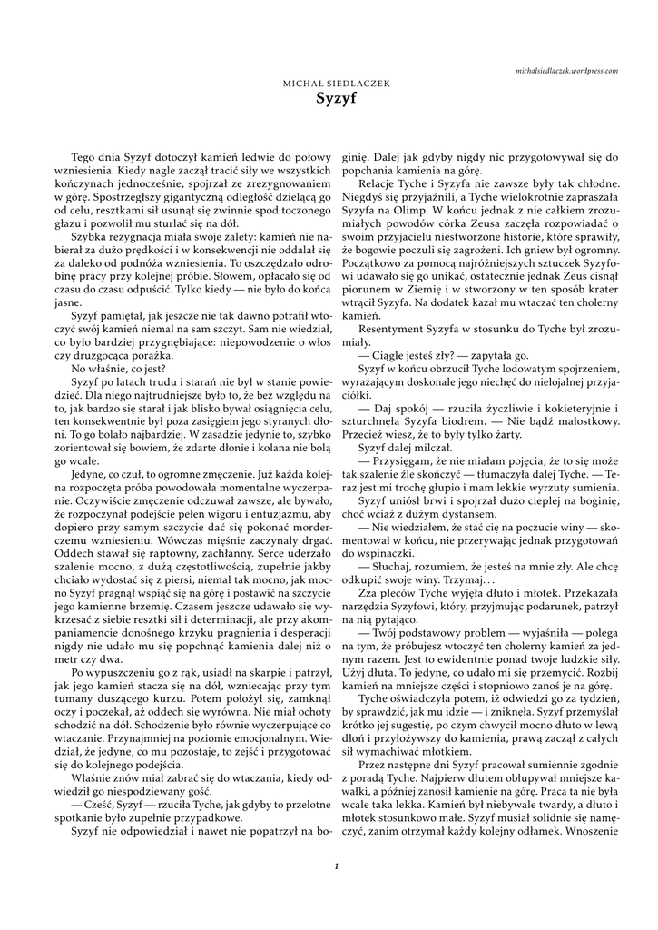 michalsiedlaczek.wordpress.com M I C H A Ł S I E D L AC Z E K Syzyf Tego dnia Syzyf dotoczył kamień ledwie do połowy wzniesienia. Kiedy nagle zaczął tracić siły we wszystkich kończynach jednocześnie, spojrzał ze zrezygnowaniem w górę. Spostrzegłszy gigantyczną odległość dzielącą go od celu, resztkami sił usunął się zwinnie spod toczonego głazu i pozwolił mu sturlać się na dół. Szybka rezygnacja miała swoje zalety: kamień nie nabierał za dużo prędkości i w konsekwencji nie oddalał się za daleko od podnóża wzniesienia. To oszczędzało odrobinę pracy przy kolejnej próbie. Słowem, opłacało się od czasu do czasu odpuścić. Tylko kiedy — nie było do końca jasne. Syzyf pamiętał, jak jeszcze nie tak dawno potrafił wtoczyć swój kamień niemal na sam szczyt. Sam nie wiedział, co było bardziej przygnębiające: niepowodzenie o włos czy druzgocąca porażka. No właśnie, co jest? Syzyf po latach trudu i starań nie był w stanie powiedzieć. Dla niego najtrudniejsze było to, że bez względu na to, jak bardzo się starał i jak blisko bywał osiągnięcia celu, ten konsekwentnie był poza zasięgiem jego styranych dłoni. To go bolało najbardziej. W zasadzie jedynie to, szybko zorientował się bowiem, że zdarte dłonie i kolana nie bolą go wcale. Jedyne, co czuł, to ogromne zmęczenie. Już każda kolejna rozpoczęta próba powodowała momentalne wyczerpanie. Oczywiście zmęczenie odczuwał zawsze, ale bywało, że rozpoczynał podejście pełen wigoru i entuzjazmu, aby dopiero przy samym szczycie dać się pokonać morderczemu wzniesieniu. Wówczas mięśnie zaczynały drgać. Oddech stawał się raptowny, zachłanny. Serce uderzało szalenie mocno, z dużą częstotliwością, zupełnie jakby chciało wydostać się z piersi, niemal tak mocno, jak mocno Syzyf pragnął wspiąć się na górę i postawić na szczycie jego kamienne brzemię. Czasem jeszcze udawało się wykrzesać z siebie resztki sił i determinacji, ale przy akompaniamencie donośnego krzyku pragnienia i desperacji nigdy nie udało mu się popchnąć kamienia dalej niż o metr czy dwa. Po wypuszczeniu go z rąk, usiadł na skarpie i patrzył, jak jego kamień stacza się na dół, wzniecając przy tym tumany duszącego kurzu. Potem położył się, zamknął oczy i poczekał, aż oddech się wyrówna. Nie miał ochoty schodzić na dół. Schodzenie było równie wyczerpujące co wtaczanie. Przynajmniej na poziomie emocjonalnym. Wiedział, że jedyne, co mu pozostaje, to zejść i przygotować się do kolejnego podejścia. Właśnie znów miał zabrać się do wtaczania, kiedy odwiedził go niespodziewany gość. — Cześć, Syzyf — rzuciła Tyche, jak gdyby to przelotne spotkanie było zupełnie przypadkowe. Syzyf nie odpowiedział i nawet nie popatrzył na bo- ginię. Dalej jak gdyby nigdy nic przygotowywał się do popchania kamienia na górę. Relacje Tyche i Syzyfa nie zawsze były tak chłodne. Niegdyś się przyjaźnili, a Tyche wielokrotnie zapraszała Syzyfa na Olimp. W końcu jednak z nie całkiem zrozumiałych powodów córka Zeusa zaczęła rozpowiadać o swoim przyjacielu niestworzone historie, które sprawiły, że bogowie poczuli się zagrożeni. Ich gniew był ogromny. Początkowo za pomocą najróżniejszych sztuczek Syzyfowi udawało się go unikać, ostatecznie jednak Zeus cisnął piorunem w Ziemię i w stworzony w ten sposób krater wtrącił Syzyfa. Na dodatek kazał mu wtaczać ten cholerny kamień. Resentyment Syzyfa w stosunku do Tyche był zrozumiały. — Ciągle jesteś zły? — zapytała go. Syzyf w końcu obrzucił Tyche lodowatym spojrzeniem, wyrażającym doskonale jego niechęć do nielojalnej przyjaciółki. — Daj spokój — rzuciła życzliwie i kokieteryjnie i szturchnęła Syzyfa biodrem. — Nie bądź małostkowy. Przecież wiesz, że to były tylko żarty. Syzyf dalej milczał. — Przysięgam, że nie miałam pojęcia, że to się może tak szalenie źle skończyć — tłumaczyła dalej Tyche. — Teraz jest mi trochę głupio i mam lekkie wyrzuty sumienia. Syzyf uniósł brwi i spojrzał dużo cieplej na boginię, choć wciąż z dużym dystansem. — Nie wiedziałem, że stać cię na poczucie winy — skomentował w końcu, nie przerywając jednak przygotowań do wspinaczki. — Słuchaj, rozumiem, że jesteś na mnie zły. Ale chcę odkupić swoje winy. Trzymaj. . . Zza pleców Tyche wyjęła dłuto i młotek. Przekazała narzędzia Syzyfowi, który, przyjmując podarunek, patrzył na nią pytająco. — Twój podstawowy problem — wyjaśniła — polega na tym, że próbujesz wtoczyć ten cholerny kamień za jednym razem. Jest to ewidentnie ponad twoje ludzkie siły. Użyj dłuta. To jedyne, co udało mi się przemycić. Rozbij kamień na mniejsze części i stopniowo zanoś je na górę. Tyche oświadczyła potem, iż odwiedzi go za tydzień, by sprawdzić, jak mu idzie — i zniknęła. Syzyf przemyślał krótko jej sugestię, po czym chwycił mocno dłuto w lewą dłoń i przyłożywszy do kamienia, prawą zaczął z całych sił wymachiwać młotkiem. Przez następne dni Syzyf pracował sumiennie zgodnie z poradą Tyche. Najpierw dłutem obłupywał mniejsze kawałki, a później zanosił kamienie na górę. Praca ta nie była wcale taka lekka. Kamień był niebywale twardy, a dłuto i młotek stosunkowo małe. Syzyf musiał solidnie się namęczyć, zanim otrzymał każdy kolejny odłamek. Wnoszenie 1 ich na górę nie stanowiło najmniejszego problemu, ale już po kilku dniach palce miał tak mocno pokaleczone i potłuczone, że nie potrafił utrzymać dłuta w dłoni. Próbował zamienić ręce, ale lewą trafiał w dłuto tak nieudolnie, że prędko obił prawą dłoń równie boleśnie. Na dzień przed zapowiedzianą wizytą Tyche Syzyf poszedł na górę, aby przyjrzeć się efektom swojej pracy. Kupka gruzu wyraźnie urosła, na oko udało mu się przetransportować jakąś ćwierć objętości kami