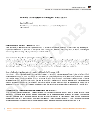 nr 3 /2013 ISSN 2299‐565X nr 3 /2013 ISSN 2299‐565X nr 3 /2013 ISSN 2299‐565X nr 1 (10)/2012 ISSN 1507‐7188 Nowości w Bibliotece Głównej UP w Krakowie Gabriela Meinardi 01 3 Biblioteka Instytutu Neofilologii – Sekcja Romańska. Uniwersytet Pedagogiczny im. KEN w Krakowie Bi E nr 3/ 2 Gmiterek Grzegorz, Biblioteka 2.0, Warszawa, 2012. Autor pokazuje jak biblioteka może współuczestniczyć w tworzeniu sieciowych zasobów, współdzieleniu się informacjami i współodpowiedzialności za powstałe w ten sposób treści. Poznajemy „Bibliotekę 2.0” korzystającą z blogów, mikroblogów, serwisów typu bookmarking i wiki, czy wirtualnego świata Second Life. Jasiewicz Justyna, Kompetencje informacyjne młodzieży, Warszawa, 2012. Autorka wprowadza czytelnika w świat nowych technologii i korzystania z nich w różnych krajach, przede wszystkim europejskich, zarówno przez młodzież, jak i dorosłych. Podkreśla jaki wpływ mają nowe media na młode pokolenie, na ich stosunek do Internetu oraz jak zmieniają się potrzeby korzystania z tych środków. Książka przybliża też edukację informacyjną nie tylko w Polsce, ale również innych krajach (Niemcy, Wielka Brytania) oraz przedstawia analizę tamtejszych programów nauczania. Kurkowska Ewa Jadwiga, Edukacja informacyjna w bibliotekach, Warszawa, 2012. Przedmiotem publikacji jest edukacja informacyjna umieszczona w kontekście rozwoju społeczeństwa wiedzy. Autorka wnikliwie przygląda się rozwojowi tej nowo powstającej formacji społecznej i zjawisku kształtowania kompetencji informacyjnych. Edukacja informacyjna została potraktowana jako element konieczny nie tylko do realizowania kształcenia ustawicznego, ale zwłaszcza, samokształcenia. Esej pokazuje information literacy w kontekście współczesnych trendów edukacyjnych (samokształcenie, edukacja ustawiczna, kształcenie na odległość) oraz aktywności organizacji bibliotekarskich. W poszukiwaniu standardów w zakresie prowadzenia edukacji informacyjnej autorka przegląda również międzynarodowe dokumenty i standardy innych krajów. Piotrowska Renata, Edukacja informacyjna w polskiej szkole, Warszawa, 2011. Treść książki to zagadnienia związane z edukacją informacyjną (information literacy). Autorka stara się ustalić, w jakim stopniu poddawany reformom polski system oświaty dostosowuje się do ogólnoświatowych tendencji kształcenia użytkowników informacji. Opierając się na dokumentach oraz analizie podręczników ukazała, w jakim stopniu treści różnych przedmiotów uwzględniają konieczność przygotowania uczniów do poszukiwania i wykorzystywania informacji. Zwraca też uwagę na miejsce, jakie w procesie edukacji informacyjnej przypadło bibliotekarzowi i bibliotece szkolnej na przestrzeni ostatnich 30 lat. 1 Nowości w Bibliotece Głównej UP w Krakowie, Gabriela Meinardi, Biblioteka Instytutu Neofilologii – Sekcja Romańska. Uniwersytet Pedagogiczny im. KEN w Krakowie