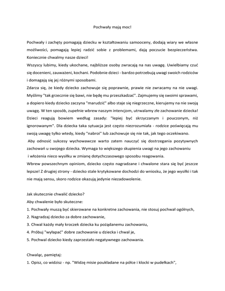 Pochwały mają moc! Pochwały i zachęty pomagają dziecku w kształtowaniu samooceny, dodają wiary we własne możliwości, pomagają lepiej radzić sobie z problemami, dają poczucie bezpieczeństwa. Koniecznie chwalmy nasze dzieci! Wszyscy lubimy, kiedy ukochane, najbliższe osoby zwracają na nas uwagę. Uwielbiamy czuć się docenieni, zauważeni, kochani. Podobnie dzieci - bardzo potrzebują uwagi swoich rodziców i domagają się jej różnymi sposobami. Zdarza się, że kiedy dziecko zachowuje się poprawnie, prawie nie zwracamy na nie uwagi. Myślimy "tak grzecznie się bawi, nie będę mu przeszkadzać". Zajmujemy się swoimi sprawami, a dopiero kiedy dziecko zaczyna "marudzić" albo staje się niegrzeczne, kierujemy na nie swoją uwagę. W ten sposób, zupełnie wbrew naszym intencjom, utrwalamy złe zachowanie dziecka! Dzieci reagują bowiem według zasady: "lepiej być skrzyczanym i pouczonym, niż ignorowanym". Dla dziecka taka sytuacja jest często niezrozumiała - rodzice poświęcają mu swoją uwagę tylko wtedy, kiedy "nabroi" lub zachowuje się nie tak, jak tego oczekiwano. Aby odnosić sukcesy wychowawcze warto zatem nauczyć się dostrzegania pozytywnych zachowań u swojego dziecka. Wymaga to większego skupienia uwagi na jego zachowaniu i włożenia nieco wysiłku w zmianę dotychczasowego sposobu reagowania. Wbrew powszechnym opiniom, dziecko często nagradzane i chwalone stara się być jeszcze lepsze! Z drugiej strony - dziecko stale krytykowane dochodzi do wniosku, że jego wysiłki i tak nie mają sensu, skoro rodzice okazują jedynie niezadowolenie. Jak skutecznie chwalić dziecko? Aby chwalenie było skuteczne: 1. Pochwały muszą być skierowane na konkretne zachowania, nie stosuj pochwał ogólnych, 2. Nagradzaj dziecko za dobre zachowanie, 3. Chwal każdy mały kroczek dziecka ku pożądanemu zachowaniu, 4. Próbuj "wyłapać" dobre zachowanie u dziecka i chwal je, 5. Pochwal dziecko kiedy zaprzestało negatywnego zachowania. Chwaląc, pamiętaj: 1. Opisz, co widzisz - np. "Widzę misie poukładane na półce i klocki w pudełkach", 2. Opisz, co czujesz - np. "Przyjemnie jest wejść do twojego pokoju i zobaczyć porządek", 3. Podsumuj godne pochwały zachowanie dziecka - np. "Cieszę się, że potrafisz sam uporządkować swoje zabawki". Pułapki i szanse dobrej pochwały: • Gdy oceniamy zachowanie lub twórczość dziecka mówiąc "ładnie, ślicznie, pięknie" dziecko nie wie co tak naprawdę nam się podoba. Ważne, żeby nasza pochwała była opisowa i szczegółowa, a nie ogólna. Dzięki temu dziecko zobaczy, że jesteśmy naprawdę nim zainteresowani. • Unikaj takiej pochwały, w której ukryte jest przypomnienie wcześniejszego niepowodzenia dziecka - np. "No widzisz - jak chcesz, to potrafisz", • Rujnuje naszą pochwałę wyraz "ale" - np. "Cieszę się, że posprzątałeś swój pokój, ale szkoda, że ubrania nadal leżą na krześle", • Lepiej unikać komunikatów "Jestem z ciebie taka dumna", powiedzmy raczej: "Możesz być z siebie dumny" - dziecko wtedy nabiera pewności siebie. Literatura: Faber A., Mazlish E. (2001), "Jak mówić, żeby dzieci nas słuchały jak słuchać żeby dzieci do nas mówiły”, Media Rodzina. Gordon T. (1991), "Wychowanie bez porażek”, Instytut Wydawniczy PAX. Sakowska J. (1999), "Szkoła dla rodziców i wychowawców”, Centrum Metodyczne Pomocy Psychologiczno-Pedagogicznej Ministerstwa Edukacji Narodowej. Autorka: Marlena Trąbińska-Haduch Artykuł pochodzi z sewisu www.dobryrodzic.fdn.pl