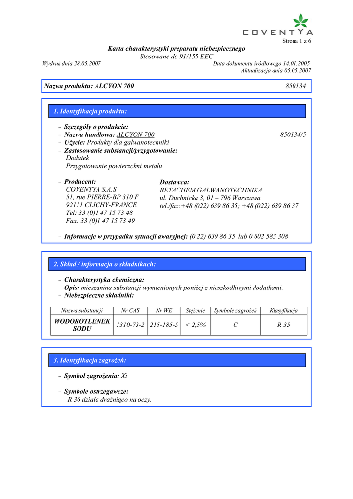 Strona 1 z 6 Karta charakterystyki preparatu niebezpiecznego Stosowane do 91/155 EEC Wydruk dnia 28.05.2007 Data dokumentu źródłowego 14.01.2005 Aktualizacja dnia 05.05.2007 Nazwa produktu: ALCYON 700 850134 1. Identyfikacja produktu: − − − − Szczegóły o produkcie: Nazwa handlowa: ALCYON 700 Użycie: Produkty dla galwanotechniki Zastosowanie substancji/przygotowanie: Dodatek Przygotowanie powierzchni metalu − Producent: COVENTYA S.A.S 51, rue PIERRE-BP 310 F 92111 CLICHY-FRANCE Tel: 33 (0)1 47 15 73 48 Fax: 33 (0)1 47 15 73 49 850134/5 Dostawca: BETACHEM GALWANOTECHNIKA ul. Duchnicka 3, 01 – 796 Warszawa tel./fax:+48 (022) 639 86 35; +48 (022) 639 86 37 − Informacje w przypadku sytuacji awaryjnej: (0 22) 639 86 35 lub 0 602 583 308 2. Skład / informacja o składnikach: − Charakterystyka chemiczna: − Opis: mieszanina substancji wymienionych poniżej z nieszkodliwymi dodatkami. − Niebezpieczne składniki: Nazwa substancji Nr CAS Nr WE WODOROTLENEK 1310-73-2 215-185-5 SODU 3. Identyfikacja zagrożeń: − Symbol zagrożenia: Xi − Symbole ostrzegawcze: R 36 działa drażniąco na oczy. Stężenie Symbole zagrożeń Klasyfikacja < 2,5% C R 35 Strona 2 z 6 Karta charakterystyki preparatu niebezpiecznego Stosowane do 91/155 EEC Wydruk dnia 28.05.2007 Data dokumentu źródłowego 14.01.2005 Aktualizacja dnia 05.05.2007 Nazwa produktu: ALCYON 700 850134 4. Pierwsza pomoc: − W przypadku zanieczyszczenia odzieży: natychmiast zdjąć zanieczyszczoną odzież. − W przypadku połknięcia: w przypadku złego samopoczucia skontaktować się z lekarzem. − W przypadku dostania się do oka: płukać oko pod bieżąca wodą przez kilka minut, w razie problemów wezwać lekarza. − W przypadku kontaktu ze skórą: generalnie produkt nie powoduje podrażnień. − W przypadku inhalacji: w przypadku utraty przytomności ułożyć poszkodowanego w bocznej pozycji do transportu. Informacja dla lekarza: czerwona wysypka. 5. Postępowanie w przypadku pożaru: − Odpowiednie środki gaśnicze: CO2, proszek gaśniczy lub natryskiem wody. Większy pożar gasić natryskiem wody lub pianą gaśniczą odporną na działanie alkoholu. − Szczególne zagrożenia: formowanie się toksycznych gazów podczas nagrzania lub pożaru. − Środki ochrony indywidualnej dla strażaków: aparat oddechowy. − Inne informacje: chłodzić zbiorniki znajdujące się w pobliżu przez spryskiwanie dużą ilością wody. 6. Postępowanie w przypadku uwolnienia do środowiska: − Osobiste środki ostrożności: zapewnić dobrą wentylację; założyć ubranie ochronne. Ewakuować z obszaru zagrożenia personel nieuczestniczący w akcji ratowniczej. − Metody oczyszczania: zaabsorbować przy pomocy piasku, trocin lub ziemi. − Ekologiczne środki ostrożności: rozcieńczyć dużą ilością wody. − Inne informacje: brak. 7. Obchodzenie się z preparatem i przechowywanie: − Postępowanie z preparatem: chronić przed nagrzaniem. − Przechowywanie: magazynować w chłodnym miejscu w szczelnie zamkniętych pojemnikach z dala od kwasów. Strona 3 z 6 Karta charakterystyki preparatu niebezpiecznego Stosowane do 91/155 EEC Wydruk dnia 28.05.2007 Data dokumentu źródłowego 14.01.2005 Aktualizacja dnia 05.05.2007 Nazwa produktu: ALCYON 700 850134 8. Kontrola narażenia i środki ochrony indywidualnej: − Standardy narażenia w miejscu pracy: 106-89-8 1-chloro-2,3-epoksypropan NDS 1mg/m3 − Ogólne zasady BHP: trzymać z dala od żywności i napojów. Natychmiast zdejmować poplamioną produktem odzież. Myć ręce w czasie przerw i na zakończenie pracy. Unikać kontaktu z oczami i skórą − Środki ochrony indywidualnej Ochrona dróg oddechowych: konieczna w przypadku niewystarczającej wentylacji w pomieszczeniach Ochrona rąk: rękawice ochronne Materiał rękawic: wybór odpowiednich rękawic zależy nie tylko od materiału, ale również od dalszych cech jakościowych wykonania i zmienia się od producenta do producenta. Czas penetracji materiału rękawic: dokładny czas przebicia powinien być wyznaczony przez producenta rękawic ochronnych i powinien być przestrzegany przez użytkownika. Ochrona oczu: szczelne okulary ochronne Ochrona ciała: pracować w odzieży ochronnej. 9. Właściwości fizykochemiczne: − − − − − − − − − − − − − − − Postać: płynna Zapach: charakterystyczny Barwa: ciemno-czerwona Temperatura wrzenia:> 105 ºC Temperatura topnienia: nieokreślona Punkt zapłonu: 101 ºC Samozapłon: brak Niebezpieczeństwo wybuchu: produkt nie jest wybuchowy. Prężność par w 20 ºC: 23hPa Gęstość w 20 ºC: 1,065 – 1,085 g/cm3 Rozpuszczalność w wodzie: całkowita Wartość pH w 20 ºC: 9 – 9,8 Skład roztworu: Rozpuszczalniki organiczne: 0,0 % Woda: 80,0 % Strona 4 z 6 Karta charakterystyki preparatu niebezpiecznego Stosowane do 91/155 EEC Wydruk dnia 28.05.2007 Data dokumentu źródłowego 14.01.2005 Aktualizacja dnia 05.05.2007 Nazwa produktu: ALCYON 700 850134 10. Stabilność i reaktywność: − Warunki, których należy unikać: rozkład nie występuje, jeśli produkt jest magazynowany i używany zgodnie z wymaganiami technicznymi. − Materiały, których należy unikać: nie są znane. − Niebezpieczne produkty rozkładu: tlenek węgla, związki chloru. 11. Informacje toksykologiczne: − Toksyczność ostra: − Pierwotne działanie drażniące: na skórę: nie działa drażniąco na skórę. na oczy: działa drażniąco na oczy. − Uczulenie: żadne działanie uczulające nie jest znane. − Dodatkowe informacje toksykologiczne: Produkt został sklasyfikowany jako wykazujący następujące zagrożenia wg ostatniego wydania wytycznych UE oraz Rozporządzenia MZ z dnia 29.10.2004r. (Dz.U.Nr.243, poz.2440) w sprawie kryteriów i sposobu klasyfikacji substancji i preparatów chemicznych: drażniący 12. Informacje ekologiczne: − Nie dopuścić do przedostania się dużych ilości produktu lub produktu nierozcieńczonego do wód grun