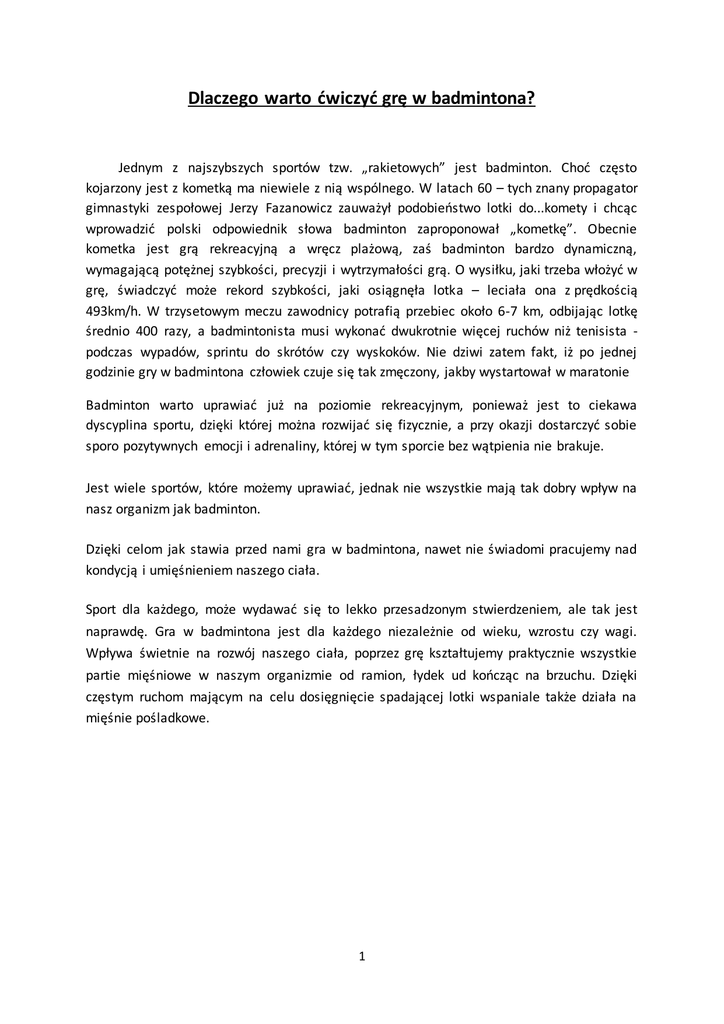 Dlaczego warto ćwiczyć grę w badmintona? Jednym z najszybszych sportów tzw. „rakietowych” jest badminton. Choć często kojarzony jest z kometką ma niewiele z nią wspólnego. W latach 60 – tych znany propagator gimnastyki zespołowej Jerzy Fazanowicz zauważył podobieństwo lotki do...komety i chcąc wprowadzić polski odpowiednik słowa badminton zaproponował „kometkę”. Obecnie kometka jest grą rekreacyjną a wręcz plażową, zaś badminton bardzo dynamiczną, wymagającą potężnej szybkości, precyzji i wytrzymałości grą. O wysiłku, jaki trzeba włożyć w grę, świadczyć może rekord szybkości, jaki osiągnęła lotka – leciała ona z prędkością 493km/h. W trzysetowym meczu zawodnicy potrafią przebiec około 6-7 km, odbijając lotkę średnio 400 razy, a badmintonista musi wykonać dwukrotnie więcej ruchów niż tenisista podczas wypadów, sprintu do skrótów czy wyskoków. Nie dziwi zatem fakt, iż po jednej godzinie gry w badmintona człowiek czuje się tak zmęczony, jakby wystartował w maratonie Badminton warto uprawiać już na poziomie rekreacyjnym, ponieważ jest to ciekawa dyscyplina sportu, dzięki której można rozwijać się fizycznie, a przy okazji dostarczyć sobie sporo pozytywnych emocji i adrenaliny, której w tym sporcie bez wątpienia nie brakuje. Jest wiele sportów, które możemy uprawiać, jednak nie wszystkie mają tak dobry wpływ na nasz organizm jak badminton. Dzięki celom jak stawia przed nami gra w badmintona, nawet nie świadomi pracujemy nad kondycją i umięśnieniem naszego ciała. Sport dla każdego, może wydawać się to lekko przesadzonym stwierdzeniem, ale tak jest naprawdę. Gra w badmintona jest dla każdego niezależnie od wieku, wzrostu czy wagi. Wpływa świetnie na rozwój naszego ciała, poprzez grę kształtujemy praktycznie wszystkie partie mięśniowe w naszym organizmie od ramion, łydek ud kończąc na brzuchu. Dzięki częstym ruchom mającym na celu dosięgnięcie spadającej lotki wspaniale także działa na mięśnie pośladkowe. 1 Badminton – nauczanie techniki gry Boisko do badmintona Przepis gry znajdziecie na stronie: http://www.badminton.com.pl/pzbad/home/przepisy/przepisy-gry Podstawy techniczne badmintona: Chwyt forhendowy rakietki Prawidłowy chwyt rakietki pozwala na dalsze doskonalenie techniki gry. Jednak dla początkujących może on w wielu wypadkach odbiegać od ich preferowanego sposobu trzymania rakietki. Należy trzymać rakietkę tak, aby była naturalnym przedłużeniem ręki. Najczęstsze błędy trzymania forhendowego: rakietka mocno skręcona w dłoni, po opuszczeniu ręki w dół rama i naciąg ustawione są równolegle do podłoża (trzymanie tzw. patelniowe); brak lekkiego "wysunięcia" rakietki z dłoni, umożliwiającego uzyskanie efektu naturalnego przedłużenia przedramienia szczególnie korzystnego przy odbiciach w głębokim wypadzie z prawej strony; brak odprowadzenia w przód palca wskazującego (trzymanie tzw, młotkowe); błędy typu: kurczowe lub zbyt lekkie trzymanie rakietki. 2 Serw Wykonując serw należy respektować przepisy. Zwrócić uwagę zwłaszcza na uderzanie lotki poniżej rękojeści, przy głowicy rakietki wyraźnie poniżej dłoni zagrywającego i nieodrywanie stóp od podłoża. Przy serwisie krótkim lotkę kierujemy jak najniżej siatki na przód pola serwisowego przeciwnika, w okolice linii krótkiego serwu, zaś przy serwisie długim, celem jest skierowanie lotki, zwykle jak najwyżej, tuż przed końcową linię końcową pola serwisowego przeciwnika. Najczęstszymi błędami wykonania serwu są: ustawienie tułowia przodem do siatki, stopy na jednej linii; zbyt wyraźne przeniesienie ciężaru ciała na nogę zakroczną; całkowity wyprost nóg w stawach kolanowych. Klir forhendowy Klir forhendowy jest jednym z najczęściej stosowanych odbić w badmintonie. Celem zagrania jest skierowanie lotki z głębi własnego kortu na tył pola przeciwnika. Dobre pod względem technicznym opanowanie tego uderzenia w dużym stopniu uzależnia dalszy postęp w opanowaniu innych, trudniejszych i bardziej złożonych elementów. Zawodnik, chcąc nadać lotce odpowiednią prędkość, musi uzyskać dużą szybkość rakietki w możliwie najkrótszym czasie. Najczęstszymi błędami wykonania kliru forhendwego są: nieprawidłowe trzymanie rakietki; ustawienie tułowia przodem do siatki; uderzenie lotki bez wykorzystania skrętu i pochylenie tułowia (odbicie lotki "samym ramieniem"); Smecz Smecz (ścięcie) to uderzenie typowo ofensywne, którego celem jest przechwycenie inicjatywy, jej utrzymanie lub zakończenie wymiany zagraniem nie do odebrania przez przeciwnika. Faza początkowa jest podobna jak w zagraniu kliru, różnica polega na kierunku zagrania lotki, różnicę obrazuje rysunek. Najczęstszymi błędami wykonania smeczu są: ustawienie tułowia przodem do siatki, stopy na jednej linii; w trakcie odprowadzania rakietki w tył (rozpoczęcie zamachu) obręcz rakietki wyprzedza nadgarstek i łokieć; 3 Skrót Skrót gra się przy siatce lub z głębi kortu. Celem jest takie odbicie lotki, by spadała tuż za siatką na pole przeciwnika, zmuszając go do niedokładnego odbioru albo wyrzutu lotki w górę umożliwiającego nasz atak, przede wszystkim smeczem. Drajw Płaskie, szybkie zagranie lotki z półkortu, najczęściej stosowane w grach podwójnych w c hwili walki o przechwycenie inicjatywy po krótkim serwie i płaskim returnie albo jako kontratak po niedokładnym zagraniu smeczu lub po prostu odpowiedź na drajw przeciwnika. Celem jest uniknięcie zagrania lotki w górę i przechwycenia inicjatywy przez przeciwnika. Najczęstszymi błędami wykonania drajwa są: uderzanie lotki zbyt późno, z boku zamiast przed sobą; duży zamach rakietką. Podział uderzeń Podziału uderzeń w badmintonie można dokonać według następujących kryteriów: 1. Miejsca boiska, z którego wykonywane jest uderzenie. Podstawowy podział to: prawy tyln