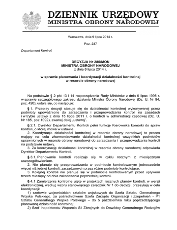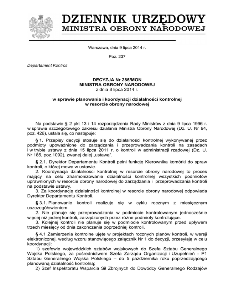 Warszawa, dnia 9 lipca 2014 r. Poz. 237 Departament Kontroli DECYZJA Nr 285/MON MINISTRA OBRONY NARODOWEJ z dnia 8 lipca 2014 r. w sprawie planowania i koordynacji działalności kontrolnej w resorcie obrony narodowej Na podstawie § 2 pkt 13 i 14 rozporządzenia Rady Ministrów z dnia 9 lipca 1996 r. w sprawie szczegółowego zakresu działania Ministra Obrony Narodowej (Dz. U. Nr 94, poz. 426), ustala się, co następuje: § 1. Przepisy decyzji stosuje się do działalności kontrolnej wykonywanej przez podmioty upoważnione do zarządzania i przeprowadzania kontroli na zasadach i w trybie ustawy z dnia 15 lipca 2011 r. o kontroli w administracji rządowej (Dz. U. Nr 185, poz.1092), zwanej dalej „ustawą”. § 2.1. Dyrektor Departamentu Kontroli pełni funkcję Kierownika komórki do spraw kontroli, o której mowa w ustawie. 2. Koordynacja działalności kontrolnej w resorcie obrony narodowej to proces mający na celu zharmonizowanie działalności kontrolnej wszystkich podmiotów uprawnionych w resorcie obrony narodowej do zarządzania i przeprowadzania kontroli na podstawie ustawy. 3. Za koordynację działalności kontrolnej w resorcie obrony narodowej odpowiada Dyrektor Departamentu Kontroli. § 3.1. Planowanie kontroli realizuje się w cyklu rocznym z miesięcznym uszczegółowieniem. 2. Nie planuje się przeprowadzania w podmiocie kontrolowanym jednocześnie więcej niż jednej kontroli, zarządzonych przez różne podmioty kontrolujące. 3. Kolejnej kontroli nie planuje się w podmiocie kontrolowanym przed upływem trzech miesięcy od dnia zakończenia poprzedniej kontroli. § 4.1 Zamierzenia kontrolne ujęte w projektach rocznych planów kontroli, w wersji elektronicznej, według wzoru stanowiącego załącznik Nr 1 do decyzji, przesyłają w celu koordynacji: 1) szefowie wojewódzkich sztabów wojskowych do Szefa Sztabu Generalnego Wojska Polskiego, za pośrednictwem Szefa Zarządu Organizacji i Uzupełnień - P1 Sztabu Generalnego Wojska Polskiego – do 5 października roku poprzedzającego planowaną działalność kontrolną; 2) Szef Inspektoratu Wsparcia Sił Zbrojnych do Dowódcy Generalnego Rodzajów Sił Zbrojnych – do 5 października roku poprzedzającego planowaną działalność kontrolną; 3) Szef Inspektoratu Wojskowej Służby Zdrowia do Szefa Sztabu Generalnego Wojska Polskiego – do 5 października roku poprzedzającego planowaną działalność kontrolną; 4) Szef Sztabu Generalnego Wojska Polskiego, Dowódca Generalny Rodzajów Sił Zbrojnych, Dowódca Operacyjny Rodzajów Sił Zbrojnych, Dowódca Garnizonu Warszawa oraz Komendant Główny Żandarmerii Wojskowej do Kierownika komórki do spraw kontroli – do 15 października roku poprzedzającego planowaną działalność kontrolną. 2. Kierownik komórki do spraw kontroli koordynuje przesłane zamierzenia kontrolne ujęte w projektach rocznych planów kontroli. § 5.1. Zamierzenia kontrolne do ujęcia w rocznym planie kontroli Ministra Obrony Narodowej przesyłają, według wzoru stanowiącego załącznik Nr 2 do decyzji: 1) dyrektorzy (szefowie) komórek (jednostek) organizacyjnych, w zależności od przyporządkowania (podporządkowania), odpowiednio do Sekretarza Stanu, Szefa Sztabu Generalnego Wojska Polskiego, podsekretarzy stanu lub Dyrektora Generalnego – do 5 października roku poprzedzającego planowaną działalność kontrolną; 2) Sekretarz Stanu, Szef Sztabu Generalnego Wojska Polskiego, podsekretarze stanu, Dyrektor Generalny, Szef Inspektoratu Systemów Informacyjnych oraz dyrektorzy komórek organizacyjnych bezpośrednio podległych Ministrowi Obrony Narodowej do Kierownika komórki do spraw kontroli – do 15 października roku poprzedzającego planowaną działalność kontrolną. 2. Kierownik komórki do spraw kontroli koordynuje zgłoszone zamierzenia kontrolne i uwzględnia je w rocznym planie kontroli Ministra Obrony Narodowej. 3. Roczny plan kontroli Ministra Obrony Narodowej Kierownik komórki do spraw kontroli przedstawia do zatwierdzenia Ministrowi Obrony Narodowej do 15 grudnia roku poprzedzającego planowaną działalność kontrolną. 4. Sprawozdanie z realizacji planu, o którym mowa w ust. 3, Kierownik komórki do spraw kontroli przedstawia Ministrowi Obrony Narodowej do 31 stycznia roku następnego. § 6.1. Propozycje zmian zamierzeń kontrolnych (zmianę terminu, dopisanie lub skreślenie zamierzenia kontrolnego) przesyłają w cyklu miesięcznym wraz uzasadnieniem według wzoru stanowiącego załącznik Nr 3 do decyzji: 1) dyrektorzy (szefowie) komórek (jednostek) organizacyjnych, w zależności od przyporządkowania (podporządkowania), odpowiednio do Sekretarza Stanu, Szefa Sztabu Generalnego Wojska Polskiego, podsekretarzy stanu lub Dyrektora Generalnego – do piątego dnia każdego miesiąca poprzedzającego miesiąc, w którym zaplanowano kontrole; 2) szefowie wojewódzkich sztabów wojskowych do Szefa Sztabu Generalnego Wojska Polskiego, za pośrednictwem Szefa Zarządu Organizacji i Uzupełnień - P1 Sztabu Generalnego Wojska Polskiego – do piątego dnia każdego miesiąca poprzedzającego miesiąc, w którym zaplanowano kontrole; 3) Szef Inspektoratu Wsparcia Sił Zbrojnych do Dowódcy Generalnego Rodzajów Sił Zbrojnych – do piątego dnia każdego miesiąca poprzedzającego miesiąc, w którym zaplanowano kontrole; 4) Szef Inspektoratu Wojskowej Służby Zdrowia do Szefa Sztabu Generalnego Wojska Polskiego – do piątego dnia każdego miesiąca poprzedzającego miesiąc, w którym zaplanowano kontrole; 5) Sekretarz Stanu, Szef Sztabu Generalnego Wojska Polskiego, podsekretarze stanu, Dyrektor Generalny, dyrektorzy komórek organizacyjnych bezpośrednio podległych Ministrowi Obrony Narodowej, Dowódca Generalny Rodzajów Sił Zbrojnych, Dowódca Operacyjny Rodzajów Sił Zbrojnych, Dowódca Garnizonu Warszawa, Komendant Główny Żandarmerii Wojskowej oraz Szef Inspektoratu Systemów Informacyjnych do Kierownika komórki do spraw kontroli – do dzi