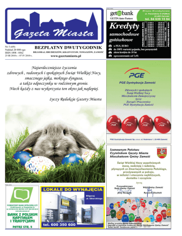 REKLAMA Nr 5 (69) Nakład 20 000 egz. ISSN 1898 - 0562 25 III 2010 r. - 07 IV 2010 r.. BEZPŁATNY DWUTYGODNIK BIŁGORAJ, HRUBIESZÓW, KRASNYSTAW, TOMASZÓW, ZAMOŚĆ www.gazetamiasta.pl Najserdeczniejsze życzenia zdrowych , radosnych i spokojnych Świąt Wielkiej Nocy, smacznego jajka, mokrego dyngusa, a także odpoczynku w rodzinnym gronie. Niech każdy z nas wykorzysta ten okres jak najlepiej. życzy Redakcja Gazety Miasta REKLAMA 2 W y da r z e n i a w w w. g a z et a m ia st a . p l REKLAMA Wielkanocne przygotowania w Tarnogrodzie Mimo że najważniejsze święta w roku liturgicznym jeszcze przed nami, w Tarnogrodzkim Ośrodku Kultury przez dwa dni trwały intensywne prace nad upiększeniem tych nadchodzących kwietniowych świąt. J uż po raz szósty wygląda on potem jak która na co dzień wraz dzieci, instrukto- namalowany na jajku. z mężem zajmuje się rzy z ośrodków Dwudniowe tarno- rolą. Kwiaty lubiła od kultury, a także folk- grodzkie warsztaty to dziecka. – Ja kwiaty loryści przyjechali przede wszystkim do- kocham, te w ogrodzie do Tarnogrodu, aby skonała szkoła kultury i nie tylko. Nie pamiępod bacznym okiem tradycyjnej dla dzieci. tam, gdzie się tego nafachowców uczyć uczyłam – chyba się zarówno tych tak sama z siebie, tradycyjnych, jak i po prostu miałam nowoczesnych medo tego jakieś zatod zdobienia pisacięcie. Trzeba to nek. Dwudniowe lubić robić, trzeba zajęcia cieszą się co mieć do tego cierroku dużym zaintepliwość. Dla mnie resowaniem. Na VI to nie jest żaden Regionalne Warszproblem zrobić taty Tradycyjnych jakiś kwiatek, kaMetod Zdobienia czeńce czy róże. Pisanek, w dniach Jednak wykonanie 22-23 marca br., Fot. Tarnogrodzki Ośrodek kultury gotowego, pięknezgłosiło się około go bukietu zajmu300 osób z całego po- – Bardzo mi się podo- je pani Anieli około 8 wiatu biłgorajskiego. bało. Ja nawet nie wie- godzin. Poświęcony Były to głównie grupy działam, że można tak czas nie idzie na marszkolne, chociaż nie robić pisanki – mówi ne. Kwiaty wykonane zabrakło także przed- Klaudia z Biłgoraja, z bibuły wyglądają jak szkolaków. Dzieci, uczennica II klasy żywe. poza zdobieniem pi- szkoły podstawowej. VI Regionalne Warszsanek poprzez tech- VI Regionalne Warsz- taty Tradycyjnych nikę wydrapywania, taty w Tarnogrodzie to Metod Zdobienia Pisawyklejania, batikową nie tylko pisanki i nowe nek odbyły się dzięki oraz malowania akry- techniki ich zdobienia. wsparciu finansowemu lem, uczyły się także To także zajęcia z wy- Marszałka Wojewódzmetody decoupage, konywania kwiatów z twa Lubelskiego, Staktóra polega na nakle- bibuły i krepiny. Anie- rostwa Powiatowego w janiu na powierzchnię la Mrówka ze Starego Biłgoraju oraz Burmiwcześniej wyciętego z Dzikowa, jedna z pań strza Tarnogrodu. ■ papieru lub serwetki prowadzących warszmotywu, dzięki czemu taty, jest emerytką, ek Historyczna kartka z kalendarza 25 marca 1992 Sąd Najwyższy zniósł wcześniejszy wyrok skazujący i uniewinnił skazanych w 1969 „inicjatorów wydarzeń marcowych”. 26 marca 1995 W życie wszedł tzw. układ z Schengen, o zniesieniu granic w obrębie Unii Europejskiej. 27 marca 1945 Władze radzieckie aresztowały 16 przywódców Polski Podziemnej. 28 marca 1976 Polska żeglarka, Krystyna Chojnowska-Liskiewicz rozpoczęła samotny rejs dookoła świata. Zakończyła go udanie dwa lata później, jest pierwszą kobietą na świecie, której udało się tego dokonać. 29 marca 1949 W Paryżu ukazał się pierwszy numer dziennika „Paris Match”. 1951 Rozdanie nagród Oscarów w Hollywood, najlepszym filmem został „Wszystko o Ewie” Josepha Mankiewicza. 30 marca 1992 Lubelska Fabryka Samochodów i francuski koncern Peugeot podpisały porozumienie o współpracy tych dwóch firm. W Lublinie będzie uruchomiona linia produkcyjna Peugota. 31 marca 1991 W Moskwie rozwiązano wojskowe struktury byłego Układu Warszawskiego. 1 kwietnia 1945 W roli Pasterza w „Mężu doskonałym” Zawieyskiego w Starym Teatrze w Krakowie zadebiutował Tadeusz Łomnicki, jedna z najwybitniejszych postaci polskiego teatru. 2 kwietnia 2005 Śmierć Papieża, Jana Pawła II. 3 kwietnia 1926 W Wielkiej Brytanii zaczęto produkcję pończoch damskich (bez „lecących oczek”). 1940 Jedna z licznych egzekucji grupy oficerów polskich w Katyniu. 4 kwietnia 1960 Premiera komedii Andrzeja Munka „Zezowate szczęście” z Bogumiłem Kobielą. 5 kwietnia 1984 Premiera baśniowego filmu Wolfganga Petersena „Nie kończąca się opowieść”. 1989 W Polsce podpisano porozumienia Okrągłego Stołu. 6 kwietnia 1934 Otwarcie lotniska na Okęciu w Warszawie. 7 kwietnia 1995 W Warszawie oddano do użytku pierwszy w Polsce odcinek metra. ■ Z regionu O d początku marca br. Zarząd Zamojskiego Stowarzyszenia Ochrony Zdrowia Psychicznego w Zamościu wznawia działalność Punktu Informacyjno-Konsultacyjnego, świadczącego usługi na rzecz rozwiązywania problemów uzależnień, szczególnie narkomanii. Na terenie Wyższej Szkoły Zarządzania i Administracji przy ul. Sienkiewicza 22 A, w sali 304, w każdy wtorek (w godz. 13.00 – 15.30) będą pełnić dyżury Specjaliści Terapii Uzależnień od Narkotyków: mgr Anna Górska, mgr Izabella Kwiatkowska. Jeżeli chcesz przestać brać lub jeśli zależy Ci na kimś bliskim, kto zażywa narkotyki, przyjdź! Porady są bezpłatne i anonimowe. Zadanie jest finansowane ze środków budżetu Miasta Zamość i będzie realizowane do 14 grudnia br. S towarzyszenie Osób Chorych na Stwardnienie Rozsiane w Zamościu w roku 2010 obchodzi mały jubileusz. Stowarzyszenie powstało w maju 2000 roku. To już 10 lat jego działalności. – Mamy uszkodzony centralny układ nerwowy, czyli krótko mówiąc – „nasz" mózg nie przekazuje wszystkich impulsów do poszczególnych części ciała. Mamy więc czasem zaburzenia równowagi, albo nie czujemy swojego ciała „normalnie", jak zdrowy człowiek (np.