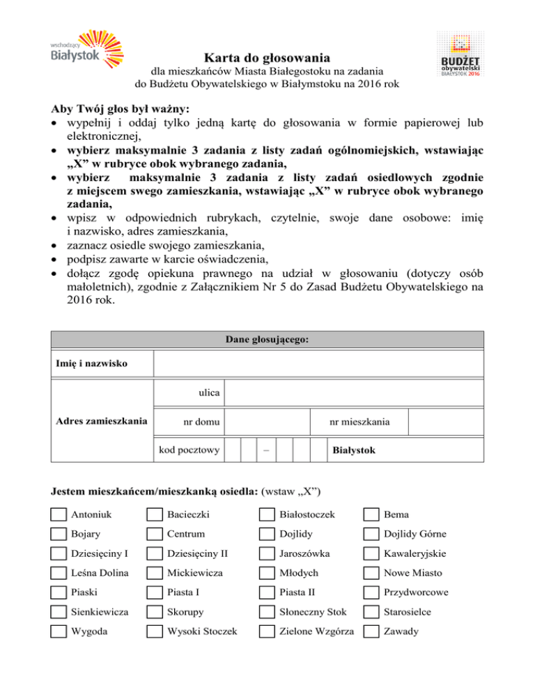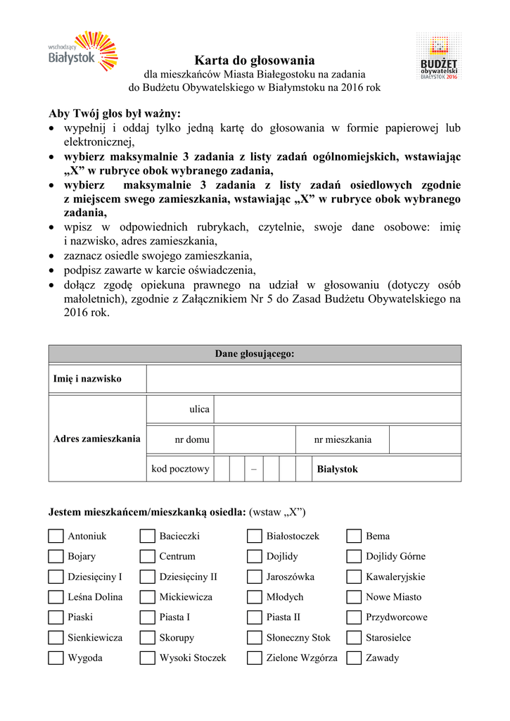 Karta do głosowania dla mieszkańców Miasta Białegostoku na zadania do Budżetu Obywatelskiego w Białymstoku na 2016 rok Aby Twój głos był ważny: wypełnij i oddaj tylko jedną kartę do głosowania w formie papierowej lub elektronicznej, wybierz maksymalnie 3 zadania z listy zadań ogólnomiejskich, wstawiając „X” w rubryce obok wybranego zadania, wybierz maksymalnie 3 zadania z listy zadań osiedlowych zgodnie z miejscem swego zamieszkania, wstawiając „X” w rubryce obok wybranego zadania, wpisz w odpowiednich rubrykach, czytelnie, swoje dane osobowe: imię i nazwisko, adres zamieszkania, zaznacz osiedle swojego zamieszkania, podpisz zawarte w karcie oświadczenia, dołącz zgodę opiekuna prawnego na udział w głosowaniu (dotyczy osób małoletnich), zgodnie z Załącznikiem Nr 5 do Zasad Budżetu Obywatelskiego na 2016 rok. Dane głosującego: Imię i nazwisko ulica Adres zamieszkania nr domu kod pocztowy nr mieszkania – Białystok Jestem mieszkańcem/mieszkanką osiedla: (wstaw „X”) Antoniuk Bacieczki Białostoczek Bema Bojary Centrum Dojlidy Dojlidy Górne Dziesięciny I Dziesięciny II Jaroszówka Kawaleryjskie Leśna Dolina Mickiewicza Młodych Nowe Miasto Piaski Piasta I Piasta II Przydworcowe Sienkiewicza Skorupy Słoneczny Stok Starosielce Wygoda Wysoki Stoczek Zielone Wzgórza Zawady ODDAJĘ SWÓJ GŁOS NA: A. ZADANIA OGÓLNOMIEJSKIE (wstaw „X” w rubryce „wybór”– max. 3 zadania) wybór 1 tytuł zadania lokalizacja szacunkowy koszt realizacji1 1. Pomnik Śledzia centrum Białegostoku, miejsce do ustalenia z mieszkańcami 650 000 zł 2. Białostockie Obywatelskie Pogotowie Poradnicze 6 punktów na terenie Białegostoku 510 800 zł 3. Ścieżka rowerowa Traktem Napoleońskim ścieżka rowerowa przebiegająca ul. Pieczurki i ul. Ofiar Majdanka, tzw. Traktem Napoleońskim 41 366 zł 4. Spójrz BiałystOK! – wypukłe plany sytuacyjne osiedli dostępne dla każdego Miasto Białystok – teren 28 osiedli 840 000 zł 5. Pomnik ku czci gen. bryg. Ludwika Kmicic-Skrzyńskiego, 10 Pułku Ułanów Litewskich i 14 Dywizjonu Artylerii Konnej Park Zwierzyniecki 510 000 zł 6. Młodzieżowy, Międzyosiedlowy Zespół Rekreacji i Kultury Fizycznej „Olimpijczyk” teren Szkoły Podstawowej nr 34, ul. Pogodna 12 1 930 000 zł 7. Białostocki Ośrodek Wschodnich Sztuk Walki magazyn przy ul. Węglowej 1 998 790 zł 8. Rowerzysto! Bezpieczniej z kamizelką Miasto Białystok 100 000 zł 9. Centrum Animacji Kultury „Wierzbowa” VII Liceum Ogólnokształcące, ul. Wierzbowa 7 1 999 300 zł 10. Wykonanie i ustawienie ,,Krzyża Katyńskiego” w bliskości istniejącego Pomnika Katyńskiego na skraju Parku Zwierzynieckiego Park Zwierzyniecki 97 000 zł 11. Remont ulic na osiedlu Starosielce ul. Nowosielska 873 000 zł 12. Budowa nawierzchni ulic: Bagiennej i Ustronnej ul. Bagienna i ul. Ustronna 993 370 zł 13. Budowa Centrum Aktywności Wielopokoleniowej funkcjonującego przy Szkole Podstawowej nr 47 w Białymstoku Szkoła Podstawowa nr 47, ul. Palmowa 28 805 580 zł 14. ,,ZOO – baczyć” – akcent zoologiczny dostępny dla niewidomych i słabowidzących Akcent ZOO w Białymstoku 117 120 zł lp. Szacunkowy koszt zadania, może ulec zmianie w toku realizacji zadania. 15. Budowa nowoczesnego i bezpiecznego miejsca zabawy i edukacji w „Ogródku Jordanowskim” ul. A.Mickiewicza – „Ogródek Jordanowski” 260 000 zł 16. Boisko sportowe wielofunkcyjne przy Zespole Szkół Budowlano-Geodezyjnych w Białymstoku Zespół Szkół BudowlanoGeodezyjnych, ul. Słonimska 47/1 610 000 zł 17. Integracyjne Centrum Zabaw ul. Włókiennicza 1 558 500 zł 18. Pierwszy Festiwal Piłki Ręcznej Miasta Białystok szkoły posiadające boisko do piłki ręcznej 169 408 zł 19. Dotknij historii Białegostoku centrum Białegostoku 510 000 zł 20. Tor rowerowy na os. Jaroszówka w Białymstoku ul. Odrzańska/ul. Jutrzenki lub np. ul. Czarnej Hańczy, ul. Bystrzycka, ul. Wiślana czy ul. J.K.Kluka 580 000 zł 21. Boisko wielofunkcyjne przy VIII Liceum Ogólnokształcącym im. Króla Kazimierza Wielkiego w Białymstoku VIII Liceum Ogólnokształcące, ul. Piastowska 5 1 066 000 zł 22. Osiedlowo – na sportowo z V LO teren zielony szkoły – V Liceum Ogólnokształcącego, ul. Miodowa 5 700 000 zł 23. ,,Czas na sport” – budowa boiska do siatkówki plażowej i gry w Streetball oraz remont i modernizacja zaplecza sanitarnego przy sali gimnastycznej w Publicznym Gimnazjum nr 2 oraz dokumentacja techniczna modernizacji sali gimnastycznej teren Publicznego Gimnazjum nr 2, ul. Legionowa 7 508 700 zł 24. Pomnik poświęcony Danucie Siedzik ,,INCE”, bohaterskiej sanitariuszce Armii Krajowej Skwer między ul. M. Curie-Skłodowskiej, skwer L. i M. Kaczyńskich oraz ul. Akademicką 113 000 zł 25. Biblioteka dla każdego Biblioteka Główna Książnicy Podlaskiej – ul. J.Kilińskiego 16 i Filie 586 400 zł 26. East Games United 2016 – Międzynarodowy Festiwal Gier i Kultury Stadion Miejski w Białymstoku 727 660 zł 27. Ścieżki biegowe w Parku Zwierzynieckim oraz Lesie Zwierzynieckim otwarte dla wszystkich biegaczy Park Zwierzyniecki (Park Konstytucji 3-go Maja) oraz Las Zwierzyniecki 70 600 zł 28. Biały Orlik Białystok-Pietrasze Las Pietrasze 1 999 000 zł B. ZADANIA OSIEDLOWE (wstaw „X” w rubryce „wybór”– max. 3 zadania) Uwaga! Głosuj tylko na zadania z osiedla swojego zamieszkania. wybór lp. tytuł zadania lokalizacja szacunkowy koszt realizacji1 ul. L.Waryńskiego/ ul. Żytnia 432 000 zł 300 000 zł 500 000 zł Centrum 1. Nasze Nowe Podwórko Białostoczek 1. Siłownia ,,pod chmurką” na osiedlu Białostoczek nad rzeką Białą, między ul. Radzymińską a Publicznym Gimnazjum nr 16 2. Budowa siłowni pod chmurką z oświetleniem, boiskiem trawiastym, ławeczkami, elementami zieleni przy ul. Sokólskiej ul. Sokólska Sienkiewicza brak projektów zgłoszonych lub zakwalifikowanych do głosowania Bojary 1. Z trójką bezpiecznie i zdrowo. (Budowa bulod