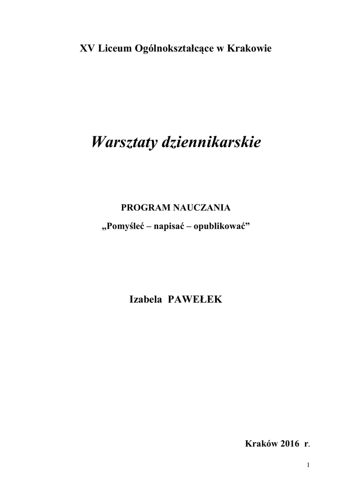XV Liceum Ogólnokształcące w Krakowie Warsztaty dziennikarskie PROGRAM NAUCZANIA „Pomyśleć – napisać – opublikować” Izabela PAWEŁEK Kraków 2016 r. 1 SPIS TREŚCI I. KONCEPCJA PROGRAMU …………………………………..... str. 3 II. CELE KSZTAŁCENIA I WYCHOWANIA ………………..… str. 4 III. TREŚCI NAUCZANIA 1. Wymagania szczegółowe ………………………………………………str. 5 2. Teksty prasowe poznawane w całości lub części ……………………......str. 6 3. Plan zadań edukacyjnych dla klasy drugiej ……………………….....…. str. 8 IV. WYMAGANIA EDUKACYJNE Z PRZEDMIOTU 1. Wymagania edukacyjne niezbędne do uzyskania poszczególnych śródrocznych i rocznych ocen klasyfikacyjnych ……………………….str. 13 2. Formy i kryteria oceniania na zajęciach ……………………………......str. 16 V. METODY I FORMY PRACY NA ZAJĘCIACH ……………...str.19 VI. BIBLIOGRAFIA – WYBÓR ……………………………………..str. 21 2 I. KONCEPCJA PROGRAMU Program nauczania na przedmiocie warsztaty "Pomyśleć – napisać – opublikować” realizowany dziennikarskie jest przeznaczony dla uczniów, którzy mają predyspozycje i zainteresowania humanistyczne. Program będzie dla nich wsparciem w rozwijaniu zainteresowań i kompetencji językowych. Zajęcia będą w wymiarze jednej godziny tygodniowo w rocznym cyklu kształcenia. To propozycja przeznaczona dla uczniów na IV etapie edukacyjnym, uczęszczających do drugiej klasy liceum ogólnokształcącego. Program może być realizowany w klasach, w których naucza się przedmiotów takich jak język polski, historia i WOS w zakresie rozszerzonym. Jest on zgodny z celami i treściami kształcenia określonymi w Rozporządzeniu Ministra Edukacji Narodowej z dnia 23 grudnia 2008 roku w sprawie podstawy programowej wychowania przedszkolnego oraz kształcenia ogólnego w poszczególnych typach szkół (Dz. U. z 2009 roku, nr 4, poz. 17). Z uwagi na treści nauczania i cele kształcenia, a także doskonalone umiejętności program w największym stopniu skorelowany jest z przedmiotem Na zajęciach warsztatowych ćwiczone będą umiejętności takie - język polski. jak: odbiór wypowiedzi i wykorzystanie zawartych w nich informacji, samokształcenie i docieranie do informacji, tworzenie wypowiedzi. Są to umiejętności objęte podstawą programową dla języka polskiego i związane z wymaganiami na egzaminie maturalnym. Teksy publicystyczne czytane na zajęciach nierzadko będą autorstwa pisarzy, którzy łączyli lub łączą pracę literacką i dziennikarstwo (dotyczy m.in. Bolesława Prusa, Wisławy Szymborskiej, Jerzego Pilcha, Ryszarda Kapuścińskiego, Hanny Krall, Stanisława Lema, Jacka Hugo – Badera, Mariusza Szczygła). Zatem program warsztatów został pomyślany także jako rozszerzający i uzupełniający wiadomości o tekstach kultury poznawanych na lekcjach języka polskiego. Podstawowym podręcznikiem dla klas korzystających z programu jest książka Stanisława Bortnowskiego Warsztaty dziennikarskie wydawnictwa Stentor, opublikowana po raz ostatni w Warszawie w 2013 roku. Pozycją uzupełniającą będzie Czwarta władza z klasą. Podręcznik dla uczniów I. Leonowicz Bukały i innych opublikowana w Krakowie, Rzeszowie i Gliwicach w 2009 roku. 3 Autor programu zakłada możliwość modyfikacji jednostek tematycznych w zależności od potrzeb klasy, zainteresowań uczniów i tempa ich pracy na zajęciach. Liczba godzin lekcyjnych przeznaczonych do realizacji programu „Pomyśleć – napisać – opublikować” na przedmiocie warsztaty dziennikarskie Liczba godzin: Klasa druga liceum w tygodniu 1 w roku szkolnym 30 II. CELE KSZTAŁCENIA I WYCHOWANIA – wymagania ogólne Cele kształcenia (wiadomości i umiejętności) 1) Odbiór wypowiedzi i wykorzystanie zawartych w nich informacji. Uczeń rozumie czytane teksty prasowe (informacyjne i publicystyczne), określa ich sens, jawne oraz ukryte intencje. 2) Analiza i interpretacja tekstów prasowych. Uczeń rozpoznaje gatunki dziennikarskie, ponadto rozpoznaje funkcje tekstu oraz środki językowe i artystyczne służące ich realizacji, w analizie stosuje podstawowe pojęcia z poetyki i nauki o języku; w interpretacji wykorzystuje kontekst społeczny i polityczny; odczytuje rozmaite, także ukryte sensy tekstów. 3) Tworzenie wypowiedzi. Uczeń redaguje podstawowe gatunki prasowe i publicystyczne, stosując w nich zasady logiki, retoryki i komponowania tekstów. 4 Cele wychowania 1) Uczeń ma świadomość roli publicystyki w życiu społeczeństwa oraz znaczenia dorobku wybranych publicystów; ma świadomość odpowiedzialności człowieka za wypowiedziane słowa i szanuje język ojczysty. 2) Uczeń rozumie i akceptuje różne poglądy dotyczące człowieka, jego miejsca w świecie, cenionych wartości; rozumie potrzebę przyjmowania postawy tolerancji, odpowiedzialności, sprzeciwu wobec przemocy. 3) Uczeń potrafi pracować w zespole, przyjmując różne role; dąży do samodzielności w zdobywaniu wiedzy oraz nowych umiejętności; potrafi samodzielnie i świadomie wybierać (stosując różne kryteria) i poznawać teksty prasowe. III. TREŚCI NAUCZANIA. 1. Wymagania szczegółowe. W zakresie wiadomości gromadzonych na warsztatach dziennikarskich uczeń: zna podstawowe pojęcia związane z dziennikarstwem i publicystyką (m.in. publicysta, dziennikarz, dziennikarz – celebryta; opinia publiczna, mass media, prasa, dziennikarstwo prasowe, radiowe, telewizyjne; etyka dziennikarska, warsztat dziennikarski); zna teksty publicystyczne wskazane przez nauczyciela (dawnych i współczesnych autorów), zna specyfikę różnych gatunków dziennikarskich: informacyjnych i publicystycznych (m.in. news, komentarz, relacja, artykuł, felieton, reportaż, recenzja, wywiad, esej); zna pojęcia związane z kompozycją tekstu prasowego (tytuł, ew. nadtytuł, podtytuł, lead, akapit opisowy, argument