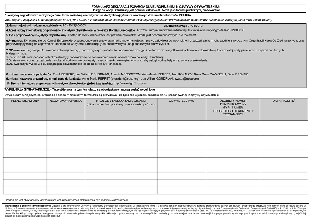 FORMULARZ DEKLARACJI POPARCIA DLA EUROPEJSKIEJ INICJATYWY OBYWATELSKIEJ: Dostęp do wody i kanalizacji jest prawem człowieka! Woda jest dobrem publicznym, nie towarem! 1.Wszyscy sygnatariusze niniejszego formularza posiadają osobisty numer identyfikacyjny/numer osobistego dokumentu tożsamości POLSKA Zob. część C załącznika III do rozporządzenia (UE) nr 211/2011 w odniesieniu do osobistych numerów identyfikacyjnych/numerów osobistych dokumentów tożsamości, z których jeden musi zostać podany. 2.Numer rejestracji nadany przez Komisję: ECI(2012)000003 3.Data rejestracji: 01/04/2012 4.Adres strony internetowej proponowanej inicjatywy obywatelskiej w rejestrze Komisji Europejskiej: http://ec.europa.eu/citizens-initiative/public/initiatives/ongoing/details/2012/000003 5.Tytuł proponowanej inicjatywy obywatelskiej: Dostęp do wody i kanalizacji jest prawem człowieka! Woda jest dobrem publicznym, nie towarem! 6.Przedmiot: Zwracamy się do Komisji Europejskiej o zaproponowanie aktów prawnych, implementujących prawo człowieka do wody pitnej i urządzeń sanitarnych, zgodnie z wytycznymi Organizacji Narodów Zjednoczonych, oraz przyczyniających się do zapewnienia dostępu do wody oraz kanalizacji, jako podstawowych usług publicznych dla wszystkich. 7.Główne cele: Legislacja UE powinna zobowiązać rządy poszczególnych państw do zapewnienia dostępu i dostarczenia wszystkim mieszkańcom odpowiedniej ilości czystej wody pitnej oraz urządzeń sanitarnych. Nalegamy, aby: 1.Instytucje UE oraz państwa członkowskie były zobowiązane do zapewnienia mieszkańcom prawa do wody i kanalizacji. 2.Dostawa wody oraz zarządzanie zasobami wodnymi nie podlegały zasadom rynku wewnętrznego oraz aby usługi wodne były wyłączone z urynkowienia. 3.UE zwiększyła wysiłki w celu osiągnięcia powszechnego dostępu do wody i kanalizacji. 8.Imiona i nazwiska organizatorów: Frank BSIRSKE, Jan Willem GOUDRIAAN, Annelie NORDSTRÖM, Anne-Marie PERRET, Ivan KOKALOV, Rosa Maria PAVANELLI, Dave PRENTIS 9.Imiona i nazwiska oraz adresy e-mail osób do kontaktu: Anne-Marie PERRET ([email protected]), Jan Willem GOUDRIAAN ([email protected]) 10.Strona internetowa proponowanej inicjatywy obywatelskiej (jeżeli taka istnieje): http://www.right2water.eu WYPEŁNIAJĄ SYGNATARIUSZE: - Wszystkie pola na tym formularzu są obowiązkowe i muszą zostać wypełnione. Oświadczam niniejszym, że informacje podane w niniejszym formularzu są prawdziwe i że tylko raz wyrażam poparcie dla tej proponowanej inicjatywy obywatelskiej. PEŁNE IMIĘ/IMIONA 1 NAZWISKO/NAZWISKA MIEJSCE STAŁEGO ZAMIESZKANIA (ulica, numer, kod pocztowy, miejscowość, państwo) OBYWATELSTWO OSOBISTY NUMER IDENTYFIKACYJNY /TYP I NUMER OSOBISTEGO DOKUMENTU TOŻSAMOŚCI DATA I PODPIS1 Podpis nie jest obowiązkowy, gdy formularz jest składany drogą elektroniczną bez podpisu elektronicznego. Oświadczenie o ochronie danych osobowych: Zgodnie z art. 10 dyrektywy 95/46/WE Parlamentu Europejskiego i Rady z dnia 24 października 1995 r. w sprawie ochrony osób fizycznych w zakresie przetwarzania danych osobowych i swobodnego przepływu tych danych, dane osobowe podane w niniejszym formularzu zostaną udostępnione jedynie właściwym organom w celu weryfikacji i poświadczenia liczby ważnych deklaracji poparcia otrzymanych w sprawie tej proponowanej inicjatywy obywatelskiej (zob. art. 8 rozporządzenia Parlamentu Europejskiego i Rady (UE) nr 211/2011 z dnia 16 lutego 2011 r. w sprawie inicjatywy obywatelskiej) oraz w razie konieczności dalej przetwarzane na potrzeby procedur administracyjnych lub sądowych dotyczących proponowanej inicjatywy obywatelskiej (zob. art. 12 rozporządzenia (UE) nr 211/2011). Danych tych nie można wykorzystywać do żadnych innych celów. Osoby, których dotyczą dane, mają prawo dostępu do swoich danych osobowych. Wszystkie deklaracje poparcia zostaną zniszczone najpóźniej 18 miesięcy po dacie zarejestrowania proponowanej inicjatywy obywatelskiej lub, w przypadku procedur administracyjnych lub sądowych, najpóźniej tydzień po dacie zakończenia wspomnianych procedur.