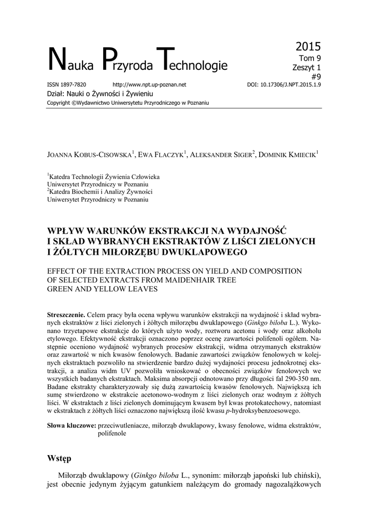 Nauka Przyroda Technologie ISSN 1897-7820 http://www.npt.up-poznan.net 2015 Tom 9 Zeszyt 1 #9 DOI: 10.17306/J.NPT.2015.1.9 Dział: Nauki o Żywności i Żywieniu Copyright ©Wydawnictwo Uniwersytetu Przyrodniczego w Poznaniu JOANNA KOBUS-CISOWSKA1, EWA FLACZYK1, ALEKSANDER SIGER2, DOMINIK KMIECIK1 1 Katedra Technologii Żywienia Człowieka Uniwersytet Przyrodniczy w Poznaniu 2 Katedra Biochemii i Analizy Żywności Uniwersytet Przyrodniczy w Poznaniu WPŁYW WARUNKÓW EKSTRAKCJI NA WYDAJNOŚĆ I SKŁAD WYBRANYCH EKSTRAKTÓW Z LIŚCI ZIELONYCH I ŻÓŁTYCH MIŁORZĘBU DWUKLAPOWEGO EFFECT OF THE EXTRACTION PROCESS ON YIELD AND COMPOSITION OF SELECTED EXTRACTS FROM MAIDENHAIR TREE GREEN AND YELLOW LEAVES Streszczenie. Celem pracy była ocena wpływu warunków ekstrakcji na wydajność i skład wybranych ekstraktów z liści zielonych i żółtych miłorzębu dwuklapowego (Ginkgo biloba L.). Wykonano trzyetapowe ekstrakcje do których użyto wody, roztworu acetonu i wody oraz alkoholu etylowego. Efektywność ekstrakcji oznaczono poprzez ocenę zawartości polifenoli ogółem. Następnie oceniono wydajność wybranych procesów ekstrakcji, widma otrzymanych ekstraktów oraz zawartość w nich kwasów fenolowych. Badanie zawartości związków fenolowych w kolejnych ekstraktach pozwoliło na stwierdzenie bardzo dużej wydajności procesu jednokrotnej ekstrakcji, a analiza widm UV pozwoliła wnioskować o obecności związków fenolowych we wszystkich badanych ekstraktach. Maksima absorpcji odnotowano przy długości fal 290-350 nm. Badane ekstrakty charakteryzowały się dużą zawartością kwasów fenolowych. Największą ich sumę stwierdzono w ekstrakcie acetonowo-wodnym z liści zielonych oraz wodnym z żółtych liści. W ekstraktach z liści zielonych dominującym kwasem był kwas protokatechowy, natomiast w ekstraktach z żółtych liści oznaczono największą ilość kwasu p-hydroksybenzoesowego. Słowa kluczowe: przeciwutleniacze, miłorząb dwuklapowy, kwasy fenolowe, widma ekstraktów, polifenole Wstęp Miłorząb dwuklapowy (Ginkgo biloba L., synonim: miłorząb japoński lub chiński), jest obecnie jedynym żyjącym gatunkiem należącym do gromady nagozalążkowych 2 Kobus-Cisowska, J., Flaczyk, E., Siger, A., Kmiecik, D. (2015). Wpływ warunków ekstrakcji na wydajność i skład wybranych ekstraktów z liści zielonych i żółtych miłorzębu dwuklapowego. Nauka Przyr. Technol., 9, 1, #9. DOI: 10.17306/J.NPT.2015.1.9 (Gymnospermae) i klasy miłorzębowych (Ginkgopsida). Nazywany jest żyjącą skamieliną, ponieważ reprezentuje jedyny żyjący gatunek rzędu Ginkgoales (Chen i in., 2012; Satoh i Nishida, 2004). Jest gatunkiem reliktowym i endemicznym, jedynym, jaki pozostał z ery kenozoicznej (Boonkaew i Camper, 2005). Wiele źródeł literaturowych wskazuje, że najstarsze drzewa tego gatunku, mające ponad 4 tysiące lat, znajdują się na terenie Chin i przekraczają wysokość 40 m. Z Chin miłorząb trafił prawdopodobnie do Japonii i Korei, gdzie okazy mają odpowiednio 1250 i 1100 lat, a ich wysokość sięga 30 m. Do Europy miłorząb został sprowadzony z Japonii na przełomie XVII i XVIII wieku. Obecnie wielkie plantacje miłorzębu zakłada się w USA i Francji ze względu na jego lecznicze właściwości (Boonkaew i Camper, 2005). Współcześnie miłorząb dwuklapowy uważany jest za „fabrykę biochemiczną”, zawierającą wiele składników bioaktywnych. Do najważniejszych związków biologicznie aktywnych miłorzębu zaliczono flawonoidy, połączenia diterpenowe specyficzne dla tej rośliny – ginkgolidy (A, B, C, J, M) oraz kwasy fenolowe (Boonkaew i Camper, 2005; Kobus i in., 2009; Liu i in., 2006; Pietta i in., 1991; Sati i in., 2013; van Beek i in., 1991). Wyciąg z liści stosuje się przy nadmiernej nerwowości, zaburzeniach krążenia i kłopotach z koncentracją. Badania farmakologiczne dotyczące miłorzębu koncentrują się głównie na określaniu wpływu całego wyciągu, a także wydzielonych frakcji lub pojedynczych związków, na układ nerwowy i sercowo-naczyniowy. Wielokierunkowe badania biologiczne wykazały, że za efekt terapeutyczny odpowiedzialna jest frakcja związków flawonoglikozydów oraz pochodnych terpenowych (Pereira i in., 2013). Udowodniono, że właściwy efekt terapeutyczny jest możliwy dzięki zachowaniu odpowiedniej proporcji poszczególnych zespołów związków czynnych (van Beek, 2002; Ding i in., 2008). Obecnie w celach farmakologicznych wykorzystuje się liście zielone miłorzębu. Liście żółte, które po okresie wegetacji opadają z drzew, były przedmiotem nielicznych badań, a ich właściwości nie są do końca poznane (Kobus-Cisowska i in., 2014), dlatego w pracy postanowiono ocenić wpływ warunków ekstrakcji prowadzonej kilkuetapowo na wydajność, widma UV i zawartość kwasów fenolowych w ekstraktach sporządzonych z użyciem różnych rozpuszczalników z liści żółtych oraz zielonych. Materiał i metody Materiał Materiałem do badań były liście zielone (A) i żółte (B) miłorzębu dwuklapowego odmiany ‘Herkules’ z drzew pochodzących z upraw Uniwersytetu Przyrodniczego w Poznaniu w Baranowie. Liście zebrano w sierpniu (liście zielone – A) oraz październiku (liście żółte – B), wysuszono w temperaturze 40°C, a następnie rozdrobniono w młynku laboratoryjnym. Do badań wydzielono frakcję o stopniu rozdrobnienia 0,8-0,09 mm. Ekstrakcja Ekstrakcje przeprowadzono trzykrotnie tym samym rozpuszczalnikiem w taki sposób, że pozostałość po pierwszej ekstrakcji ekstrahowano ponownie, a pozostałość po 3 Kobus-Cisowska, J., Flaczyk, E., Siger, A., Kmiecik, D. (2015). Wpływ warunków ekstrakcji na wydajność i skład wybranych ekstraktów z liści zielonych i żółtych miłorzębu dwuklapowego. Nauka Przyr. Technol., 9, 1, #9. DOI: 10.17306/J.NPT.2015.1.9 drugiej ekstrahowano po raz trzeci. Jako ekstrahentów użyto wody, roztworu acetonu i wody (w stosunku 3:2, v/v) o