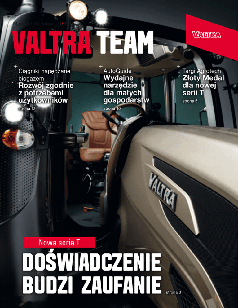 Magazyn Klientów 1/2015 + Ciągniki napędzane biogazem Rozwój zgodnie z potrzebami użytkowników strona 12 + AutoGuide + Wydajne narzędzie dla małych gospodarstw Złoty Medal dla nowej serii T strona 5 strona 16 Nowa seria T doświadczenie budzi zaufanie Targi Agrotech strona 3 Valtra team Magazyn Klientów 1/2015 Wst p 04 Drodzy Czytelnicy P ierwsze targi, pierwsze pokazy i pierwsze spotkania z Klientami już za nami. Z radością informujemy, że nasze nowe ciągniki zostały ciepło przyjęte na polskim rynku. Po zdobyciu tytułu Maszyny Roku (Machine of the Year) podczas tegorocznych targów Sima w Paryżu, nowa seria T zdobyła Złoty Medal Targów Kielce. Jest to kolejne wyróżnienie, które bardzo nas cieszy i jest skromnym potwierdzeniem innowacyjności Valtry i milowego kroku w dalszym rozwoju ciągników. Najważniejsze jednak są rzeczywiste osiągi w polu i praktyczne korzyści dla użytkownika w każdych warunkach zastosowań. Dynamika i niskie koszty eksploatacji, nowoczesność i prostota obsługi, wytrzymałość i żywotność - to tylko niektóre odwieczne cechy naszych ciągników. Już teraz zapraszamy do naszych dealerów na pokazy oraz jazdy testowe. Zasiądź za kierownicą nowej serii T i poczuj drzemiącą w tym ciągniku moc i niezrównany komfort jazdy. Gorąco zachęcam do lektury pierwszego w tym roku wydania Valtra Team. Gorąco pozdrawiam Bogdan Rachwał dyrektor valtra w polsce 2 Valtra team 1/2015 06 10 Pierwsze modele nowej serii T dostarczone do klientów 16 W tym numerze: 03 Czwarta generacja serii T zdobywcą tytułu Machine of the Year 04 News: Prezentacja nowej serii T zgromadziła 1500 gości 05 06 Złoty Medal dla nowej serii T 10 Valtra ustanawia nowy rekord prędkości ciągników rolniczych 12 Nowa generacja ciągników na biogaz 14 Nowa seria T redukuje koszty serwisowe o ponad 20 % Nowe ciągniki serii T ciężko pracują w całej Europie 16 System automatycznego prowadzenia AutoGuide i asystent hydrauliki – właściwe narzędzie nawet na małe pola 19 Pół wieku przekładni bezstop niowej CVT 20 22 Targi Agrotech 2015 w Kielcach 23 24 Kolekcja Valtra Gwiazdy fińskiego hokeja trenują z dziećmi z lokalnych gospodarstw Modele Valtra 12 Czwarta generacja Serii T Maszyna Roku Nowa Valtra serii T zdobyła tytuł Maszyny Roku podczas targów SIMA, Paris International Agri Business Show. Jury składało się z 19 niezależnych dziennikarzy rolniczych, reprezentujących 17 europejskich pism branżowych z Francji, Niemiec, Polski, Rumunii, Danii, Chorwacji, Węgier i Szwecji. Konkurs organizowany był przez francuski Terre-net i niemieckiego wydawcę DLV. Nagrody przyznawane są co roku na Innowacje pokazach SIMA i Agritechnica. Seria T zdobyła tytuł Maszyny Roku w kategorii 180–280 koni mechanicznych. Wszystkich kategorii było 17, a zwycięzców wybrano spośród 94 nominowanych. W tym roku członkowie jury zwracali szczególną uwagę na innowacyjność i korzyści dla użytkownika. • valtra.pl Valtra team 3 Prezentacja nowej serii T w Niemczech okazała się dużym sukcesem wśród dealerów i importerów, którzy złożyli zamówienia na ponad 1000 ciągników. Prezentacja nowej serii T zgromadziła 1500 gości tekst Tommi Pitenius ZDJĘCIA Archiwum Valtra O koło 1500 osób – dealerów, importerów i dziennikarzy – uczestniczyło w listopadzie zeszłego roku w prezentacji nowej Valtry serii T w Wörth am Main w Niemczech. Całe wydarzenie trwało dwa tygodnie, a codziennie uczestniczyło w nim około 150 różnych gości. Podczas wieczornej sesji mieli oni okazję dowiedzieć się więcej na temat nowego ciągnika. Nazajutrz wiedzę teoretyczną można było sprawdzić w praktyce. Goście mieli okazję przypatrzeć się nowej Serii T z różnych perspektyw. Uczestnicy mieli możliwość pracować ciągnikiem w polu z broną lub pługiem, poprowadzić go na drodze, przetestować podczas pracy z ładowaczem czołowym i sprawdzić działanie układy jazdy tyłem TwinTrac. Łącznie dostępnych było 11 ciągników z nowej Serii T, dzięki czemu każdy mógł doznać wrażeń z jazdy nowymi modelami. Przedstawiono również funkcje związane z serwisowaniem i obsługą codzienną nowej Serii T. Nowa Seria T została pozytywnie przyjęta. Importerzy i dealerzy zamówili ponad 1000 nowych ciągników. Pierwsze ciągniki dostarczono do Finlandii, Francji i Niemiec. Dostawy do innych państw rozpoczęły się zaraz po przerwie zimowej. • Internet: valtra.pl Redaktor naczelna Hannele Kinnunen, Valtra Inc., [email protected] Redakcja Tommi Pitenius, Medita Communication Oy, [email protected] Teksty opracowali Marc de Haan, Mechan Groep, [email protected] // Adam Wiatroszak, AGCO Sp. z.o.o., [email protected] // Emanuela Agostini, AGCO Italia SpA, [email protected] // Siegfried Aigner, AGCO Austria GmbH, [email protected] // Sylvain Mislanghe, AGCO Distr. SAS, [email protected] // Thomas Lesch, AGCO Deutschland GmbH, [email protected] // Lindsay Haddon, AGCO Ltd., [email protected] Wydawca Valtra Oy Ab, Valmetinkatu 2, 44200 Suolahti Valtra is a worldwide brand of AGCO Układ graficzny Juha Puikkonen, INNOverkko Druk Grano Oy Zdj cia z archiwum Valtra, je li nie zaznaczono inaczej 4 Valtra team 1/2015 News PL Więcej informacji: valtra.pl Złoty Medal dla nowej serii T N owa czwarta generacja ciągników Valtra kroczy droga zwycięstw i sukcesów. Po zdobyciu tytułu Machine of the Year podczas tegorocznych targów Sima we Francji przyszedł czas na XXI Międzynarodowe Targi Techniki Rolniczej Agrotech w Kielcach. Podczas tych targów fińskie ciągniki zdobyły kolejne wyróżnienie i tym samym odniosły kolejny sukces. Złoty Medal Targów Kielce został wręczony przez Ministra Rolnictwa podczas oficjalnej ceremonii pierwszego dnia targów. Nowa seria T czwartej generacji została nagrodzona Złotym Medalem za zastosowanie nowoczesnych rozwiązań konstrukcyjnych i ergonomicznych. Wszystkie zdobyte wyróżnienia są dowodem, iż