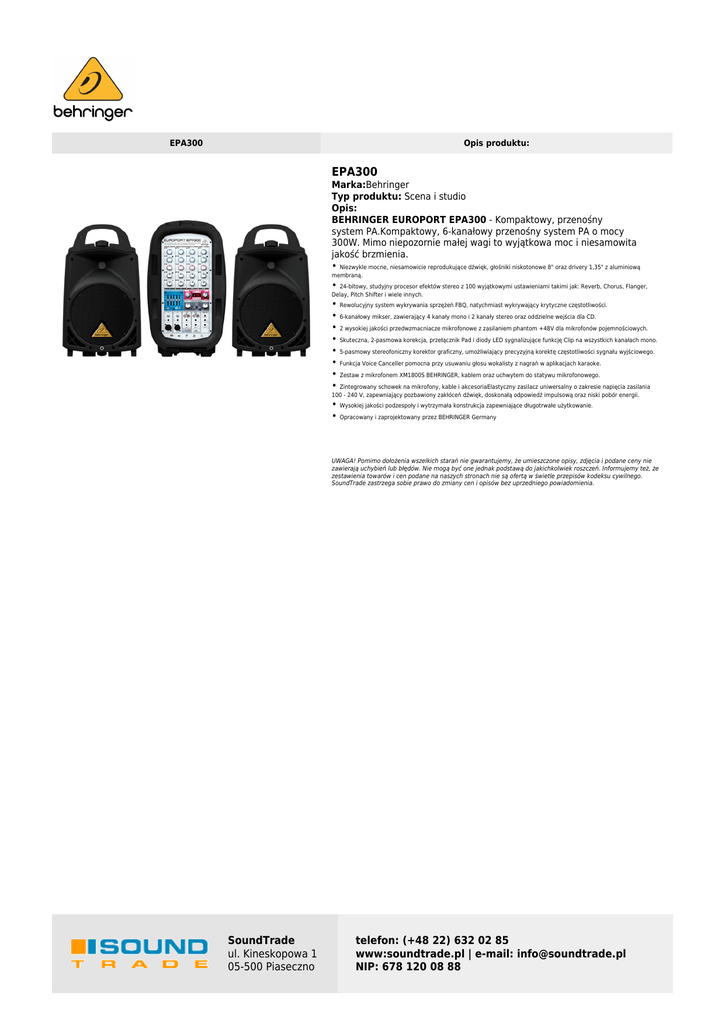EPA300 Opis produktu: EPA300 Marka:Behringer Typ produktu: Scena i studio Opis: BEHRINGER EUROPORT EPA300 - Kompaktowy, przenośny system PA.Kompaktowy, 6-kanałowy przenośny system PA o mocy 300W. Mimo niepozornie małej wagi to wyjątkowa moc i niesamowita jakość brzmienia. • Niezwykle mocne, niesamowicie reprodukujące dźwięk, głośniki niskotonowe 8" oraz drivery 1,35" z aluminiową membraną. • 24-bitowy, studyjny procesor efektów stereo z 100 wyjątkowymi ustawieniami takimi jak: Reverb, Chorus, Flanger, Delay, Pitch Shifter i wiele innych. • Rewolucyjny system wykrywania sprzężeń FBQ, natychmiast wykrywający krytyczne częstotliwości. • 6-kanałowy mikser, zawierający 4 kanały mono i 2 kanały stereo oraz oddzielne wejścia dla CD. • 2 wysokiej jakości przedwzmacniacze mikrofonowe z zasilaniem phantom +48V dla mikrofonów pojemnościowych. • Skuteczna, 2-pasmowa korekcja, przełącznik Pad i diody LED sygnalizujące funkcję Clip na wszystkich kanałach mono. • 5-pasmowy stereofoniczny korektor graficzny, umożliwiający precyzyjną korektę częstotliwości sygnału wyjściowego. • Funkcja Voice Canceller pomocna przy usuwaniu głosu wokalisty z nagrań w aplikacjach karaoke. • Zestaw z mikrofonem XM1800S BEHRINGER, kablem oraz uchwytem do statywu mikrofonowego. • Zintegrowany schowek na mikrofony, kable i akcesoriaElastyczny zasilacz uniwersalny o zakresie napięcia zasilania 100 - 240 V, zapewniający pozbawiony zakłóceń dźwięk, doskonałą odpowiedź impulsową oraz niski pobór energii. • Wysokiej jakości podzespoły i wytrzymała konstrukcja zapewniające długotrwałe użytkowanie. • Opracowany i zaprojektowany przez BEHRINGER Germany UWAGA! Pomimo dołożenia wszelkich starań nie gwarantujemy, że umieszczone opisy, zdjęcia i podane ceny nie zawierają uchybień lub błędów. Nie mogą być one jednak podstawą do jakichkolwiek roszczeń. Informujemy też, że zestawienia towarów i cen podane na naszych stronach nie są ofertą w świetle przepisów kodeksu cywilnego. SoundTrade zastrzega sobie prawo do zmiany cen i opisów bez uprzedniego powiadomienia. SoundTrade ul. Kineskopowa 1 05-500 Piaseczno telefon: (+48 22) 632 02 85 www:soundtrade.pl | e-mail: [email protected] NIP: 678 120 08 88