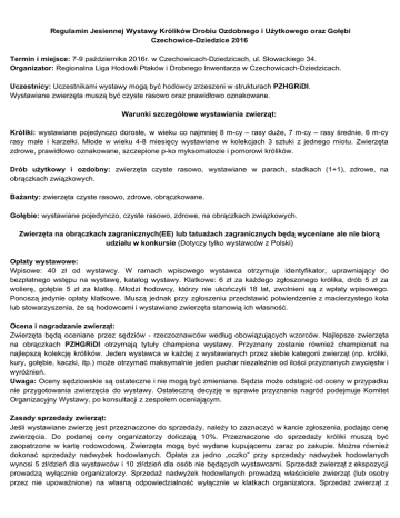 Regulamin Jesiennej Wystawy Królików Drobiu Ozdobnego i Użytkowego oraz Gołębi CzechowiceDziedzice 2016 Termin i miejsce: 79 października 2016r. w CzechowicachDziedzicach, ul. Słowackiego 34. Organizator: Regionalna Liga Hodowli Ptaków i Drobnego Inwentarza w CzechowicachDziedzicach. Uczestnicy: Uczestnikami wystawy mogą być hodowcy zrzeszeni w strukturach PZHGRiDI . Wystawiane zwierzęta muszą być czyste rasowo oraz prawidłowo oznakowane. Warunki szczegółowe wystawiania zwierząt: Króliki: wystawiane pojedynczo dorosłe, w wieku co najmniej 8 mcy – rasy duże, 7 mcy – rasy średnie, 6 mcy rasy małe i karzełki. Młode w wieku 48 miesięcy wystawiane w kolekcjach 3 sztuki z jednego miotu. Zwierzęta zdrowe, prawidłowo oznakowane, szczepione pko myksomatozie i pomorowi królików. Drób użytkowy i ozdobny: zwierzęta czyste rasowo, wystawiane w parach, stadkach (1+1), zdrowe, na obrączkach związkowych. Bażanty: zwierzęta czyste rasowo, zdrowe, obrączkowane. Gołębie: wystawiane pojedynczo, czyste rasowo, zdrowe, na obrączkach związkowych. Zwierzęta na obrączkach zagranicznych(EE) lub tatuażach zagranicznych będą wyceniane ale nie biorą udziału w konkursie (Dotyczy tylko wystawców z Polski) Opłaty wystawowe: Wpisowe: 40 zł od wystawcy. W ramach wpisowego wystawca otrzymuje identyfikator, uprawniający do bezpłatnego wstępu na wystawę, katalog wystawy. Klatkowe: 6 zł za każdego zgłoszonego królika, drób 5 zł za wolierę, gołębie 5 zł za klatkę. Młodzi hodowcy, którzy nie ukończyli 18 lat, zwolnieni są z wpłaty wpisowego. Ponoszą jedynie opłaty klatkowe. Muszą jednak przy zgłoszeniu przedstawić potwierdzenie z macierzystego koła lub stowarzyszenia, że są hodowcami i wystawiane zwierzęta stanowią ich własność. Ocena i nagradzanie zwierząt: Zwierzęta będą oceniane przez sędziów rzeczoznawców według obowiązujących wzorców. Najlepsze zwierzęta na obrączkach PZHGRiDI otrzymają tytuły championa wystawy. Przyznany zostanie również championat na najlepszą kolekcję królików. Jeden wystawca w każdej z wystawianych przez siebie kategorii zwierząt (np. króliki, kury, gołębie, kaczki, itp.) może otrzymać maksymalnie jeden puchar niezależnie od ilości przyznanych zwycięstw i wyróżnień. Uwaga: Oceny sędziowskie są ostateczne i nie mogą być zmieniane. Sędzia może odstąpić od oceny w przypadku nie przygotowania zwierzęcia do wystawy. Ostateczną decyzję w sprawie przyznania nagród podejmuje Komitet Organizacyjny Wystawy, po konsultacji z zespołem oceniającym. Zasady sprzedaży zwierząt: Jeśli wystawiane zwierzę jest przeznaczone do sprzedaży, należy to zaznaczyć w karcie zgłoszenia, podając cenę zwierzęcia. Do podanej ceny organizatorzy doliczają 10%. Przeznaczone do sprzedaży króliki muszą być zaopatrzone w kartę rodowodową. Zwierzęta mogą być wydane kupującemu zaraz po zakupie. Można również dokonać sprzedaży nadwyżek hodowlanych. Opłata za jedno „oczko” przy sprzedaży nadwyżek hodowlanych wynosi 5 zł/dzień dla wystawców i 10 zł/dzień dla osób nie będących wystawcami. Sprzedaż zwierząt z ekspozycji prowadzą wyłącznie organizatorzy. Sprzedaż nadwyżek hodowlanych prowadzą właściciele zwierząt (lub osoby przez nie upoważnione) na własną odpowiedzialność wyłącznie w klatkach organizatora. Sprzedaż zwierząt z własnych klatek hodowcy oraz w pobliżu wystawy jest zabroniona. Uwaga, ilość zwierząt, wkładanych do „oczka” przy sprzedaży nadwyżek hodowlanych nie może powodować ich nadmiernego zagęszczenia. Sprzedający nadwyżki hodowlane zobowiązany jest zabezpieczyć zwierzętom karmidło i poidło. Wymagania dotyczące zdrowotności zwierząt sprzedawanych w ramach nadwyżek hodowlanych są takie same, jak dla zwierząt wystawianych. Zgłoszenia do wystawy: Zwierzęta do wystawy należy zgłosić w terminie do dnia 25 września 2016r. wraz z wpłatą na adres: Ireneusz Kempanowski ul. Chłopska 11, 43502 CzechowiceDziedzice tel. 693 367 402 Bogdan Kwiczała ul. Krupnicza 3, 43502 CzechowicachDziedzicach tel. 500 141 807 Zgłoszenia do wystawy na załączonych kartach zgłoszeń. Kalendarz Wystawy: Zgłaszanie zwierząt, opłaty wystawowe: do 25 września 2016r. 00 00 Przyjmowanie zwierząt: 5 października 2016r. w godz. 16 – 21 00 00 6 października 2016r. w godz. 6 9 00 Ocena zwierząt: 6 października 2016r. od godz. 10 00 00 Ekspozycja: 7 października 2016r. w godz. 8 – 17 00 00 8 października 2016r. w godz. 8– 16 00 00 9 października 2016r. w godz. 8 – 15 00 Zakończenie, wręczenie nagród: 9 października 2016r. godz. 13 00 Wydawanie zwierząt: 9 października 2016r. od godz. 15 Uwagi końcowe: Organizatorzy zapewniają nadzór, opiekę i karmienie zwierząt, a także zabezpieczenie ich przed wpływami atmosferycznymi. Do wyjmowania zwierząt z klat upoważnione są jedynie osoby wyznaczone przez organizatorów. Wyjmowanie zwierząt „na własną rękę” jest zabronione. Zwierzęta karmione będą mieszankami granulowanymi. W przypadku innego karmienia wystawca winien dostarczyć karmę. Organizatorzy nie ponoszą odpowiedzialności za straty wśród zwierząt, nie zawinione przez nich. Proponujemy wystawcom ubezpieczenie zwierząt na okres transportu i pobytu na wystawie. Koszt dowozu zwierząt ponosi wystawca. Organizatorzy nie zwracają wpisowego i klatkowego w przypadku wycofania zwierząt z wystawy z winy wystawcy. Nie ponoszą również odpowiedzialności w przypadku niemożności organizacji wystawy w części dotyczącej drobiu użytkowego i ozdobnego oraz gołębi, spowodowanej wprowadzeniem odgórnych przepisów dotyczących zakazu organizowania wystaw (np. w związku z zagrożeniem ptasią grypą), w tym przypadku poniesione koszty wpisowego oraz klatkowego będą zwracane wystawcom. Zgłoszenie do wystawy jest równoznaczne z akceptacją niniejszego regulaminu i zobowiązaniem się do jego