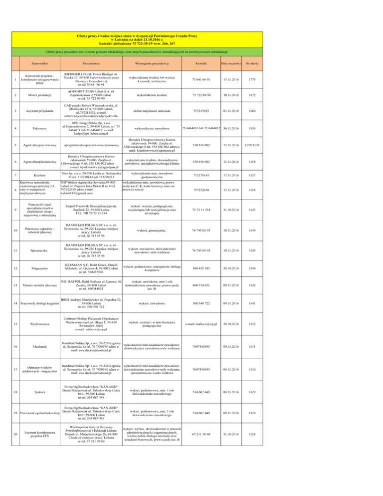 Oferty pracy i wolne miejsca stażu w dyspozycji Powiatowego Urzędu Pracy w Lubaniu na dzień 21.10.2016 r. kontakt telefoniczny 75 722-35-19 wew. 266, 267 Oferty pracy pracodawców z terenu powiatu lubańskiego oraz innych pracodawców zatrudniających na terenie powiatu lubańskiego Stanowisko Pracodawca Wymagania pracodawcy Kontakt Data ważności Nr oferty 1 Kierownik projektu koordynator przygotowania pracy RIEDIGER LEGAL Denis Riediger ul. Tkacka 13, 59-800 Lubań (miejsce pracy Niemcy - Krauschwitz) ne tel 75 641 66 91 wykształcenie średnie lub wyższe kierunek: techniczne 75 641 66 91 15.11.2016 1773 2 Mistrz produkcji AGROMET ZEHS Lubań S.A. ul. Esperantystów 2 59-00 Lubań nr tel. 75 722 80 90 wykształcenie średnie 75 722 80 90 30.11.2016 1172 3 Asystent projekanta CAD pojekt Robert Wieczorkowski, ul. Moniuszki 10 A, 59-800 Lubań, tel.757215525, e-mail: [email protected] dobra znajomość autocada 757215525 01.11.2016 1160 4 Pakowacz SPS Usługi Polska Sp. z.o.o ul.Esperantystów 2, 59-800 Lubań, tel. 75 6464011 lub 75 6464012, e-mail: [email protected] wykształcenie zawodowe 75 6464011 lub 75 6464012 30.11.2016 1159 5 Agent ubezpieczeniowy specjalista ubezpieczeniowo-finansowy Doradca Ubezpieczeniowy Karina Jakimionek 59-800 Zaręba ul. J.Słowackiego 8 tel. 530 856 002 adres email: [email protected] 530 856 002 15.11.2016 1158/1139 6 Agent ubezpieczeniowy Doradca Ubezpieczeniowy Karina Jakimionek 59-800 Zaręba ul. J.Słowackiego 8 tel. 530 856 002 adres e-mail: [email protected] wykształcenie średnie, doswiadzcenie zawodowe: sprzedażowe,obsuga klienta 530 856 002 15.11.2016 1158 wykształcenie min. zawodowe gastronomiczne 713270143 17.11.2016 1157 757232610 15.11.2016 1156 7 8 Kucharz Kierowca samochodu ciężarowego powyżej 3,5 tony w transporcie międzynarodowym Niro Sp. z o.o. 59-300 Lubin ul. Ścinawska 37 tel. 713270143 lub 713270213 PHP Wektor Agnieszka Sawicka 59-800 Lubań ul. Papieża Jana Pawła II nr 4 tel. 757232610 adres e-mail: [email protected] wykształcenie min. zawodowe, prawo jazdy kat.C+E, karta kerowcy, kurs na przewóz rzeczy 9 Nauczyciel zajęć specjalistycznych o charakterze terapii zajęciowej z arteterapią Zespół Placówek Resocjalizacyjnych, Smolnik 22, 59-820 Leśna TEL. NR 75/72 11 354 wykszt. wyższe, pedagogiczne, socjoterapia lub resocjalizacja oraz arteterapia 75 72 11 354 31.10.2016 1147 10 Pakowacz odpadów robotnik placowy RANDSTAD POLSKA SP. z o. o. ul. Ścinawska 1a, 59-220 Legnica (miejsce pracy: Lubań) nr tel. 76 745 05 95 wykszt. gimnazjalne, 76 745 05 95 10.11.2016 1146 11 Sprzataczka RANDSTAD POLSKA SP. z o. o. ul. Ścinawska 1a, 59-220 Legnica (miejsce pracy: Lubań) nr tel. 76 745 05 95 wykszt. zawodowe, doświadczenie zawodowe mile widziane 76 745 05 95 10.11.2016 1145 12 Magazynier KERMAAN S.C. Rafał Gruca, Daniel Jabłoński, ul. Gazowa 4, 59-800 Lubań nr tel. 504435546 wykszt. podstawowe, umiejętność obsługi komputera 504 435 543 30.10.2016 1144 13 Monter stolarki okiennej PHU RAFPOL Rafał Szklany ul. Lipowa 10, wykszt. zawodowe, min 1 rok Zaręba, 59-800 Lubań doświadczenia zawodowe, prawo jazdy nr tel. 600314621 kat. B. 600 314 621 09.11.2016 1142 BBUI Andrzej Miszkiewicz ul. Pogodna 32, 59-800 Lubań nr tel. 500 540 722 wykszt. zawodowe 500 540 722 09.11.2016 1141 Centrum Obsługi Placówek Opiekuńczo Wychowawczych ul. Długa 1, 59-850 Świeradów Zdrój e-mail: [email protected] wykszt. wyższe ( w tym licencjat), pedagogiczne e-mail: [email protected] 30.10.2016 1132 14 Pracownik obsługi kręgielni 15 Wychowawca 16 Mechanik Randstad Polska Sp. z o.o. 59-220 Legnica wyksztacenie min.zasadnicze zawodowe, ul. Ścinawska 1a tel. 76 7450595 adres edoświadczenie zawodowe-mile widziane mail: [email protected] 7607450595 09.11.2016 1131 17 Operator wózków jezdnowych - magazynier Randstad Polska Sp. z o.o. 59-220 Legnica wyksztacenie min.zasadnicze zawodowe, ul. Ścinawska 1a tel. 76 7450595 adres e- doświadczenie zawodowe-mile widziane, mail: [email protected] uprawnienia na wózki widłowe 7607450595 09.11.2016 1130 18 Tynkarz Firma Ogólnobudowlana "DAN-BUD" Daniel Krakowiak ul. Skłodowskiej-Curie 10/1, 59-800 Lubań nr tel. 534 067 449 wykszt. podstawowe, min. 1 rok doświadczenia zawodowego 534 067 449 08.11.2016 1129 Firma Ogólnobudowlana "DAN-BUD" Daniel Krakowiak ul. Skłodowskiej-Curie 10/1, 59-800 Lubań nr tel. 534 067 449 wykszt. podstawowe, min. 1 rok doświadczenia zawodowego 534 067 449 08.11.2016 1129 Wielkopolski Instytut Rozwoju Przedsiębiorczości i Edukacji Łukasz Dymek ul. Małachowskigo 2b, 64-800 Chodzież (miejsce pracy: Lubań) nr tel. 67 211 30 60 wykszt. wyższe, doświadczenie w pracach administracyjnych i organizacyjnych, bardzo dobra obsługa internetu oraz urządzeń biurowych, prawo jazdy kat. B 67 211 30 60 31.10.2016 1128 19 Pracownik ogólnobudowlany 20 Asystent koordynatora projektu EFS 21 Pracownik organizacyjnoadministracyjny projektu EFS Wielkopolski Instytut Rozwoju Przedsiębiorczości i Edukacji Łukasz Dymek ul. Małachowskigo 2b, 64-800 Chodzież (miejsce pracy: Lubań) nr tel. 67 211 30 60 wykszt. min. średnie, doświadczenie w pracach administracyjnych i organizacyjnych, bardzo dobra obsługa internetu oraz urządzeń biurowych, prawo jazdy kat. B 67 211 30 60 31.10.2016 1127 22 Pracownik ds. rekrutacji uczestników i promocji projektu Wielkopolski Instytut Rozwoju Przedsiębiorczości i Edukacji Łukasz Dymek ul. Małachowskigo 2b, 64-800 Chodzież (miejsce pracy: Lubań) nr tel. 67 211 30 60 wykszt. zawodowe, doświadczenie zawodowe mile widziane, wysokie zdolności interpersonalne, wysoka kreatywność i zaangażowanie w powierzone zadania, samodzielność 67 211 30 60 31.10.2016 1126 23 Spawacz KONSTAL Sp. z o.o. ul. Gazowa 4, 59-800 wykszt. podstawowe, uprawnienia Lubań spawacza, doświadczenie zawodowe mile nr tel. 75 645 53 50/605 030 049 widziane 75 645 53 50 05.11.2016 1124 24 Tokarz KONSTAL Sp. z o.o. ul. Gazowa 4, 59-800 Lubań nr tel.