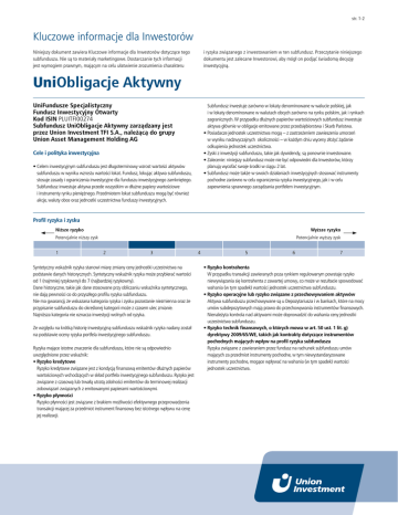 str. 1-2 Kluczowe informacje dla Inwestorów Niniejszy dokument zawiera Kluczowe informacje dla Inwestorów dotyczące tego subfunduszu. Nie są to materiały marketingowe. Dostarczanie tych informacji jest wymogiem prawnym, mającym na celu ułatwienie zrozumienia charakteru i ryzyka związanego z inwestowaniem w ten subfundusz. Przeczytanie niniejszego dokumentu jest zalecane Inwestorowi, aby mógł on podjąć świadomą decyzję inwestycyjną. UniObligacje Aktywny UniFundusze Specjalistyczny Fundusz Inwestycyjny Otwarty Kod ISIN PLUITFI00274 Subfundusz UniObligacje Aktywny zarządzany jest przez Union Investment TFI S.A., należącą do grupy Union Asset Management Holding AG Subfundusz inwestuje zarówno w lokaty denominowane w walucie polskiej, jak i w lokaty denominowane w walutach obcych zarówno na rynku polskim, jak i rynkach zagranicznych. W przypadku dłużnych papierów wartościowych subfundusz inwestuje aktywa głównie w obligacje emitowane przez przedsiębiorstwa i Skarb Państwa. • Posiadacze jednostek uczestnictwa mogą – z zastrzeżeniem zawieszenia umorzeń w wyniku nadzwyczajnych okoliczności – w każdym dniu wyceny złożyć żądanie odkupienia jednostek uczestnictwa. • Zyski z inwestycji subfunduszu, takie jak dywidendy, są ponownie inwestowane. • Zalecenie: niniejszy subfundusz może nie być odpowiedni dla Inwestorów, którzy planują wycofać swoje środki w ciągu 2 lat. • Subfundusz może także w swoich działaniach inwestycyjnych stosować instrumenty pochodne zarówno w celu ograniczenia ryzyka inwestycyjnego, jak i w celu zapewnienia sprawnego zarządzania portfelem inwestycyjnym. Cele i polityka inwestycyjna • Celem inwestycyjnym subfunduszu jest długoterminowy wzrost wartości aktywów subfunduszu w wyniku wzrostu wartości lokat. Fundusz, lokując aktywa subfunduszu, stosuje zasady i ograniczenia inwestycyjne dla funduszu inwestycyjnego zamkniętego. Subfundusz inwestuje aktywa przede wszystkim w dłużne papiery wartościowe i instrumenty rynku pieniężnego. Przedmiotem lokat subfunduszu mogą być również akcje, waluty obce oraz jednostki uczestnictwa funduszy inwestycyjnych. Profil ryzyka i zysku Niższe ryzyko Wyższe ryzyko Potencjalnie niższy zysk Potencjalnie wyższy zysk 1 2 3 Syntetyczny wskaźnik ryzyka stanowi miarę zmiany ceny jednostki uczestnictwa na podstawie danych historycznych. Syntetyczny wskaźnik ryzyka może przybierać wartości od 1 (najmniej ryzykowny) do 7 (najbardziej ryzykowny). Dane historyczne, takie jak dane stosowane przy obliczaniu wskaźnika syntetycznego, nie dają pewności co do przyszłego profilu ryzyka subfunduszu. Nie ma gwarancji, że wskazana kategoria ryzyka i zysku pozostanie niezmienna oraz że przypisanie subfunduszu do określonej kategorii może z czasem ulec zmianie. Najniższa kategoria nie oznacza inwestycji wolnych od ryzyka. Ze względu na krótką historię inwestycyjną subfunduszu wskaźnik ryzyka nadany został na podstawie oceny ryzyka portfela inwestycyjnego subfunduszu. Ryzyka mające istotne znaczenie dla subfunduszu, które nie są odpowiednio uwzględnione przez wskaźnik: • Ryzyko kredytowe Ryzyko kredytowe związane jest z kondycją finansową emitentów dłużnych papierów wartościowych wchodzących w skład portfela inwestycyjnego subfunduszu. Ryzyko jest związane z czasową lub trwałą utratą zdolności emitentów do terminowej realizacji zobowiązań związanych z emitowanymi papierami wartościowymi. • Ryzyko płynności Ryzyko płynności jest związane z brakiem możliwości efektywnego przeprowadzenia transakcji mającej za przedmiot instrument finansowy bez istotnego wpływu na cenę jej realizacji. 4 5 6 7 • Ryzyko kontrahenta W przypadku transakcji zawieranych poza rynkiem regulowanym powstaje ryzyko niewywiązania się kontrahenta z zawartej umowy, co może w rezultacie spowodować wahania (w tym spadek) wartości jednostek uczestnictwa subfunduszu. • Ryzyko operacyjne lub ryzyko związane z przechowywaniem aktywów Aktywa subfunduszu przechowywane są u Depozytariusza i w bankach, które na mocy umów subdepozytowych mają prawo do przechowywania instrumentów finansowych. Nienależyta kontrola nad aktywami może doprowadzić do wahania ceny jednostki uczestnictwa subfunduszu. • Ryzyko technik finansowych, o których mowa w art. 50 ust. 1 lit. g) dyrektywy 2009/65/WE, takich jak kontrakty dotyczące instrumentów pochodnych mających wpływ na profil ryzyka subfunduszu Ryzyka związane z zawieraniem przez fundusz na rachunek subfunduszu umów mających za przedmiot instrumenty pochodne, w tym niewystandaryzowane instrumenty pochodne, mogące wpływać na wahania (w tym spadek) wartości jednostek uczestnictwa. str. 2-2 Kluczowe informacje dla Inwestorów UniObligacje Aktywny Opłaty • Opłaty ponoszone przez Inwestora służą pokryciu kosztów związanych z działalnością subfunduszu, w tym kosztów dystrybucji i kosztów wprowadzenia do obrotu. • Opłaty te zmniejszają potencjalny wzrost inwestycji. • Opłaty za nabycie i umorzenie jednostek uczestnictwa podawane są w wysokości maksymalnej. W niektórych przypadkach Inwestor może wnosić niższą opłatę. Informacje dotyczące bieżącej wysokości opłat można uzyskać w placówkach dystrybutorów oraz w Punkcie Obsługi Klienta TFI. • Wartość liczbowa określająca wysokość opłat bieżących opiera się na wydatkach z roku 2016, w związku z czym wysokość opłat bieżących może co roku ulegać zmianie. Podana wartość opłat bieżących ma charakter szacunkowy na dzień 31.01.2017 r. i może podlegać korekcie po publikacji rocznego sprawozdania finansowego. • Szczegółowe zasady dotyczące opłat znajdują się w prospekcie informacyjnym UniFunduszeSFIO w pkt. 36. Prospekt informacyjny jest dostępny na stronie internetowej www.union-investment.pl. Opłaty jednorazowe pobierane przed lub po dokonaniu inwestycji Opłata za nabycie jednostek uczestnictwa 