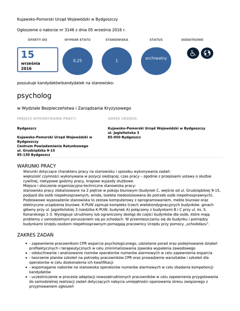 Kujawsko-Pomorski Urząd Wojewódzki w Bydgoszczy Ogłoszenie o naborze nr 3146 z dnia 05 września 2016 r. OFERTY DO 15 września 2016 WYMIAR ETATU STANOWISKA 0,25 1 STATUS DODATKOWE archiwalny poszukuje kandydatów\kandydatek na stanowisko: psycholog w Wydziale Bezpieczeństwa i Zarządzania Kryzysowego MIEJSCE WYKONYWANIA PRACY: ADRES URZĘDU: Bydgoszcz Kujawsko-Pomorski Urząd Wojewódzki w Bydgoszczy ul. Jagiellońska 3 85-950 Bydgoszcz Kujawsko-Pomorski Urząd Wojewódzki w Bydgoszczy Centrum Powiadamiania Ratunkowego ul. Grudziądzka 9-15 85-130 Bydgoszcz WARUNKI PRACY Warunki dotyczące charakteru pracy na stanowisku i sposobu wykonywania zadań: większość czynności wykonywana w pozycji siedzącej; czas pracy – zgodnie z przepisami ustawy o służbie cywilnej, nietypowe godziny pracy, krajowe wyjazdy służbowe. Miejsce i otoczenie organizacyjno-techniczne stanowiska pracy: stanowisko pracy zlokalizowane na 2 piętrze w pokoju biurowym (budynek C, wejście od ul. Grudziądzkiej 9-15, podjazd dla osób niepełnosprawnych, winda, toaleta niedostosowana do potrzeb osób niepełnosprawnych). Podstawowe wyposażenie stanowiska to zestaw komputerowy z oprogramowaniem, meble biurowe oraz elektryczne urządzenia biurowe. K-PUW zajmuje kompleks trzech wielokondygnacyjnych budynków: gmach główny przy ul. Jagiellońskiej 3 (siedziba K-PUW, budynek A) połączony z budynkami B i C przy ul. ks. S. Konarskiego 1-3. Występuje utrudniony lub ograniczony dostęp do części budynków dla osób, które mają problemy z samodzielnym poruszaniem się po schodach. W przemieszczaniu się do budynku i pomiędzy budynkami Urzędu osobom niepełnosprawnym pomagają pracownicy Urzędu przy pomocy „schodołazu”. ZAKRES ZADAŃ - zapewnienie pracownikom CPR wsparcia psychologicznego, udzielanie porad oraz podejmowanie działań profilaktycznych i terapeutycznych w celu zminimalizowania zjawiska wypalenia zawodowego - odsłuchiwanie i analizowanie rozmów operatorów numerów alarmowych w celu zapewnienia wsparcia - tworzenie planów szkoleń na potrzeby pracowników CPR oraz prowadzenie warsztatów i szkoleń dla operatorów w celu doskonalenia ich kwalifikacji - wspomaganie naborów na stanowiska operatorów numerów alarmowych w celu zbadania kompetencji kandydatów - uczestniczenie w procesie adaptacji nowozatrudnionych pracowników w celu zapewnienia przygotowania do samodzielnej realizacji zadań dotyczących nabycia umiejętności opanowania stresu związanego z przyjmowaniem zgłoszeń WYMAGANIA NIEZBĘDNE Wykształcenie: wyższe psychologiczne doświadczenie zawodowe: 2 lata w obszarze udzielania wsparcia psychologicznego - znajomość ustaw: o ochronie danych osobowych, o Państwowym Ratownictwie Medycznym, o systemie powiadamiania ratunkowego - znajomość rozporządzenia Ministra Administracji i Cyfryzacji w sprawie organizacji i funkcjonowania centrów powiadamiania ratunkowego - umiejętność obsługi komputera i urządzeń biurowych - umiejętność obsługi programów komputerowych, w tym pakietu MS Office - myślenie kreatywne, dobra organizacja pracy i nastawienie na osiąganie rezultatów, efektywna komunikacja Posiadanie obywatelstwa polskiego albo obywatelstwa innego państwa Unii Europejskiej albo obywatelstwa innego państwa, którego obywatele na podstawie umów międzynarodowych lub przepisów prawa wspólnotowego posiadają prawo podjęcia zatrudnienia na terytorium Rzeczypospolitej Polskiej Korzystanie z pełni praw publicznych Nieskazanie prawomocnym wyrokiem za umyślne przestępstwo lub umyślne przestępstwo skarbowe WYMAGANIA DODATKOWE doświadczenie zawodowe: 1 rok w obszarze udzielania wsparcia psychologicznego pracownikom podmiotów ratowniczych lub udzielania pomocy ofiarom wypadków znajomość ustaw: o wojewodzie i administracji rządowej w województwie, o służbie cywilnej wraz z aktami wykonawczymi, o ochronie informacji niejawnych DOKUMENTY I OŚWIADCZENIA NIEZBĘDNE Życiorys/CV i list motywacyjny Kopie dokumentów potwierdzających spełnienie wymagania niezbędnego w zakresie wykształcenia Kopie dokumentów potwierdzających spełnienie wymagania niezbędnego w zakresie doświadczenia zawodowego / stażu pracy Oświadczenie o posiadanym obywatelstwie albo kopia dokumentu potwierdzającego posiadane obywatelstwo W przypadku osób nieposiadających obywatelstwa polskiego - kopia dokumentu potwierdzającego znajomość języka polskiego zgodnie z rozporządzeniem Prezesa Rady Ministrów w sprawie określenia rodzajów dokumentów potwierdzających znajomość języka polskiego przez osoby nieposiadające obywatelstwa polskiego, ubiegające się o zatrudnienie w służbie cywilnej Oświadczenie o wyrażeniu zgody na przetwarzanie danych osobowych do celów naboru Oświadczenie o korzystaniu z pełni praw publicznych Oświadczenie o nieskazaniu prawomocnym wyrokiem za umyślne przestępstwo lub umyślne przestępstwo skarbowe DOKUMENTY I OŚWIADCZENIA DODATKOWE kopia dokumentu potwierdzającego niepełnosprawność - w przypadku kandydatek/kandydatów, zamierzających skorzystać z pierwszeństwa w zatrudnieniu w przypadku, gdy znajdą się w gronie najlepszych kandydatek/kandydatów Kopie dokumentów potwierdzających spełnienie wymagania dodatkowego w zakresie doświadczenia zawodowego / stażu pracy TERMINY I MIEJSCE SKŁADANIA DOKUMENTÓW Dokumenty należy złożyć do: 15 września 2016 r. Decyduje data: stempla pocztowego / osobistego dostarczenia oferty do urzędu Miejsce składania dokumentów: Kujawsko-Pomorski Urząd Wojewódzki w Bydgoszczy Kancelaria ogólna, pokój 4 ul. ks. S. Konarskiego 1-3, 85-066 Bydgoszcz z dopiskiem: „psycholog WBZK” INNE INFORMACJE: W miesiącu poprzedzającym datę upublicznienia ogłoszenia wskaźnik zatrudnienia osób niepełnosprawnych w urzędzie, w rozumieniu przepisów o rehabilitacji zawodowej i społecznej oraz zatrudnianiu osób niepełnosprawnych, nie wynosi co najmniej 6%. Nasz Urząd jest pracodawc