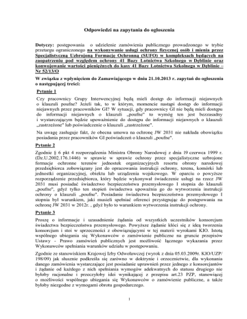 Odpowiedzi na zapytania do ogłoszenia Dotyczy: postępowania o udzielenie zamówienia publicznego prowadzonego w trybie przetargu ograniczonego na wykonywanie usługi ochrony fizycznej osób i mienia przez Specjalistyczną Uzbrojoną Formację Ochronną (SUFO) w kompleksach będących na zaopatrzeniu pod względem ochrony 41 Bazy Lotnictwa Szkolnego w Dęblinie oraz konwojowanie wartości pieniężnych do kasy 41 Bazy Lotnictwa Szkolnego w Dęblinie – Nr 52/13/O W związku z wpłynięciem do Zamawiającego w dniu 21.10.2013 r. zapytań do ogłoszenia o następującej treści: Pytanie 1 Czy pracownicy Grupy Interwencyjnej będą mieli dostęp do informacji niejawnych o klauzuli poufne? Jeżeli tak, to w którym, momencie nastąpi dostęp do informacji niejawnych przez pracowników GI? W sytuacji, gdy pracownicy GI nie będą mieli dostępu do informacji niejawnych o klauzuli „poufne" to wymóg ten jest bezzasadny i wystarczającym będzie upoważnienie do dostępu do informacji niejawnych o klauzuli „zastrzeżone" lub poświadczenie o klauzuli „zastrzeżone". Na uwagę zasługuje fakt, że obecna umowa na ochronę JW 2031 nie nakłada obowiązku posiadania przez pracowników GI poświadczeń o klauzuli „poufne". Pytanie 2 Zgodnie § 6 pkt 4 rozporządzenia Ministra Obrony Narodowej z dnia 19 czerwca 1999 r. (Dz.U.2002.176.1446) w sprawie w sprawie ochrony przez specjalistyczne uzbrojone formacje ochronne terenów jednostek organizacyjnych resortu obrony narodowej przedsiębiorca zobowiązany jest do opracowania instrukcji ochrony, terenu, komórki lub jednostki organizacyjnej, obiektu lub urządzenia wojskowego. W oparciu o powyższe rozporządzenie przedsiębiorca, który będzie wykonywał świadczenie usługi na rzecz JW 2031 musi posiadać świadectwo bezpieczeństwa przemysłowego I stopnia do klauzuli „poufne", gdyż tylko ten stopień świadectwa upoważnia go do wytworzenia instrukcji ochrony o klauzuli „poufne". Posiadanie świadectwa bezpieczeństwa przemysłowego I stopnia był warunkiem, jaki musieli spełniać oferenci przystępując do postępowania na ochronę JW 2031 w 2012r. , gdyż było to warunkiem wytworzenia instrukcji ochrony. Pytanie 3 Proszę o informacje i uzasadnienie żądania od wszystkich uczestników konsorcjum świadectwa bezpieczeństwa przemysłowego. Powyższe żądanie kłóci się z ideą tworzenia konsorcjum i stoi w sprzeczności z obowiązującymi w tej materii wyrokami KIO. Istotą wspólnego ubiegania się Wykonawców o zamówienie publiczne na gruncie przepisów Ustawy - Prawo zamówień publicznych jest możliwość łącznego wykazania przez Wykonawców spełniania warunków udziału w postępowaniu. Zgodnie ze stanowiskiem Krajowej Izby Odwoławczej (wyrok z dnia 05.03.2009r. KIO/UZP/ 198/09) jak słusznie podkreśla się zarówno w doktrynie i orzecznictwie, dla wykonania danego zamówienia wystarczające jest posiadanie uprawnień przez jednego z konsorcjantów i żądanie od każdego z nich spełniania wymogów adekwatnych do statusu drugiego nie byłoby racjonalne i przeczyłoby idei wynikającej z przepisu art.23 PZP, stanowiącej o możliwości wspólnego ubiegania się Wykonawców o zamówienie publiczne, a także byłoby niezgodne z wymogami obrotu gospodarczego. 1 Pytanie 4 Proszę o informacje i uzasadnienie zakazu podwykonawstwa w zakresie podjazdu GI. Powyższy zakaz kłóci się z ideą tworzenia konsorcjum i stoi w sprzeczności z obowiązującymi w tej materii wyrokami KIO. NA uwagę zasługuje fakt, że inni wykonawcy podlegli MON w organizowanych postępowaniach przetargowych na ochronę dopuszczają podwykonawstwo w zakresie GI (np. JW 2305, 34 WOG. Nie bez znaczenia jest fakt, że w poprzednich latach zamawiający organizując postępowania na ochronę min. Jednostki Wojskowej w Głuścu nie wyrażał zgody na podwykonawstwo, a obecny Zamawiający tj. 34 WOG stoi na zupełnie innym stanowisku w przedmiotowej sprawie i istnieje możliwość podwykonawstwa w zakresie GI). Uzasadnienie Zamawiającego; „Ze względu na specyfikę wykonywanych zadań ochronnych (obiekty podlegające szczególnej ochronie m.in. magazyny broni i amunicji) i priorytet zapewnienia maksymalnego bezpieczeństwa, Zamawiający nie dopuszcza powierzenia realizacji zamówienia albo jego części podwykonawcom dla żadnego z zadań (art. 36 ust 5 ustawy Prawo zamówień publicznych). Dotyczy to również działania Grupy Interwencyjnej." Uzasadnienie jakim argumentuje Zamawiający swoje stanowisko w przedmiotowej sprawie jest sprzeczne z obowiązującymi przepisami i faworyzuje firmę, która obecnie realizuje zadania na rzecz Zamawiającego. Na uwagę zasługuje również fakt, że m.in. magazyny broni i amunicji są chronione przez pracowników ochrony wyposażonych w broń palną, a w razie zagrożenia dowódca zmiany ma do dyspozycji pracowników z tzw. zmiany czuwającej, których czas reakcji jest znacznie krótszy niż GI. Mając powyższe na uwadze wnosimy o dokonanie stosownych zmian i dopuszczenie podwykonawstwa w zakresie GI. Zamawiający udziela następujących odpowiedzi: Odpowiedź na pytanie 1: Wymóg posiadania ważnych poświadczeń bezpieczeństwa o klauzuli „poufne” lub wyższej dotyczy tylko zadania nr 2 i pracowników Wykonawcy (Wykonawców) realizujących ochronę 144 prdz oraz grupy interwencyjnej przeznaczonej do wzmocnienia ochrony tego obiektu. Zgodnie z § 18 pkt 9 umowy (str. 194 SIWZ): Pkt 9. Za każdy przypadek stwierdzenia iż stan psychofizyczny, osoby realizującej z ramienia Wykonawcy zadania ochronne (np. choroba, przemęczenie, stan upojenia alkoholowego itp.) nie pozwala na sprawne realizowanie zadań ochronnych w danym kompleksie (obiekcie) zostanie na Wykonawcę nałożona kara w wysokości 2 000 zł, ponadto Wykonawca zobowiązany jest w ciągu 2 godzin wystawić inną osobę spełniającą wymagania stawiane w danym kompleksie (obiekcie), a do czasu jej przybycia zostanie wezwana grupa interwencyj