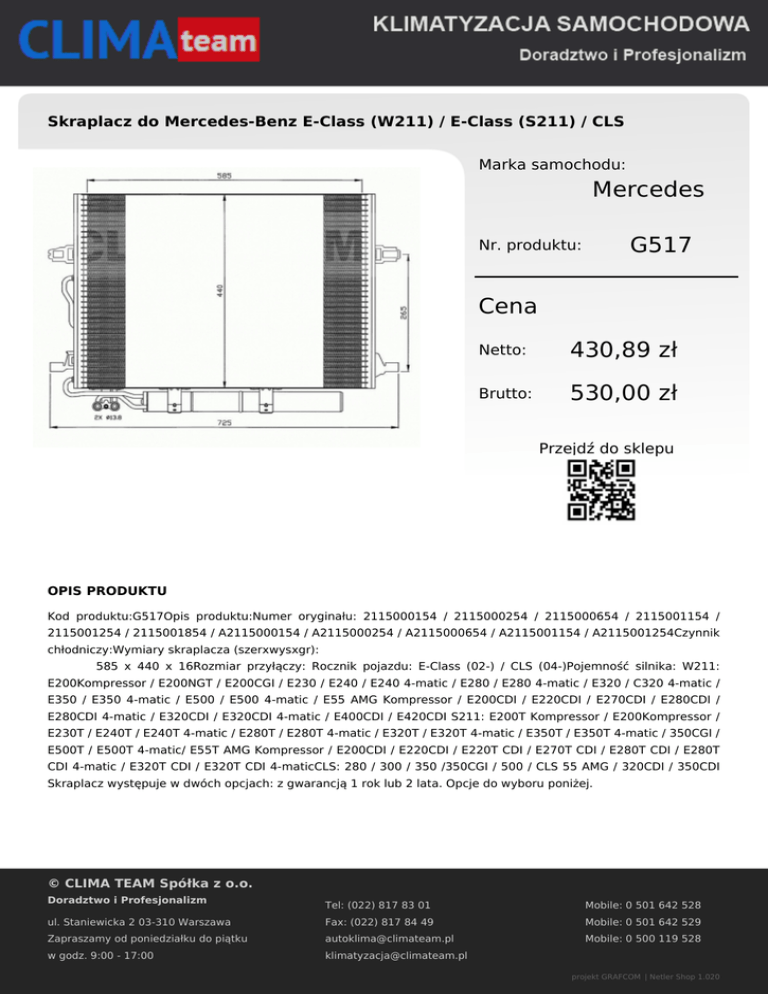Skraplacz do Mercedes-Benz E-Class (W211) / E-Class (S211) / CLS Marka samochodu: Mercedes G517 Nr. produktu: Cena Netto: 430,89 zł Brutto: 530,00 zł Przejdź do sklepu OPIS PRODUKTU Kod produktu:G517Opis produktu:Numer oryginału: 2115000154 / 2115000254 / 2115000654 / 2115001154 / 2115001254 / 2115001854 / A2115000154 / A2115000254 / A2115000654 / A2115001154 / A2115001254Czynnik chłodniczy:Wymiary skraplacza (szerxwysxgr): 585 x 440 x 16Rozmiar przyłączy: Rocznik pojazdu: E-Class (02-) / CLS (04-)Pojemność silnika: W211: E200Kompressor / E200NGT / E200CGI / E230 / E240 / E240 4-matic / E280 / E280 4-matic / E320 / C320 4-matic / E350 / E350 4-matic / E500 / E500 4-matic / E55 AMG Kompressor / E200CDI / E220CDI / E270CDI / E280CDI / E280CDI 4-matic / E320CDI / E320CDI 4-matic / E400CDI / E420CDI S211: E200T Kompressor / E200Kompressor / E230T / E240T / E240T 4-matic / E280T / E280T 4-matic / E320T / E320T 4-matic / E350T / E350T 4-matic / 350CGI / E500T / E500T 4-matic/ E55T AMG Kompressor / E200CDI / E220CDI / E220T CDI / E270T CDI / E280T CDI / E280T CDI 4-matic / E320T CDI / E320T CDI 4-maticCLS: 280 / 300 / 350 /350CGI / 500 / CLS 55 AMG / 320CDI / 350CDI Skraplacz występuje w dwóch opcjach: z gwarancją 1 rok lub 2 lata. Opcje do wyboru poniżej. © CLIMA TEAM Spółka z o.o. Doradztwo i Profesjonalizm Tel: (022) 817 83 01 Mobile: 0 501 642 528 ul. Staniewicka 2 03-310 Warszawa Fax: (022) 817 84 49 Mobile: 0 501 642 529 Zapraszamy od poniedziałku do piątku [email protected] Mobile: 0 500 119 528 w godz. 9:00 - 17:00 [email protected] projekt GRAFCOM | Netler Shop 1.020