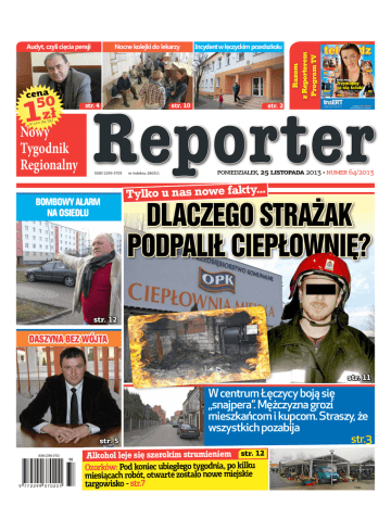 01_okl Telewidz 48_Layout 1 11/20/13 11:26 AM Strona 1 str. 4 str. 10 str. 2 15 stacji telewizyjnych omówienia filmowe 1 ISSN 2081-5360 DATA WYDANIA: 25.11.2013 numer 48 (179) Incydent w łęczyckim przedszkolu 29.11.–5.12.2013 program telewizyjny film „Listy do M.” PT 20.00 TVN familijny „Alicja w Krainie Czarów” ND 12.00 TV PULS serial Wypadek Magdy „Na Wspólnej” PON–czw 20.05 TVN Monika Hojnisz rozrywka fot. EUROSPORT Nocne kolejki do lekarzy Razem z Reporterem Program TV 25 LISTOPADA 2013pensji Audyt, czyli cięcia Nowy Tygodnik Regionalny Wielki finał „Mam talent!” SOB 20.00 TVN Trzymajmy za nią kciuki Biathlon: Zawody PŚ w Ostersund – bieg pościgowy kobiet sport ND 11.00 EUROSPORT serial Nowość w TVP ND „Krew z krwi” 21.10 TVP 2 •REKLAMA• str. 11 % VAT Nowy Tygodnik Regionalny w tym 8 ISSN 2299-3703 Bombowy alarm na osiedlu nr indeksu 286311 poniedziaŁEK, 25 LISTOPADA 2013 • numer 64/2013 Tylko u nas nowe fakty... DLACZEGO STRAŻAK PODPALIŁ CIEPŁOWNIĘ? str. 12 Daszyna bez wójta str. 11 str. 5 98 W centrum Łęczycy boją się „snajpera”. Mężczyzna grozi mieszkańcom i kupcom. Straszy, że wszystkich pozabija str.3 Alkohol leje się szerokim strumieniem str. 12 Ozorków: Pod koniec ubiegłego tygodnia, po kilku miesiącach robót, otwarte zostało nowe miejskie targowisko - str.7 str. 2 2 Nowy Tygodnik Regionalny Dyskusja po naszej publikacji Pracujących emerytów jest więcej. Czytelnicy piszą do redakcji 25 LISTOPADA 2013 Na początku dziury, na końcu błoto Adam Sobiński - „Szkoda, że z wyremontowanej drogi wjeżdża się w dziury” ŁĘCZYCA Z dużym zainteresowaniem spotkał się nasz ubiegłotygodniowy tekst, w którym opisaliśmy urzędników miejscowego magistratu oraz starostwa nadal pracujących pomimo nabytych uprawnień emerytalnych. W tej sprawie odebraliśmy w redakcji wiele telefonów, strumieniem płynęły też mejle od osób zbulwersowanych postawą urzędników. Publikujemy jeden z mejli: „Witam, piszę do Was z wiadomością ile osób w wieku emerytalnym, a raczej ile osób nie powinno już pracować w urzędzie miejskim a jeszcze piastują swoje stanowiska. Są to na pewno 3 osoby. Tak jak piszecie w artykule jest to naczelnik wydziału oświaty, ale jeszcze pani Sz. z referatu finansowego i słynny kierowca burmistrza czyli “pan Kaziu”, (że ten człowiek jeszcze jeździ autem, on mało co słyszy – przyp. autora listu). W następnym artykule można zbierając informację zapytać panią Krzysztofę Łuczak, choćby o “pana Kazia” . Proponuję się też przyjrzeć jednemu z pracowników Urzędu Miasta, który ma problem z alkoholem był już kilka razy na terapii i łaskawy burmistrz nie potrafi go zwolnić. Ta osoba wszczęła awanturę domową i została zawieziona na komendę policji. Ten urzędnik rzucał się na policjantów. I co? Burmistrz Olszewski zostawia takich ludzi. To skandal! Szkoda mi młodych ludzi, którzy nie mogą znaleźć pracy a takie osoby, które biorą pensję i korzystają z emerytury lub pijaki pracują. To nie jest sprawiedliwe. Cała władza i kierownicy są do zmiany, to jedna wielka klika i rodzina, która nie pozwoli osobom spoza ich kręgu dostać się do pracy w urzędzie” - czytamy w nadesłanym liście. Obiecujemy, że bliżej przyjrzymy się doniesieniom naszych Czytelników. W sprawie wysłaliśmy już pytania do rzeczniczki magistratu. Czekamy na odpowiedź. (stop) ŁĘCZYCA Wprawdzie ul. Staromiejska została niedawno oddana po remoncie do użytku, jednak nie brakuje krytycznych opinii kierowców oraz pieszych. Główne skargi dotyczą niedokończonego remontu od strony krajowej jedynki. Tym bardziej, że od tej strony pozostały zaledwie dwa metry drogi, która jest nierówna i dziurawa. Czy nie mogli już wyremontować tych dwóch metrów? - pytają kierowcy. Domyślamy się, że akurat ten pozostawiony odcinek nie należy do miasta. Pomimo tego powinien zostać przez miasto wyremontowany. Kosztami tych prac powinna zostać obciążona dyrekcja dróg krajowych. A tak wyjeżdża się z wyremontowanej ulicy wprost na dziury. Skarżą się również piesi. Robotnicy pozostawili bowiem niewyremontowany chodnik. Teraz przechodnie z nowego chodnika przylegającego do zmodernizowanej Staromiejskiej wchodzą na zdewastowany trotuar na którym brakuje nawet płyt. Ulica Staromiejska nie została wyremontowana na całej długości. Dlatego jadąc w stronę miejskiego schroniska wjeżdża się na nieutwardzoną drogę. - Burmistrz obiecał, że w przyszłym roku remont zostanie dokończony. Mamy nadzieję, że dotrzyma słowa – powiedzieli nam mieszkańcy. (stop) Przedszkolanka krzyczała i szarpała moje dziecko – skarży się matka ŁĘCZYCA W ubiegłym tygodniu do redakcji zadzwoniła jedna z matek malucha z przedszkola nr 1. Usłyszeliśmy, że nerwowe przedszkolanki krzyczą, straszą i szarpią dzieci. - Najgorsza jest Anna W. (nazwisko do wiadomości red.) - twierdzi nasza rozmówczyni. - Dziecko powiedziało w domu, że pani krzyczała na nie i szarpała. Rozmawiałam z innymi rodzicami i niektórzy potwierdzili, że ta przedszkolanka także w nieodpowiedni sposób obchodziła się z ich dziećmi. Przecież przedszkole powinno być miejscem w którym dziecko czuje się bezpiecznie i nie ma żadnych stresów – usłyszeliśmy. Joanna Stańczyk, dyrektor PM nr 1, nie ukrywa zaskoczenia. - Szkoda, że matka tego dziecka nie przyszła z tym oskarżeniem do mnie a udała się od razu do gazety. Jestem przekonana, że do takiej sytuacji nie doszło, choć oczywiście porozmawiam z panią w stosunku do której wysuwa się takie skargi. Dyrektorka „jedynki” powiedziała nam, że niektórzy rodzice błędnie in- terpretują zachowanie przedszkolanek. - Akurat ta nauczycielka wychowania przedszkolnego jest wymagająca, konkretna i stanowcza – mówi J. Stańczyk. - Muszę podkreślić, że ma dobre wyniki w nauczaniu i duży staż pracy. Nigdy nie b
