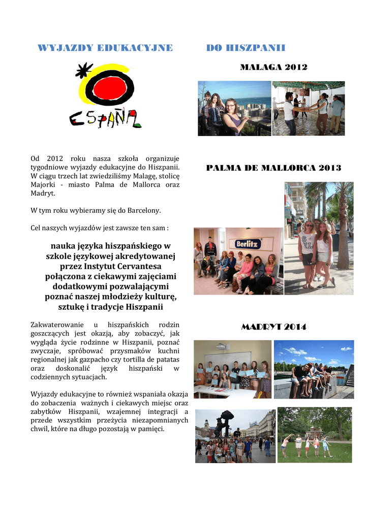 WYJAZDY EDUKACYJNE DO HISZPANII MALAGA 2012 Od 2012 roku nasza szkoła organizuje tygodniowe wyjazdy edukacyjne do Hiszpanii. W ciągu trzech lat zwiedziliśmy Malagę, stolicę Majorki - miasto Palma de Mallorca oraz Madryt. PALMA DE MALLORCA 2013 W tym roku wybieramy się do Barcelony. Cel naszych wyjazdów jest zawsze ten sam : nauka języka hiszpańskiego w szkole językowej akredytowanej przez Instytut Cervantesa połączona z ciekawymi zajęciami dodatkowymi pozwalającymi poznać naszej młodzieży kulturę, sztukę i tradycje Hiszpanii Zakwaterowanie u hiszpańskich rodzin goszczących jest okazją, aby zobaczyć, jak wygląda życie rodzinne w Hiszpanii, poznać zwyczaje, spróbować przysmaków kuchni regionalnej jak gazpacho czy tortilla de patatas oraz doskonalić język hiszpański w codziennych sytuacjach. Wyjazdy edukacyjne to również wspaniała okazja do zobaczenia ważnych i ciekawych miejsc oraz zabytków Hiszpanii, wzajemnej integracji a przede wszystkim przeżycia niezapomnianych chwil, które na długo pozostają w pamięci. MADRYT 2014