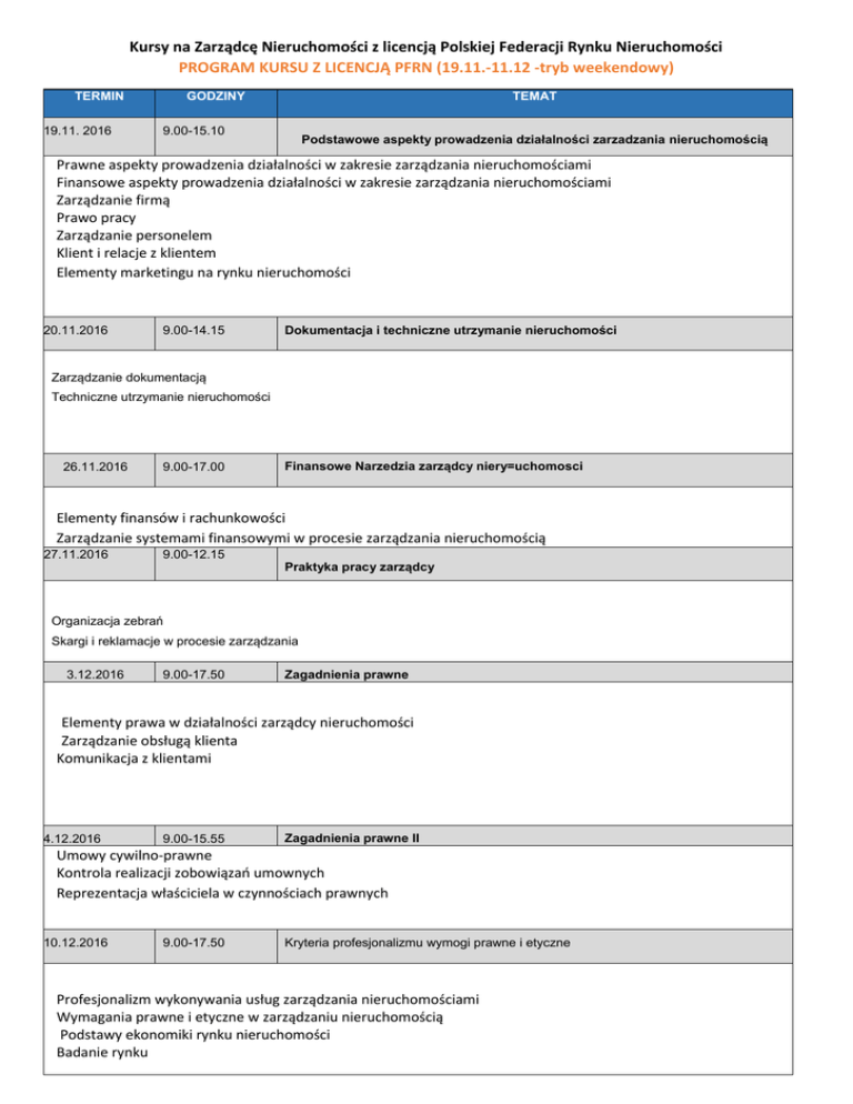 Kursy na Zarządcę Nieruchomości z licencją Polskiej Federacji Rynku Nieruchomości PROGRAM KURSU Z LICENCJĄ PFRN (19.11.-11.12 -tryb weekendowy) TERMIN 19.11. 2016 GODZINY TEMAT 9.00-15.10 Podstawowe aspekty prowadzenia działalności zarzadzania nieruchomością Prawne aspekty prowadzenia działalności w zakresie zarządzania nieruchomościami Finansowe aspekty prowadzenia działalności w zakresie zarządzania nieruchomościami Zarządzanie firmą Prawo pracy Zarządzanie personelem Klient i relacje z klientem Elementy marketingu na rynku nieruchomości 20.11.2016 9.00-14.15 Dokumentacja i techniczne utrzymanie nieruchomości Zarządzanie dokumentacją Techniczne utrzymanie nieruchomości 26.11.2016 9.00-17.00 Finansowe Narzedzia zarządcy niery=uchomosci Elementy finansów i rachunkowości Zarządzanie systemami finansowymi w procesie zarządzania nieruchomością 27.11.2016 9.00-12.15 Praktyka pracy zarządcy Organizacja zebrań Skargi i reklamacje w procesie zarządzania 3.12.2016 9.00-17.50 Zagadnienia prawne Elementy prawa w działalności zarządcy nieruchomości Zarządzanie obsługą klienta Komunikacja z klientami 4.12.2016 9.00-15.55 Zagadnienia prawne II Umowy cywilno-prawne Kontrola realizacji zobowiązań umownych Reprezentacja właściciela w czynnościach prawnych 10.12.2016 9.00-17.50 Kryteria profesjonalizmu wymogi prawne i etyczne Profesjonalizm wykonywania usług zarządzania nieruchomościami Wymagania prawne i etyczne w zarządzaniu nieruchomością Podstawy ekonomiki rynku nieruchomości Badanie rynku 11.12.2016 9.00-14.15 Umowa najmu zarzadzanie najmem Umowa najmu Zarządzanie najmem Doradztwo w zakresie zarządzania nieruchomościami 11.12 (niedziela) EGZAMIN DLA OSÓB UBIEGAJĄCYCH SIĘ O LICENCJĘ PFRN Test sprawdzający dla osób ubiegających się o licencję PFRN – 50 pytań testowych + 3 pytania opisowe