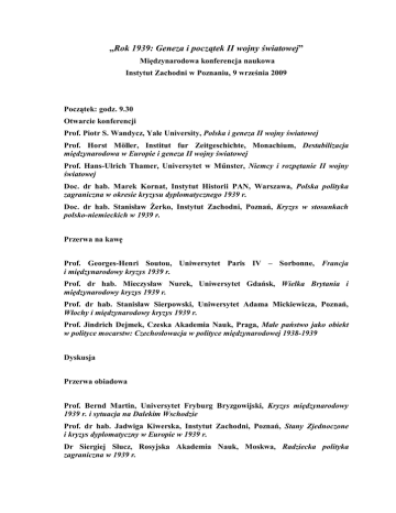 „Rok 1939: Geneza i pocz tek II wojny wiatowej” Mi dzynarodowa konferencja naukowa Instytut Zachodni w Poznaniu, 9 wrze nia 2009 Pocz tek: godz. 9.30 Otwarcie konferencji Prof. Piotr S. Wandycz, Yale University, Polska i geneza II wojny wiatowej Prof. Horst Möller, Institut fur Zeitgeschichte, Monachium, Destabilizacja mi dzynarodowa w Europie i geneza II wojny wiatowej Prof. Hans-Ulrich Thamer, Universytet w M nster, Niemcy i rozp tanie II wojny wiatowej Doc. dr hab. Marek Kornat, Instytut Historii PAN, Warszawa, Polska polityka zagraniczna w okresie kryzysu dyplomatycznego 1939 r. Doc. dr hab. Stanis aw erko, Instytut Zachodni, Pozna , Kryzys w stosunkach polsko-niemieckich w 1939 r. Przerwa na kaw Prof. Georges-Henri Soutou, Uniwersytet Paris IV – Sorbonne, Francja i mi dzynarodowy kryzys 1939 r. Prof. dr hab. Mieczys aw Nurek, Uniwersytet Gda sk, Wielka Brytania i mi dzynarodowy kryzys 1939 r. Prof. dr hab. Stanis aw Sierpowski, Uniwersytet Adama Mickiewicza, Pozna , ochy i mi dzynarodowy kryzys 1939 r. Prof. Jindrich Dejmek, Czeska Akademia Nauk, Praga, Ma e pa stwo jako obiekt w polityce mocarstw: Czechos owacja w polityce mi dzynarodowej 1938-1939 Dyskusja Przerwa obiadowa Prof. Bernd Martin, Universytet Fryburg Bryzgowijski, Kryzys mi dzynarodowy 1939 r. i sytuacja na Dalekim Wschodzie Prof. dr hab. Jadwiga Kiwerska, Instytut Zachodni, Pozna , Stany Zjednoczone i kryzys dyplomatyczny w Europie w 1939 r. Dr Siergiej S ucz, Rosyjska Akademia Nauk, Moskwa, Radziecka polityka zagraniczna w 1939 r. Dr W adimir Niewie yn, Rosyjska Akademia Nauk, Moskwa, Dyskusja wokó planów Stalina w przededniu i w pierwszej fazie II wojny wiatowej Dr Natalia Liebiediewa, Rosyjska Akademia Nauk, Moskwa, 17 wrze nia 1939 r. Przerwa na kaw Dr Ralf Meindl, Uniwersytet Fryburg Bryzgowijski, Spo eczenstwo niemieckie i perspektywa wojny w 1939 r. Dr Thomas Vogel, Urz d Bada Historii Wojskowej, Poczdam, Wehrmacht w niszczycielskiej wojnie przeciwko Polsce. Traktowanie polskich je ców wojennych w wietle niemieckich wiadectw z jesieni 1939 r. Dr S awomir D bski, Polski Instytut Spraw Mi dzynarodowych, Warszawa, II wojna wiatowa jako prze om w historii stosunków mi dzynarodowych Dyskusja Zako czenie konferencji ok. 18-19.00
