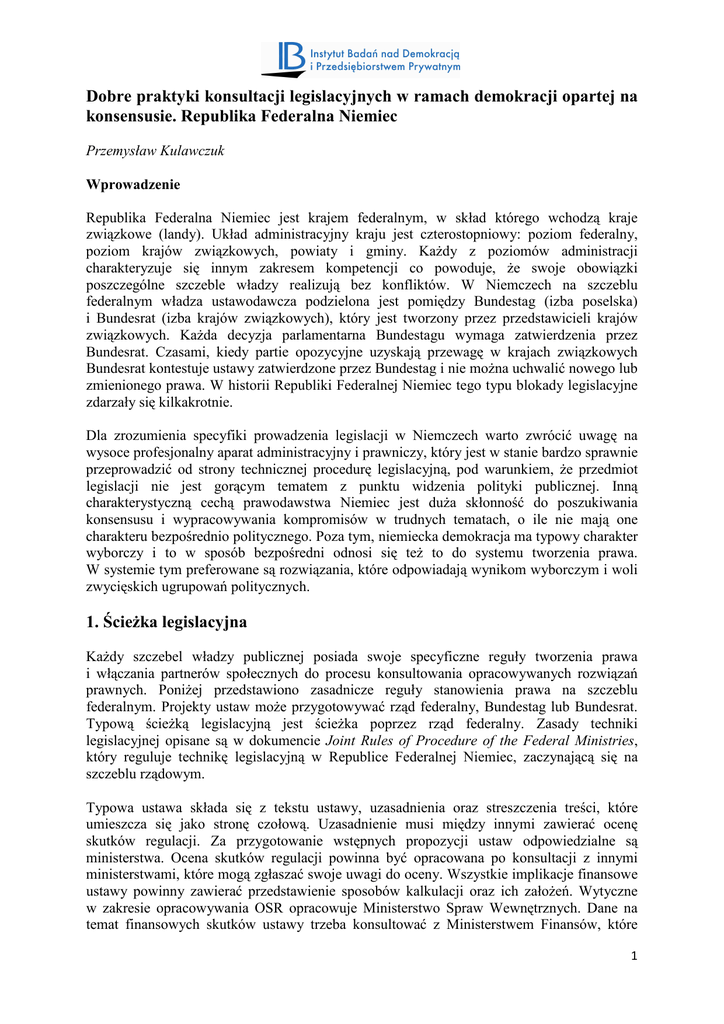 Dobre praktyki konsultacji legislacyjnych w ramach demokracji opartej na konsensusie. Republika Federalna Niemiec Przemysław Kulawczuk Wprowadzenie Republika Federalna Niemiec jest krajem federalnym, w skład którego wchodzą kraje związkowe (landy). Układ administracyjny kraju jest czterostopniowy: poziom federalny, poziom krajów związkowych, powiaty i gminy. KaŜdy z poziomów administracji charakteryzuje się innym zakresem kompetencji co powoduje, Ŝe swoje obowiązki poszczególne szczeble władzy realizują bez konfliktów. W Niemczech na szczeblu federalnym władza ustawodawcza podzielona jest pomiędzy Bundestag (izba poselska) i Bundesrat (izba krajów związkowych), który jest tworzony przez przedstawicieli krajów związkowych. KaŜda decyzja parlamentarna Bundestagu wymaga zatwierdzenia przez Bundesrat. Czasami, kiedy partie opozycyjne uzyskają przewagę w krajach związkowych Bundesrat kontestuje ustawy zatwierdzone przez Bundestag i nie moŜna uchwalić nowego lub zmienionego prawa. W historii Republiki Federalnej Niemiec tego typu blokady legislacyjne zdarzały się kilkakrotnie. Dla zrozumienia specyfiki prowadzenia legislacji w Niemczech warto zwrócić uwagę na wysoce profesjonalny aparat administracyjny i prawniczy, który jest w stanie bardzo sprawnie przeprowadzić od strony technicznej procedurę legislacyjną, pod warunkiem, Ŝe przedmiot legislacji nie jest gorącym tematem z punktu widzenia polityki publicznej. Inną charakterystyczną cechą prawodawstwa Niemiec jest duŜa skłonność do poszukiwania konsensusu i wypracowywania kompromisów w trudnych tematach, o ile nie mają one charakteru bezpośrednio politycznego. Poza tym, niemiecka demokracja ma typowy charakter wyborczy i to w sposób bezpośredni odnosi się teŜ to do systemu tworzenia prawa. W systemie tym preferowane są rozwiązania, które odpowiadają wynikom wyborczym i woli zwycięskich ugrupowań politycznych. 1. ŚcieŜka legislacyjna KaŜdy szczebel władzy publicznej posiada swoje specyficzne reguły tworzenia prawa i włączania partnerów społecznych do procesu konsultowania opracowywanych rozwiązań prawnych. PoniŜej przedstawiono zasadnicze reguły stanowienia prawa na szczeblu federalnym. Projekty ustaw moŜe przygotowywać rząd federalny, Bundestag lub Bundesrat. Typową ścieŜką legislacyjną jest ścieŜka poprzez rząd federalny. Zasady techniki legislacyjnej opisane są w dokumencie Joint Rules of Procedure of the Federal Ministries, który reguluje technikę legislacyjną w Republice Federalnej Niemiec, zaczynającą się na szczeblu rządowym. Typowa ustawa składa się z tekstu ustawy, uzasadnienia oraz streszczenia treści, które umieszcza się jako stronę czołową. Uzasadnienie musi między innymi zawierać ocenę skutków regulacji. Za przygotowanie wstępnych propozycji ustaw odpowiedzialne są ministerstwa. Ocena skutków regulacji powinna być opracowana po konsultacji z innymi ministerstwami, które mogą zgłaszać swoje uwagi do oceny. Wszystkie implikacje finansowe ustawy powinny zawierać przedstawienie sposobów kalkulacji oraz ich załoŜeń. Wytyczne w zakresie opracowywania OSR opracowuje Ministerstwo Spraw Wewnętrznych. Dane na temat finansowych skutków ustawy trzeba konsultować z Ministerstwem Finansów, które 1 opracowuje wytyczne w zakresie zasad dokonywania tego typu kalkulacji. MoŜe się zdarzyć, Ŝe Ministerstwo Finansów zakwestionuje wyniki kalkulacji i trzeba ją ponowić. Wszelkie skutki finansowe ustawy dotyczące władz lokalnych oraz krajów związkowych powinny być obliczone oddzielnie. Dla dokonania tego typu kalkulacji niezbędne jest uzyskanie danych od władz lokalnych oraz krajów związkowych. Warto podkreślić, iŜ wszelkie skutki finansowe ustawy, które mogłyby spowodować koszty dla biznesu (a w szczególności dla MSP) oraz dla konsumentów muszą być skonsultowane(na wczesnym etapie) z Ministerstwem Gospodarki i Technologii. Ministerstwo opracowujące projekt ustawy powinno równieŜ zasięgnąć informacji szczegółowych dotyczących ustawy od ekspertów i stowarzyszeń oraz w szczególności od małych i średnich przedsiębiorstw, które mogłyby być dotknięte skutkami ustawy. W uzasadnieniu ustawy federalne ministerstwo powinno określić, kiedy i po jakim okresie będzie przeprowadzony przegląd ustawy. Przegląd jest przeprowadzany w celu sprawdzenia, w jakim zakresie zostały osiągnięte cele ustawy oraz jakie efekty uboczne wywołała ustawa. Przed przedstawieniem ustawy na posiedzeniu rządu ustawa podlega konsultacjom międzyresortowym z innymi ministerstwami, zwłaszcza z tymi, których sfery odpowiedzialności mogą być objęte przez planowaną ustawę. RównieŜ Ministerstwa Spraw Wewnętrznych oraz Sprawiedliwości muszą być włączone w proces sprawdzania na ile ustawa jest zgodna z Konstytucją. Wszystkie ministerstwa, które są włączone w proces sprawdzania ustawy powinny, zgodnie z przepisami federalnymi, mieć wystarczającą ilość czasu na konsultację projektu ustawy. Ministerstwo przygotowujące projekt ustawy jest zobowiązane do zorganizowania debaty, tak aby wszystkie ministerstwa mogły wypowiedzieć się na temat treści proponowanej ustawy. JeŜeli w rozmowach (konsultacjach) międzyresortowych nie udaje się osiągnąć kompromisu to przepisy federalne dają moŜliwość kontynuacji prac nad ustawą zwłaszcza, jeŜeli są one kosztowne, dopiero po decyzji rady ministrów. W przeciwnej sytuacji, kiedy nie udaje się kompromisowo rozwiązać zasadniczej róŜnicy poglądów pomiędzy ministerstwami, a rada ministrów nie podejmie decyzji czy kontynuować prace nad ustawą, proces legislacyjny ulega zamknięciu. Zdarza się to jednak bardzo rzadko. Niemiecki system tworzenia prawa wymaga kompromisowego podejścia wszystkich i jeŜeli ktoś uprze się przy swoim zdaniu, to z reguły proces legislacyjny ulega wstrzymaniu. Bardzo często dla pokonania oporu jednego z partne