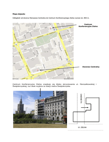 Mapa dojazdu Odległość od dworca Warszawa Centralna do Centrum Konferencyjnego Zielna wynosi ok. 850 m. Centrum Konferencyjne Zielna Dworzec Centralny UL.BAGNO Centrum Konferencyjne Zielna znajduje się blisko skrzyżowania ul. Marszałkowskiej i Świętokrzyskiej, tuż obok wyjścia ze stacji metra Świętokrzyska Ul. ZIELNA
