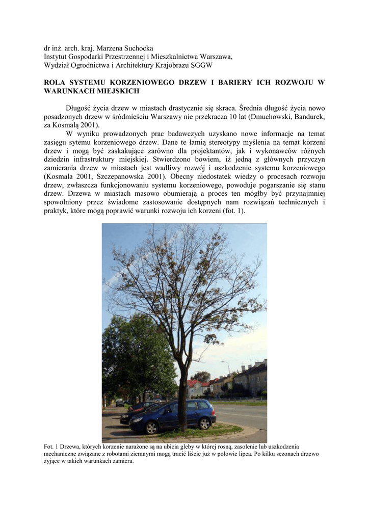 dr inż. arch. kraj. Marzena Suchocka Instytut Gospodarki Przestrzennej i Mieszkalnictwa Warszawa, Wydział Ogrodnictwa i Architektury Krajobrazu SGGW ROLA SYSTEMU KORZENIOWEGO DRZEW I BARIERY ICH ROZWOJU W WARUNKACH MIEJSKICH Długość życia drzew w miastach drastycznie się skraca. Średnia długość życia nowo posadzonych drzew w śródmieściu Warszawy nie przekracza 10 lat (Dmuchowski, Bandurek, za Kosmalą 2001). W wyniku prowadzonych prac badawczych uzyskano nowe informacje na temat zasięgu sytemu korzeniowego drzew. Dane te łamią stereotypy myślenia na temat korzeni drzew i mogą być zaskakujące zarówno dla projektantów, jak i wykonawców różnych dziedzin infrastruktury miejskiej. Stwierdzono bowiem, iż jedną z głównych przyczyn zamierania drzew w miastach jest wadliwy rozwój i uszkodzenie systemu korzeniowego (Kosmala 2001, Szczepanowska 2001). Obecny niedostatek wiedzy o procesach rozwoju drzew, zwłaszcza funkcjonowaniu systemu korzeniowego, powoduje pogarszanie się stanu drzew. Drzewa w miastach masowo obumierają a proces ten mógłby być przynajmniej spowolniony przez świadome zastosowanie dostępnych nam rozwiązań technicznych i praktyk, które mogą poprawić warunki rozwoju ich korzeni (fot. 1). Fot. 1 Drzewa, których korzenie narażone są na ubicia gleby w której rosną, zasolenie lub uszkodzenia mechaniczne związane z robotami ziemnymi mogą tracić liście już w połowie lipca. Po kilku sezonach drzewo żyjące w takich warunkach zamiera. Jak wyobrażamy sobie system korzeniowy? Z badan wynika, że większość korzeni w warunkach miejskich jest zlokalizowana w warstwie do 30 cm od powierzchni gleby i ich zasięg może być 2 do 4 razy większy, niż średnica korony drzewa. Korzenie w miastach rosną miejscach, gdzie znajdą odpowiednie warunki glebowe, zasobne zwłaszcza wodę, tlen i składniki pokarmowe. Zdrowotność drzew zależy zatem od objętości i jakości przestrzeni glebowej zajętej przez korzenie. W miastach mamy do czynienia z różnymi elementami zabudowy jak drogi, instalacje i struktury podziemne, które ograniczają rozwój korzeni. Występują ponadto takie niekorzystne zjawiska, jak zagęszczenie ziemi, które zmniejsza makropory, a tym samym powoduje ograniczenie zasobów tlenu w glebie. Występują ponadto zmiany w strukturze gleby oraz zubożenie warstwy urodzajnej, a także nieprawidłowe nawadnianie, lub jego niedostatek. Wszystkie te przyczyny wpływają na osłabianie „pracy” i uszkodzenie korzeni, co powoduje ograniczanie wzrostu drzew, zwiększa stres oraz podatność na choroby i szkodniki. Stąd wiedza na temat znaczenia odpowiedniego środowiska glebowego jest fundamentalna dla utrzymania żywotności i prawidłowego rozwoju drzew w miastach. Korzenie utrzymują drzewo w pozycji pionowej i służą jako kotwica części drzewa powyżej poziomu gruntu. Korzenie absorbują i transportują wodę i rozpuszczone w niej minerały z gleby do części nadziemnej drzewa. Korzenie są też „magazynami” składników pokarmowych w komórkach miękiszu, które są niezbędne wiosną do budowy listowia. Powszechnie panuje wyobrażenie dotyczące systemu korzeniowego drzewa jako symetrycznego odbicia jego korony. Dotychczasowe założenia dotyczące typu systemu korzeniowego w trudnych warunkach miejskich ulegają dużej weryfikacji. Podczas gdy korony drzew utrzymują swoje formy pokrojowe, jak np. kulista, kolumnowa czy stożkowa, system korzeniowy drzew w mieście ulega znacznej modyfikacji w zależności od rodzaju gleby, na której rosną i dostępnych miejsc zasobnych w wodę, tlen i składniki pokarmowe. Dotyczy to również drzew w warunkach naturalnych. Korzenie mogą zajmować bardzo nieregularną powierzchnię w trudnych warunkach miejskich, w zagęszczonym podłożu, pełnym gruzu, barier i ubogim w powietrze glebowe. W tych warunkach nie sprawdza się podział drzew na posiadających systemy talerzowe, palowe czy sercowe. Szacuje się, że łączna długość systemu korzeniowego dojrzałego drzewa wynosi ponad 100 km i jest zwykle dłuższa, niż sumaryczna długość pędów i gałęzi (Kosmala, 2005). Korzenie zawsze podążają we właściwym kierunku System korzeniowy drzewa składa się z systemu korzeni centralnych zawierających duże korzenie wieloletnie i małe, krótko żyjące korzenie żywicielskie. Duże zdrewniałe korzenie centralne, zwane statycznymi i ich części u nasady pnia, (czyli szyja korzeniowa) to system 4 do 11 dużych korzeni głównych. Przeważnie sięgają one na odległość od 1m do 3 m od pnia i zazwyczaj nie rosną głębiej niż 30 do 100 cm. Korzenie te rosną i powiększają swoje średnice. Ich funkcją jest przewodzenie wody i związków mineralnych oraz zakotwiczenie drzewa. Dodatkowo, aby utrzymać pozycję pionową drzewo wytwarza elastyczne korzenie drugiego rzędu, podobne do lin, grubości 1-2,5 cm, rozmieszczone pionowo lub ukośnie, których funkcją jest również przeciwdziałanie sile wiatrów. Korzenie żywicielskie z powodu drobnych rozmiarów nazywane są również włośnikowymi. Pomimo tego, że rozrastają się w strefie 7-15 cm poniżej poziomu gruntu, stanowią główną część powierzchni systemu korzeniowego. Te małe, nie zdrewniałe i silnie rozgałęzione korzonki rozprzestrzeniają się na zewnątrz bryły korzeniowej, jako przedłużenie grubych korzeni zdrewniałych, w pobliżu powierzchni gleby, gdzie relatywnie obficiej występują minerały, woda i tlen. Główną funkcją korzonków żywicielskich jest absorpcja wody i minerałów. Korzenie potrzebują tlenu z powietrza glebowego, aby przekształcić zmagazynowane substancje odżywcze na energię (oddychanie) i pobierać mikroelementy. W normalnych warunkach korzonki żywicielskie zamierają i są zastępowane w regularnych cyklach, wymieniając się kilkakrotnie w ciągu roku. Czasami w dobrych warunkach powierzchnię korzeni włośnikowych zwiększają strzępki grzyba (mikor