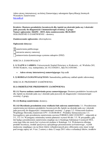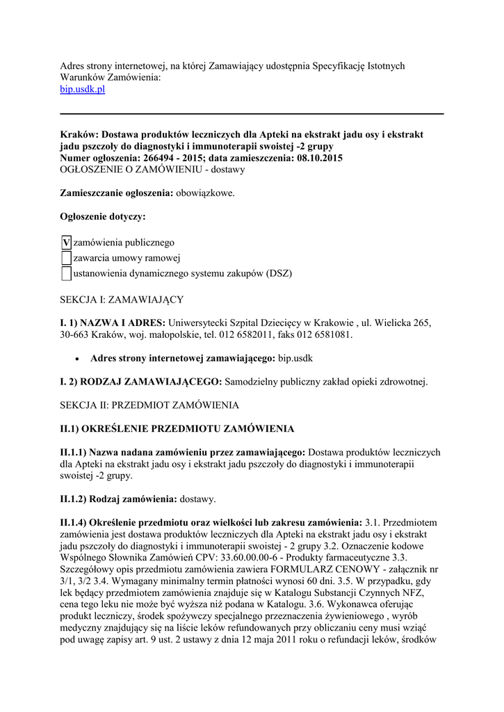 Adres strony internetowej, na której Zamawiający udostępnia Specyfikację Istotnych Warunków Zamówienia: bip.usdk.pl Kraków: Dostawa produktów leczniczych dla Apteki na ekstrakt jadu osy i ekstrakt jadu pszczoły do diagnostyki i immunoterapii swoistej -2 grupy Numer ogłoszenia: 266494 - 2015; data zamieszczenia: 08.10.2015 OGŁOSZENIE O ZAMÓWIENIU - dostawy Zamieszczanie ogłoszenia: obowiązkowe. Ogłoszenie dotyczy: V zamówienia publicznego zawarcia umowy ramowej ustanowienia dynamicznego systemu zakupów (DSZ) SEKCJA I: ZAMAWIAJĄCY I. 1) NAZWA I ADRES: Uniwersytecki Szpital Dziecięcy w Krakowie , ul. Wielicka 265, 30-663 Kraków, woj. małopolskie, tel. 012 6582011, faks 012 6581081. Adres strony internetowej zamawiającego: bip.usdk I. 2) RODZAJ ZAMAWIAJĄCEGO: Samodzielny publiczny zakład opieki zdrowotnej. SEKCJA II: PRZEDMIOT ZAMÓWIENIA II.1) OKREŚLENIE PRZEDMIOTU ZAMÓWIENIA II.1.1) Nazwa nadana zamówieniu przez zamawiającego: Dostawa produktów leczniczych dla Apteki na ekstrakt jadu osy i ekstrakt jadu pszczoły do diagnostyki i immunoterapii swoistej -2 grupy. II.1.2) Rodzaj zamówienia: dostawy. II.1.4) Określenie przedmiotu oraz wielkości lub zakresu zamówienia: 3.1. Przedmiotem zamówienia jest dostawa produktów leczniczych dla Apteki na ekstrakt jadu osy i ekstrakt jadu pszczoły do diagnostyki i immunoterapii swoistej - 2 grupy 3.2. Oznaczenie kodowe Wspólnego Słownika Zamówień CPV: 33.60.00.00-6 - Produkty farmaceutyczne 3.3. Szczegółowy opis przedmiotu zamówienia zawiera FORMULARZ CENOWY - załącznik nr 3/1, 3/2 3.4. Wymagany minimalny termin płatności wynosi 60 dni. 3.5. W przypadku, gdy lek będący przedmiotem zamówienia znajduje się w Katalogu Substancji Czynnych NFZ, cena tego leku nie może być wyższa niż podana w Katalogu. 3.6. Wykonawca oferując produkt leczniczy, środek spożywczy specjalnego przeznaczenia żywieniowego , wyrób medyczny znajdujący się na liście leków refundowanych przy obliczaniu ceny musi wziąć pod uwagę zapisy art. 9 ust. 2 ustawy z dnia 12 maja 2011 roku o refundacji leków, środków spożywczych specjalnego przeznaczenia żywieniowego oraz wyrobów medycznych ( Dz.U. nr 122 poz. 696), oraz odpowiedniego obwieszczenia Ministra Zdrowia dotyczącego leków stosowanych w ramach chemioterapii z uwzględnieniem limitu finansowania danego leku oraz kodu EAN (lub innego odpowiadającego kodowi EAN). 3.7. Przez produkty lecznicze, stanowiące przedmiot zamówienia należy rozumieć produkty lecznicze w rozumieniu ustawy Prawo farmaceutyczne z dnia 6 września 2001 roku (tekst jednolity: Dz. U. 2008 r. Nr 45 poz. 271 z późniejszymi zmianami). Zaoferowane produkty lecznicze muszą być dopuszczone do obrotu na zasadach określonych w art. 3 lub 4 lub 4a ustawy Prawo farmaceutyczne. 3.8. Zamawiający dopuszcza możliwość złożenia ofert równoważnych w oparciu o art. 29 ust. 3 ustawy. Pod pojęciem oferty równoważnej rozumie się ofertę złożoną na preparat w zakresie tej samej substancji czynnej, w postaci i dawce, a także w opakowaniu, o wielkości i rodzaju, wskazanym przez Zamawiającego. 3.9. W przypadku, gdy lek będący przedmiotem zamówienia w momencie wyceny jest niedostępny na rynku, Wykonawca zobowiązany jest do wyceny tego leku po ostatniej obowiązującej cenie. 3.10. Wykonawca zobowiązany jest do wskazania w ofercie części zamówienia, której wykonanie zamierza powierzyć podwykonawcom. 4. ZAMAWIAJĄCY DOPUSZCZA MOŻLIWOŚĆ SKŁADANIA OFERT CZĘŚCIOWYCH- 2 grupy. II.1.5) przewiduje się udzielenie zamówień uzupełniających Określenie przedmiotu oraz wielkości lub zakresu zamówień uzupełniających II.1.6) Wspólny Słownik Zamówień (CPV): 33.60.00.00-6. II.1.7) Czy dopuszcza się złożenie oferty częściowej: tak, liczba części: 2. II.1.8) Czy dopuszcza się złożenie oferty wariantowej: nie. II.2) CZAS TRWANIA ZAMÓWIENIA LUB TERMIN WYKONANIA: Okres w miesiącach: 12. SEKCJA III: INFORMACJE O CHARAKTERZE PRAWNYM, EKONOMICZNYM, FINANSOWYM I TECHNICZNYM III.1) WADIUM Informacja na temat wadium: zamawiający nie wymaga wniesienia wadium III.2) ZALICZKI III.3) WARUNKI UDZIAŁU W POSTĘPOWANIU ORAZ OPIS SPOSOBU DOKONYWANIA OCENY SPEŁNIANIA TYCH WARUNKÓW III. 3.1) Uprawnienia do wykonywania określonej działalności lub czynności, jeżeli przepisy prawa nakładają obowiązek ich posiadania Opis sposobu dokonywania oceny spełniania tego warunku warunek ten będzie spełniony przez Wykonawcę, który posiada koncesję/zezwolenie GIF na prowadzenie hurtowni farmaceutycznej/ składu celnego/ składu konsygnacyjnego, a ocena jego spełnienia zostanie dokonana na podstawie dokumentu, o którym mowa w pkt 8.2 III.3.2) Wiedza i doświadczenie o Opis sposobu dokonywania oceny spełniania tego warunku Zamawiający nie wyznacza szczegółowego warunku w tym zakresie. Ocenę spełniania warunku udziału w postępowaniu zamawiający przeprowadzi na podstawie załączonego do oferty oświadczenie, metodą spełnia/nie spełnia III.3.3) Potencjał techniczny o Opis sposobu dokonywania oceny spełniania tego warunku Zamawiający nie wyznacza szczegółowego warunku w tym zakresie. Ocenę spełniania warunku udziału w postępowaniu zamawiający przeprowadzi na podstawie załączonego do oferty oświadczenie, metodą spełnia/nie spełnia III.3.4) Osoby zdolne do wykonania zamówienia o Opis sposobu dokonywania oceny spełniania tego warunku Zamawiający nie wyznacza szczegółowego warunku w tym zakresie. Ocenę spełniania warunku udziału w postępowaniu zamawiający przeprowadzi na podstawie załączonego do oferty oświadczenie, metodą spełnia/nie spełnia III.3.5) Sytuacja ekonomiczna i finansowa o Opis sposobu dokonywania oceny spełniania tego warunku o Zamawiający nie wyznacza szczegółowego warunku w tym zakresie. Ocenę spełniania warunku udziału w postępowaniu zamawiający przeprowadzi na podstawie załączonego do oferty oświadczenie, metodą spełnia/