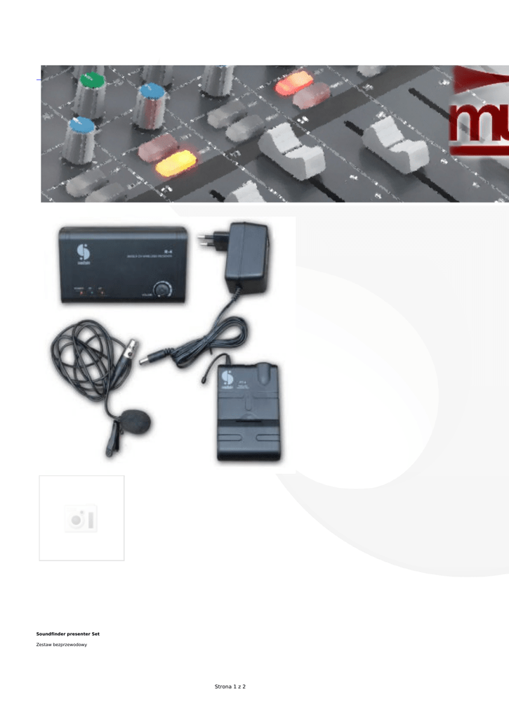 Soundfinder presenter Set Zestaw bezprzewodowy Strona 1 z 2 Wszystkie odmiany systemu Soundfinder pracując w paśmie UHF, gwarantującym większy zasięg, nawet do 100m, oraz lepszą jakość sygnału niż popularne systemy VHF przy bardzo znikomych zakłóceniach (THD < 0,5%). Nadajniki zasilane są dwiema bateriami AA. Przy zastosowaniu akumulatorów 1800mAh możliwe jest uzyskanie czasu pracy ciągłej nawet rzędu 10 godzin. Model Presenter to wariant z mikroportem, przeznaczony dla osób występujących publicznie (wykłady, prelekcje), które potrzebują dyskretnego, przypinanego mikrofonu typu lavalier. zestaw zawiera: system zasilacz odbiornik nadajnik PT-4 (mikrofon) System: Pasmo częstotliwości: 460.00 - 970.00 MHz Stabilność częstotliwość: <+/-15ppm Odstęp sygnału od szumu (S/N): >85dB Współczynnik zniekształceń nieliniowych (THD): <0.5% Pasmo przenoszenie: 50Hz - 15KHz (+/- 2dB) Poziom sygnału na wyjściu jack 1/4'': 0-360mV (regulowany) Poziom sygnału na wyjściu XL: 24mV (stały) Zasięg działania: 100 metrów (w wolnej przestrzeni) Dopuszczalna temperatura otoczenia: od -10 do 500C Odbiornik: Czułość: >-105dBm (odstęp sygnału od szumu: -12dB/15KHz) Tłumienie kanału sąsiedniego: >75dB Tłumienie emisji niepożądanych: >75dB Wymagane napięcie zasilania 13.5 - 15V prądu stałego (DC) Pobór mocy: <10W Wymiary 18 x 11 x 4.5 cm Nadajnik PT-4: Moc RF: 10dBm (50.) Tłumienie emisji harmonicznych: >-60dBc Maksymalna dewiacja częstotliwości: >65KHz Pobór prądu: <90mA Wkładka mikrofonowa: mikrofon dynamiczny o charakterystyce kierunkowej Baterie: 2x AA Żywotność bateri: ~10 godzin (1800mAh) Strona 2 z 2