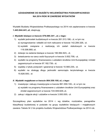 UZASADNIENIE DO BUDŻETU WOJEWÓDZTWA PODKARPACKIEGO NA 2014 ROK W ZAKRESIE WYDATKÓW Wydatki Budżetu Województwa Podkarpackiego na 2014 rok zaplanowane w kwocie 1.443.644.441,-zł, obejmują: I. Wydatki bieżące w kwocie 579.085.341 ,-zł, z tego: 1) wydatki jednostek budżetowych w kwocie 261.513.186,- zł, w tym na: a) wynagrodzenia i składki od nich naliczane w kwocie 142.206.326,- zł, b) wydatki związane z realizacją ich zadań statutowych w kwocie 119.306.860,-zł, 2) dotacje na zadania bieżące w kwocie 190.994.923,- zł, 3) świadczenia na rzecz osób fizycznych w kwocie 3.002.758,- zł, 4) wydatki na programy finansowane z udziałem środków Unii Europejskiej i źródeł zagranicznych w kwocie 97.182.739,- zł, 5) wypłaty z tytułu poręczeń i gwarancji w kwocie 10.565.235,- zł, 6) wydatki na obsługę długu jednostki samorządu terytorialnego w kwocie 15.826.500,- zł. II. Wydatki majątkowe w kwocie 864.559.100,-zł, z tego: 1) inwestycje i zakupy inwestycyjne w kwocie 861.559.100,- zł, w tym na: a) wydatki na programy finansowane z udziałem środków Unii Europejskiej oraz źródeł zagranicznych w kwocie 724.949.629,-zł, 2) zakup i objęcie akcji i udziałów w kwocie 3.000.000,- zł. Szczegółowy plan wydatków na 2014 r. wg działów, rozdziałów, paragrafów klasyfikacji budżetowej w podziale na grupy wydatków bieżących i majątkowych zawiera Tabela Nr 2 do projektu budżetu Województwa Podkarpackiego na 2014 rok. 1 DZIAŁ 010 – ROLNICTWO I ŁOWIECTWO Rozdział 01004 – Biura geodezji i terenów rolnych Utrzymanie jednostki budżetowej Podkarpackie Biuro Geodezji i Terenów Rolnych w Rzeszowie (Dep. RG), w tym: 1. Wydatki bieżące w kwocie 10.674.711,-zł: 1) wynagrodzenia i składki od nich naliczane oraz umowy zlecenia i o dzieło – 8.611.492,-zł, 2) pozostałe wydatki funkcjonowania jednostki – 2.009.069,-zł, w tym bieżące remonty i konserwacje – § 4270 – 89.000,-zł, 3) świadczenia na rzecz osób fizycznych – § 3020 – 54.150,-zł. 2. Wydatki majątkowe w kwocie 483.760,-zł: 1) wymiana 2 szt. dźwigów osobowych w budynku biurowym przy ul. Targowej w Rzeszowie – § 6050 – 383.760,-zł, 2) zakup 2 szt. samochodów osobowo-dostawczych – § 6060 – 100.000,-zł. Rozdział 01005 – Prace geodezyjno-urządzeniowe na potrzeby rolnictwa Wydatki bieżące w kwocie 40.000,-zł: analiza zmian w strukturze agrarnej i monitorowanie zmian w sposobie użytkowania gruntów z uwzględnieniem ich położenia na terenach górskich i podgórskich łącznie z aktualizacją wykazów miejscowości położonych na tych terenach – § 4010 – 9.277,-zł, § 4110 – 1.595,-zł, § 4120 – 228,-zł, § 4210 – 10.000,-zł, § 4300 – 16.900,-zł, § 4410 – 2.000,-zł. (PBGiTR – Dep. RG). Zadanie rządowe finansowane z dotacji celowej z budżetu państwa. Rozdział 01006 – Zarządy melioracji i urządzeń wodnych Utrzymanie jednostki budżetowej Podkarpacki Zarząd Melioracji i Urządzeń Wodnych w Rzeszowie realizującej zadania melioracyjne (Dep. RG), w tym: 1. Wydatki bieżące w kwocie 11.763.403,-zł: 1) wynagrodzenia i składki od nich naliczane oraz na umowy zlecenie i o dzieło – 10.246.728,-zł, 2) pozostałe wydatki funkcjonowania jednostki – 1.492.175,-zł, w tym remont siedziby PZMiUW w Rzeszowie przy ul. Hetmańskiej 9, Oddziałów i Inspektoratów oraz bieżące remonty i konserwacje – § 4270 – 140.000,- zł. 2 3) świadczenia na rzecz osób fizycznych – § 3020 – 24.500,- zł. 2. Wydatki majątkowe w kwocie 20.000,-zł: zakup serwerów – § 6060 – 20.000,- zł. Rozdział 01008 – Melioracje wodne Zadania rządowe: 1. Wydatki bieżące w kwocie 5.068.959,-zł (PZMiUW – Dep. RG): utrzymanie urządzeń melioracji wodnych – 5.068.959,-zł, w tym: 1) wynagrodzenia i składki od nich naliczane oraz na umowy zlecenie i o dzieło – 1.232.344,-zł: § 4010 – 1.031.589,-zł, § 4110 – 174.661,-zł, § 4120 – 24.894,-zł, § 4170 – 1.200,-zł, 2) pozostałe wydatki związane z utrzymaniem melioracji wodnych – 3.818.591,-zł: § 4140 – 43.320,-zł, § 4210 – 40.000,-zł, § 4260 – 700.000,-zł, § 4270 – 2.693.217,-zł, § 4280 – 3.060,-zł, § 4300 – 300.000,-zł, § 4440 – 37.194,-zł, § 4480 – 1.000,-zł, § 4500 – 800,-zł, 3) świadczenia na rzecz osób fizycznych – § 3020 -18.024,-zł. 2. Wydatki majątkowe w kwocie 47.568.000,-zł (PZMiUW – Dep. RG): inwestycje melioracyjne – 47.568.000,-zł, z tego: 1) w ramach RPO WP – 500.000,-zł, w tym zadanie "Zaprojektowanie i budowa suchego zbiornika przeciwpowodziowego (polderu przepływowego) pn. „Kańczuga” na rzece Mleczka Kańczudzka na terenie gminy Jawornik Polski oraz miasta i gminy Kańczuga" – dotacja celowa z budżetu państwa – § 6050 – 500.000,-zł. Zadanie ujęte w wykazie przedsięwzięć do WPF, realizowane również w ramach rozdziału 01078. 2) w ramach PROW – 45.172.000,-zł, w tym zadania: a) "Nowy Breń II – rozbudowa i przeciwfiltracyjne zabezpieczenie prawego wału rzeki Nowy Breń w km 2+487-4+319, na długości 1,832 km w miejscowościach: Słupiec, Ziempniów i Otałęż Część I: km 2+764-4+319, na długości 1,555 km, w miejscowości Ziempniów i Otałęż woj. podkarpackie" – 2.731.000,-zł: środki UE – § 6057 – 1.634.000,-zł, dotacja celowa z budżetu państwa – § 6059 – 546.000,-zł, § 6050 – 551.000,-zł. Zadanie ujęte w wykazie przedsięwzięć do WPF. Zadanie o wartości kosztorysowej 4.047.340,-zł realizowane w latach 2011 – 2015. 3 Stan zaawansowania robót: uzyskano pozwolenie wodnoprawne oraz decyzję o pozwoleniu na realizację inwestycji, przeprowadzono procedurę przetargową na wykonanie robót budowlano-montażowych oraz zawarto umowę z wykonawcą. b) "San I Etap I – rozbudowa i przeciwfiltracyjne zabezpieczenie prawego wału rzeki San w km 2+215-9+417, na długości 7,202 km, na terenie gminy Radomyśl nad Sanem, woj. podkarpackie" 