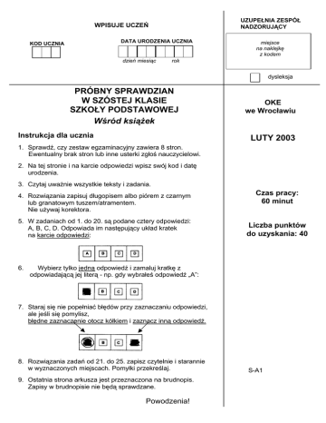 UZUPEŁNIA ZESPÓŁ NADZORUJĄCY WPISUJE UCZEŃ DATA URODZENIA UCZNIA KOD UCZNIA dzień miesiąc miejsce na naklejkę z kodem rok dysleksja PRÓBNY SPRAWDZIAN W SZÓSTEJ KLASIE SZKOŁY PODSTAWOWEJ Wśród książek Instrukcja dla ucznia OKE we Wrocławiu LUTY 2003 1. Sprawdź, czy zestaw egzaminacyjny zawiera 8 stron. Ewentualny brak stron lub inne usterki zgłoś nauczycielowi. 2. Na tej stronie i na karcie odpowiedzi wpisz swój kod i datę urodzenia. 3. Czytaj uważnie wszystkie teksty i zadania. 4. Rozwiązania zapisuj długopisem albo piórem z czarnym lub granatowym tuszem/atramentem. Nie używaj korektora. 5. W zadaniach od 1. do 20. są podane cztery odpowiedzi: A, B, C, D. Odpowiada im następujący układ kratek na karcie odpowiedzi: 6. Czas pracy: 60 minut Liczba punktów do uzyskania: 40 Wybierz tylko jedną odpowiedź i zamaluj kratkę z odpowiadającą jej literą - np. gdy wybrałeś odpowiedź „A”: 7. Staraj się nie popełniać błędów przy zaznaczaniu odpowiedzi, ale jeśli się pomylisz, błędne zaznaczenie otocz kółkiem i zaznacz inną odpowiedź. 8. Rozwiązania zadań od 21. do 25. zapisz czytelnie i starannie w wyznaczonych miejscach. Pomyłki przekreślaj. 9. Ostatnia strona arkusza jest przeznaczona na brudnopis. Zapisy w brudnopisie nie będą sprawdzane. Powodzenia! S-A1 Witam cię kartek szelestem, tytułem na pierwszej stronie, witam! Bo po to przecież jestem, żebyś mnie ujął w dłonie i czytał! Kiedy ci smutno będzie, kiedyś samotny, chory, bez przyjaciela – ja z tobą pójdę wszędzie, poprzez zimowe wieczory, w kraje wesela. Edward Szymański, Książka (fragment) 1. W tym wierszu mówi do czytelnika A. autor. B. książka. C. biblioteka. D. narrator. 2. Druga zwrotka wiersza ma charakter A. prośby. B. zachęty. C. obietnicy. D. życzenia. Książki towarzyszą człowiekowi od czterech tysięcy lat. Zapisywano je kiedyś ręcznie na glinianych tabliczkach, papirusowych zwojach, na pergaminie i wreszcie – znacznie później – na papierze. Epoka książki drukowanej rozpoczęła się dopiero w XV wieku, dzięki Janowi Gutenbergowi. 3. Ile wieków minęło od pojawienia się pierwszych książek? A. 40 wieków. B. 4 wieki. C. 400 wieków. D. 4000 wieków. 4. Informacji o Janie Gutenbergu poszukasz w książce A. „Starożytne cywilizacje”. B. „Leksykon wynalazców”. C. „Odkrycia XX wieku”. D. „Słynne biblioteki”. Pierwszą książkę dla niewidomych wydrukowano w Paryżu w 1837 roku. Stało się to możliwe dzięki wynalezieniu systemu pisma dotykowego. Jego twórcą był Ludwik Braille (1809 – 1852) – uczeń, a następnie nauczyciel w paryskiej szkole dla niewidomych. Braille zaczął pracować nad systemem pisma dotykowego już w 1824 roku, później przez kilkanaście lat go udoskonalał. Dzisiaj pismo dla niewidomych zwane jest potocznie „brajlem”. Na podstawie Encyklopedii Powszechnej PWN. 5. Kiedy wydano pierwszą książkę dla niewidomych? A. W pierwszej połowie XVIII wieku. B. W drugiej połowie XVIII wieku. C. W pierwszej połowie XIX wieku. D. W drugiej połowie XIX wieku. 6. Ile lat miał Ludwik Braille, gdy rozpoczął pracę nad systemem pisma dotykowego? A. 52 B. 28 C. 24 D. 15 2 Pierwsza polska biblioteka narodowa, zwana od nazwiska jej założycieli Biblioteką Załuskich, powstała w Warszawie w pierwszej połowie XVIII wieku. Liczyła ponad 200 tysięcy tomów. Podstawę biblioteki stanowił księgozbiór rodziny Załuskich. Ponadto znalazły się tam zbiory królewskie Stefana Batorego, Jana III Sobieskiego oraz hetmana Żółkiewskiego. Na podstawie Encyklopedii staropolskiej. 7. Wywnioskuj z tekstu, w którym roku powstała Biblioteka Załuskich. A. 1747 B. 1794 C. 1812 D. 1860 8. W pierwszej polskiej bibliotece narodowej najwięcej książek pochodziło ze zbiorów A. hetmana Żółkiewskiego. B. rodziny Załuskich. C. króla Jana III Sobieskiego. D. króla Stefana Batorego. W zbiorach niektórych bibliotek znajdują się książki mówione, czyli taśmy z nagraniami tekstów książek. Oto czasy czytania przez lektora poszczególnych rozdziałów książki pt. „Szalona wyprawa”: Rozdział I II III IV V Czas [min] 40 41 47 43 39 9. Ile czasu lektor czytał całą książkę? A. 2 godz. 10 min B. 3 godz. 20 min C. 3 godz. 30 min D. 4 godz. 10 min 10. Karolina włączyła magnetofon o 1735 i zaczęła słuchać trzeciego rozdziału książki. Gdy skończył się ten rozdział, wyłączyła magnetofon. O której to było godzinie? B. 1812 C. 1822 D. 1847 A. 1747 10 m A. 30 B. 38 C. 90 D. 75 7m 11. Podłoga w bibliotece ma kształt i wymiary przedstawione na rysunku. Ile metrów kwadratowych ma jej powierzchnia? Kolejne odcinki są prostopadłe. 9m 4m 3 12. Każdy z tomów siedemnastotomowej encyklopedii ma grubość 5,5 cm. Ile tomów tej encyklopedii zmieści się na półce długości 90 cm, jeśli będą stały jeden obok drugiego? A. Najwyżej 14. B. Najwyżej 15. C. Najwyżej 16. D. Wszystkie. Kajtek w lipcu pojedzie do cioci. Już teraz studiuje przewodniki turystyczne, by zaplanować ciekawe wycieczki i jak najwięcej dowiedzieć się o regionie, w którym spędzi wakacje. 13. Na wycieczkę tylko z przewodnikiem. Możemy różnie odczytać to hasło, bo słowo przewodnik jest wyrazem wieloznacznym. Wszystkie znaczenia tego słowa znajdziesz w słowniku A. poprawnej polszczyzny. B. wyrazów bliskoznacznych. C. ortograficznym. D. języka polskiego. 14. Ścieżka przyrodnicza ma na mapie narysowanej w skali 1 : 30000 długość równą 15 cm. Jaka jest długość tej ścieżki w terenie? A. 45000 m B. 4500 m C. 450 m D. 45 m 15. Kajtek idzie ze szkoły do księgarni najkrótszą drogą – przez park. W jakim kierunku zmierza? A. Południowo-wschodnim. B. Północno-zachodnim. C. Południowo-zachodnim. D. Północno-wschodnim. 16. Na planie biblioteka znajduje się w kwadracie: A. 1–A B. 2–F C. 3–B 4 D. 4–D Diagram przedstawia, ile książek wypożyczyli ze szkolnej bibliote