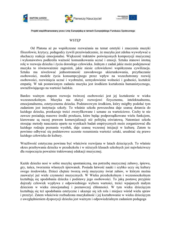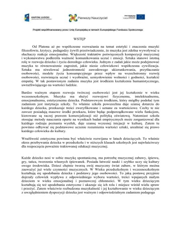 WSTĘP Od Platona aż po współczesne rozważania na temat estetyki i znaczenia muzyki filozofowie, krytycy, pedagodzy żywili przeświadczenie, że muzyka jest zdolna wywoływać u słuchaczy reakcje emocjonalne. Większość traktatów poświęconych kompozycji muzycznej i wykonawstwu podkreśla ważność komunikowania uczuć i emocji. Sztuka stanowi istotną rolę w rozwoju dziecka i życiu dorosłego człowieka. Jednym z zadań jakie może podejmować muzyka to równoważenie zagrożeń, jakie niesie człowiekowi współczesna cywilizacja. Sztuka ma niwelować jednostronność zawodowego ukierunkowania, przytłaczanie osobowości, modele życia konsumpcyjnego przez wpływ na wszechstronny rozwój osobowości, rozwinięcia uczuć i wyobraźni, uzmysłowienie wolności i godności, kształcić empatię. W tak postawionym zadaniu muzyka jest środkiem kształcenia humanistycznego, uwrażliwiającego na wartości ludzkie. Bardzo ważnym etapem rozwoju twórczej osobowości jest jej kształcenie w wieku wczesnoszkolnym. Muzyka ma służyć rozwojowi fizycznemu, intelektualnemu, emocjonalnemu, estetycznemu dziecka. Podstawowym środkiem, który mógłby podołać tym zadaniom jest instytucja szkoły. To właśnie szkoła powszechna daje szansę dotarcia do każdego dziecka, przekazuje treści zweryfikowane i uznane za wartościowe. Cechy te nie zawsze posiadają masowe środki przekazu, które będąc podporządkowane wielu funkcjom, kierowane są raczej prawem komercjalizacji niż polityką oświatową. Natomiast szkoła stosując metody nauczania oparte na wynikach badań empirycznych może zorganizować dla każdego rodzaju poznania wysiłek, daje szansę wczesnej inicjacji w kulturę. Zatem tu powinno odbywać się podstawowe uczenie rozumienia wartości sztuki, urealniać się prawo każdego człowieka do kultury. Wrażliwość estetyczna powinna być właściwie rozwijana w latach dziecięcych. To właśnie okres przebywania dziecka w przedszkolu i w niższych klasach szkolnych jest najwłaściwszy dla rozpoczęcia poważnie traktowanej edukacji muzycznej. Każde dziecko nosi w sobie muzykę spontaniczną, ma potrzebę muzycznej zabawy, śpiewu, gry, tańca, tworzenia własnych śpiewanek. Posiada łatwość nauki i szybko uczy się kultury swego środowiska. Dzieci chętnie tworzą swój muzyczny świat zabaw, w którym można zauważyć już wiele czynności muzycznych. W Wieku przedszkolnym i wczesnoszkolnym kształtują się upodobania dziecka i podstawy jego osobowości. To jaką postawę przyjmie dojrzały człowiek wypływa z odpowiedniego wyboru wartości, treści wpajanych małym dzieciom w wieku emocjonalnej i poznawczej chłonności. W tym wieku dziecięcym kształtują się też upodobania estetyczne i ukazuje się ich rola i miejsce wśród wielu spraw i przeżyć. Zatem właściwie rozbudzona muzykalność i jej kształtowanie w wieku dziecięcym z uwzględnieniem dyspozycji dziecka jest ważnym i odpowiedzialnym zadaniem pedagoga PREDYSPOZYCJE muzyczne dziecka Najważniejszym zadaniem w dydaktyce muzyki jest zainteresowanie dzieci muzyką i ukształtowanie w nich przeświadczenia, że spotkania z muzyką są atrakcyjne. Spełnienie tego zadania powinno być ważniejsze niż ciągłe korekty w precyzji wykonywania zadań muzycznych. Muzyka wywołująca radość i szereg innych pozytywnych emocji powinna dominować na lekcjach, by w dziecku rozbudzić radość, pobudzić aktywność. Zadaniem nauczyciela jest także nauczyć muzykę wykonywać, tworzyć i słuchać ją. By jednak właściwie dokonać tego, pedagog musi uwzględnić rozwój zdolności muzycznych dziecka. Zdolnościami muzycznymi powszechnie nazywa się zespół wrodzonych i nabytych dyspozycji natury zarówno fizycznej jak też i psychicznej. Kształcenie zawodowego muzyka wymaga wrodzonych uzdolnień, natomiast w ogólnym wychowaniu muzycznym istotne są podstawowe zdolności muzyczne i ogólna muzykalność dziecka. Na zdolności muzyczne składa się uwaga, wyobraźnia, pamięć, wola, wrażliwość emocjonalna, inteligencja, a także czynniki, które umożliwiają w sposób szczególny spostrzeganie , pamiętanie, zestawianie cech dźwięku i utworów muzycznych. Są nimi: Poczucie wysokości dźwięków Już małe dziecko posiada zdolność rozpoznawania różnic pomiędzy intonacją dźwięków, a poprzez ćwiczenia zdolność ta szybko się rozwija. Rozwój tej zdolności jest istotny, gdyż uważa się, że w zależności od percepcji wysokości dźwięków zależy przeżycie emocjonalne Wrażliwość na barwę dźwięków Jest to ważna zdolność, gdyż muzyka charakteryzuje się szeroką gamą barwy brzmienia (różne instrumenty, głos ludzki). Rozpoznawanie barwy instrumentu jest łatwe dla dziecka, jednakże kształcenie w tym zakresie powinno być nakierowane na rozbudzenie estetycznego odczuwania tego czynnika w utworach muzycznych. Wrażliwość na głośność dźwięku Zdolność odczuwania różnic głośności jest powszednia, jednak istotne dla odbioru muzyki jest to, by e słuchaczu wykształcić umiejętność odczucia estetycznej funkcji dynamiki. Dziecko powinno zrozumieć i przeżyć emocjonalnie różnice głośności dźwięku wchodzące w całość utworu. Poczucie rytmu Kształtowanie poczucia rytmu stanowi istotny element w wychowaniu muzycznym. Jest ono u dzieci zdolnością dość powszechną, zatem i doskonalenie jej jest dla dzieci przyjemne i chętnie się poddają różnym ćwiczeniom i zabawom. Jednakże te od pedagoga wymagają wiele inwencji i błyskotliwości w opracowaniu Rozwój wymienionych zdolności muzycznych następuje w toku systematycznych kontaktów dzieci z muzyką. Owymi kontaktami z muzyką jest śpiew, gra na instrumencie, ruch. U dzieci w wieku wczesnoszkolnym wyraźnie zaznaczają się już indywidualne możliwości muzyczne, które muszą być uwzględnione przy wprowadzaniu dzieci w świat muzyki. Zadaniem muzyki w klasach początkowych jest ro