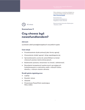 Czy chcesz być nowofundlandem? – Scenariusz 9 Filmy wskazane w scenariuszu dostępne są na kanale YouTube projektu SiecTolerancji http://tnij.org/jragzgk Paweł Kwiecień, konsultacja metodologiczna: Magdalena Tulska-Budziak 45 minut Stowarzyszenie Kuturalno-Edukacyjno-Naukowe „KEN” Scenariusz 9 Czy chcesz być nowofundlandem? Adresat: uczniowie szkół ponadgimnazjalnych wszystkich typów Cele lekcji: • Przedstawienie dyskryminacji jako formy agresji. • Zrozumienie źródeł agresji i dróg zapobiegania jej. • Sprowokowanie ucznia do autorefleksji na temat własnych postaw dyskryminacyjnych. • Budowanie postawy otwartości na inność, odmienność. • Rozwijanie kompetencji społecznych sprzyjających funkcjonowaniu w otoczeniu osób z różnych kultur, domów, z różnym stanem zdrowia. Środki glotto-dydaktyczne: • Laptop • Rzutnik i ekran • Głośniki • Prezentacja PowerPoint zawierająca filmy wideo 1 Czy chcesz być nowofundlandem? – Scenariusz 9 Przebieg lekcji Nauczyciel(ka): Kto z was ma psy? Kto ma koty? Zadanie Nauczyciel(ka): Proszę obejrzeć krótki film i powiedzieć, czy byliście kiedyś świadkami takiej sytuacji? Nauczyciel(ka) włącza fragment filmu Dzień świra, w którym chory, mały pies atakuje głównego bohatera filmu. Zatrzymujemy film w 16. sekundzie. Link: https://www.youtube.com/watch?v=JM7TUWBzQDc Nauczyciel(ka): Jak można opisać zachowanie psa, ale też zachowanie bohatera wobec psa? Zachowanie psa można opisać, jako agresywne. Slajd nr 1 z napisem Agresja Nauczyciel(ka): Wysłuchajcie, proszę, wypowiedzi muzułmanina, wyznawcy islamu mieszkającego w Polsce. Film Islam – Podstawówka (lub Dyskryminacja część 2 – to ten sam materiał) Tego materiału nauczyciel(ka) nie komentuje. Nauczyciel(ka): • Czym jest agresja? Agresja to zachowanie, które ma wyrządzić komuś ból, krzywdę lub sprawić, by poczuł się on niekomfortowo. 2 Czy chcesz być nowofundlandem? – Scenariusz 9 • Jakie zachowania agresywne znacie? Agresja fizyczna: bicie, więzienie, niszczenie przedmiotów; agresja słowna: wyzywanie, przezywanie, wyśmiewanie; agresja psychiczna: nękanie, poniżanie. • Czym różni się gniew od agresji? Gniew to uczucie – jak radość, smutek. To coś, co czujemy wewnątrz. Agresja to rodzaj zachowania wobec świata zewnętrznego. Wracając do naszego filmu i psów, jakie psy są najgłośniejsze na ulicy? • Jak zachowują się duże psy, a jak małe? • Jak sądzicie, dlaczego? Uczennice i uczniowie wypowiadają się, każda odpowiedź jest dobra. Moderujemy dyskusję w kierunku obserwacji: małe psy są głośniejsze od dużych psów. Duże psy częściej są spokojne i trudniej wyprowadzić je z równowagi. Przyczyny takich zachowań mogą być różne (np. fakt, że małe psy rzadziej uczestniczą w zajęciach z tresury i mogą być źle wychowane), ale jedną z istotniejszych może być lęk. Nauczyciel(ka): Wysłuchajmy jeszcze raz naszego nowego znajomego. Film Islam. Życie w Polsce (Czas trwania – 2 minuty 10 sekund). Tego materiału nauczyciel nie komentuje. Nauczyciel(ka): Tak zwana agresja lękowa jest jednym ze zdiagnozowanych problemów w terapii zwierząt. Coraz częściej wiele psów cierpi na tę przypadłość. Czy spotkaliście psa, który był agresywny dlatego, że się bał? Kiedy to było, jaka to była sytuacja? (kilka odpowiedzi z klasy). Nauczyciel(ka): Ludzie mogą wiele uczyć się od zwierząt, ponieważ ludzkie zachowania często przypominają te zwierzę- 3 Czy chcesz być nowofundlandem? – Scenariusz 9 ce. U ludzi również obserwuje się agresję lękową. Slajd nr 2 z napisem Lęk Nauczyciel(ka): Lęk to poczucie strachu nieproporcjonalne do okoliczności. Strach jest naturalnym i racjonalnym odczuciem, pozwalającym zwierzętom i ludziom unikać zagrożenia i w konsekwencji – przeżyć. Lęk to wyolbrzymiony, nieracjonalny strach, zwykle o podłożu psychicznym. Każdy czegoś się lęka, ludzie mają różne fobie. Zadanie Nauczyciel(ka): Obejrzyjmy fragment filmu Faraon. Proszę zastanowić się, jaka może być jedna z ważniejszych przyczyn lęku. Nauczyciel włącza fragment filmu Faraon. Link: https://www.youtube.com/watch?v=BDJXdXym7GE Nauczyciel(ka): Co było powodem popłochu, który wzbudzili kapłani w ludziach? Czemu kapłani nie bali się zaćmienia, tylko stali spokojnie? Przewidywane odpowiedzi: • bo wiedzieli, co się dzieje; • ludzie przestraszyli się gniewu bogów; • ludzie nie znali zjawiska zaćmienia słońca; • … Slajd nr 3 z napisem Niewiedza Nauczyciel(ka): Tak, lud bał się zaćmienia, ponieważ go nie rozumiał i przez to przypisywał mu o wiele większe znaczenie niż zjawisko to posiada w rzeczywistości. Kapłan dobrze rozumiał istotę wydarzenia, którego był świadkiem. Zatem sposo4 Czy chcesz być nowofundlandem? – Scenariusz 9 bem na pokonanie lęku, a tym samym agresji może być dokładne poznanie tego, czego się boimy. Jak to zrobić? Slajd nr 4 z napisem Poznanie Nauczyciel(ka): Zdobywanie wiedzy i doświadczenia może pomóc zapobiegać agresywnym zachowaniom. Jednym z takich sposobów jest postawienie się w roli osoby, której się boimy. Ćwiczenie: Widzicie na przystanku autobusowym osobę, która wykonuje dziwne ruchy. Ma tiki. Jaka jest wasza pierwsza myśl? Przewidywane odpowiedzi: • ktoś może być pijany; • ktoś się wygłupia; • ten ktoś jest wariatem; • … Nauczyciel(ka): Nie należy osądzać kogoś, kogo dobrze nie znamy. Ta osoba może być np. osobą autystyczną. Autyzm polega na błędnym odczytywaniu przez mózg bodźców wysyłanych przez sensory zmysłów. „Osoby dotknięte autyzmem mogą mieć trudności z prawidłowym odbiorem wrażeń płynących z własnego ciała, np. czują, że ich ręce są bardzo ciężkie, nie potrafią określić tego, gdzie kończy się ich ciało (dlatego czasem obracają się dookoła własnej osi)(…)”. Ale nasz mózg też może nas oszu