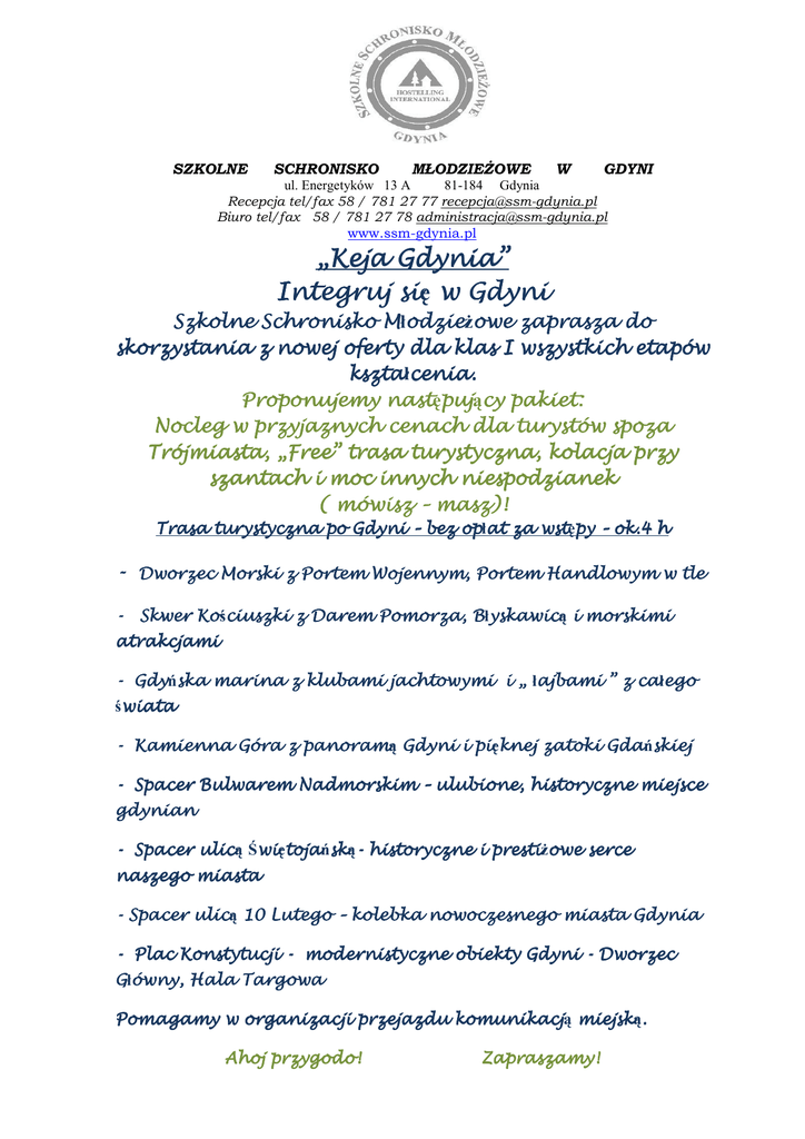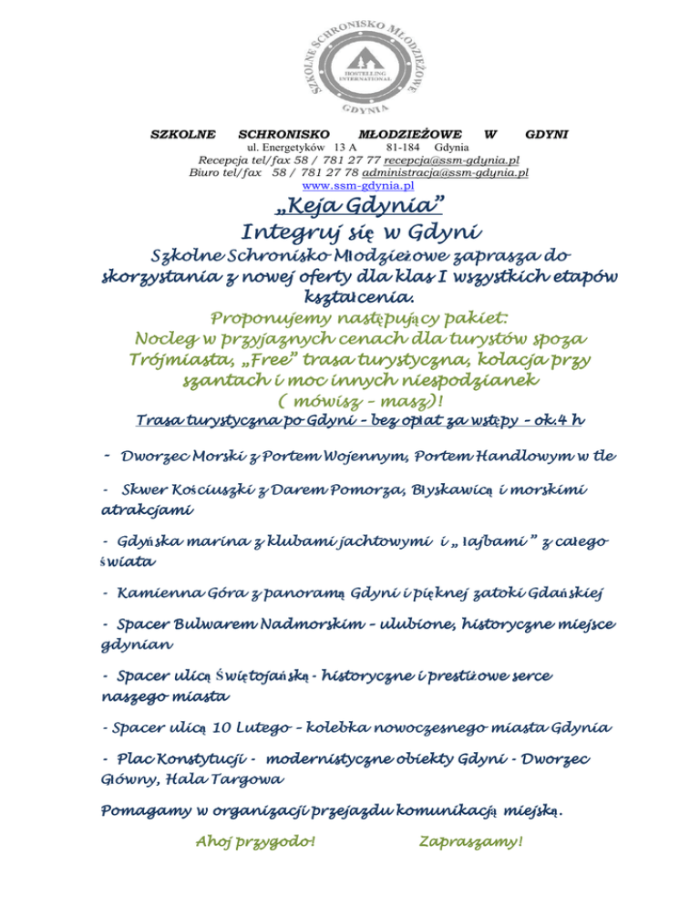 SZKOLNE SCHRONISKO MŁODZIEśOWE W GDYNI ul. Energetyków 13 A 81-184 Gdynia Recepcja tel/fax 58 / 781 27 77 [email protected] Biuro tel/fax 58 / 781 27 78 [email protected] www.ssm-gdynia.pl „Keja Gdynia” Integruj się si w Gdyni Szkolne Schronisko Młodzie M odzieŜowe odzie owe zaprasza do skorzystania z nowej oferty dla klas I wszystkich etapów kształcenia kszta cenia. cenia. Proponujemy następuj nast pujący puj cy pakiet: Nocleg w przyjaznych cenach dla turystów spoza Trójmiasta Trójmiasta, ójmiasta, „Free” trasa turystyczna, kolacja przy szantach i moc innych niespodzianek ( mówisz – masz)! masz)! Trasa turystyczna po Gdyni – bez opłat op at za wstępy wst py – ok.4 h - Dworzec Morski z Portem Wojennym, Portem Handlowym w tle yskawicą i morskimi - Skwer Kościuszki Błyskawic yskawic Ko ciuszki z Darem Pomorza, Pomorza, B atrakcjami - Gdyńska ajbami ” z całego Gdy ska marina z klubami jachtowymi i „ łajbami ca ego świata wiata - Kamienna Góra z panoramą panoram Gdyni i pięknej pi knej zatoki Gdańskiej Gda skiej - Spacer Bulwarem Nadmorskim – ulubione, historyczne miejsce gdynian - Spacer ulicą więtoja ulic Świ wi tojańsk toja skąsk - historyczne i prestiŜowe presti owe serce naszego miasta - Spacer ulicą ulic 10 Lutego – kolebka nowoczesnego miasta Gdynia - Plac Konstytucji - modernistyczne obiekty Gdyni - Dworzec Głó ówny, Hala Targowa Pomagamy w organizacji przejazdu komunikacją komunikacj miejską. miejsk . Ahoj przygodo! Zapraszamy!