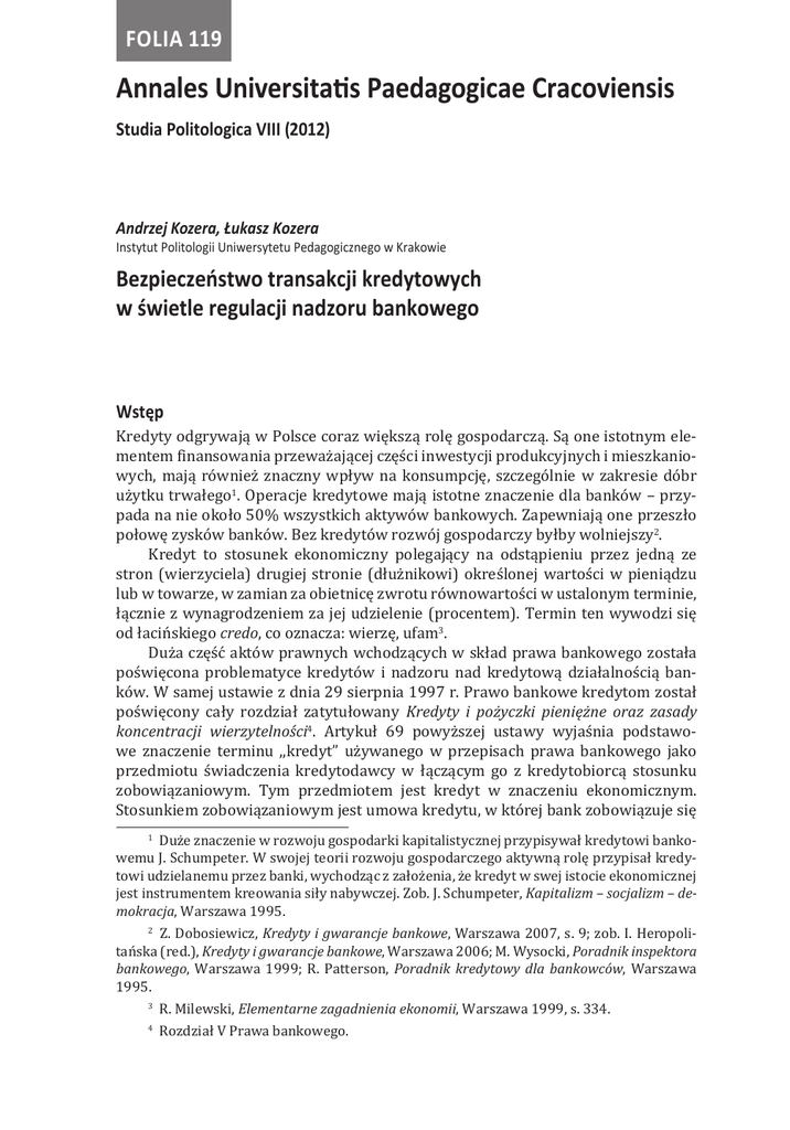 Folia 119 Annales Universitatis Paedagogicae Cracoviensis Studia Politologica VIII (2012) Andrzej Kozera, Łukasz Kozera Instytut Politologii Uniwersytetu Pedagogicznego w Krakowie Bezpieczeństwo transakcji kredytowych w świetle regulacji nadzoru bankowego Wstęp Kredyty odgrywają w Polsce coraz większą rolę gospodarczą. Są one istotnym elementem finansowania przeważającej części inwestycji produkcyjnych i mieszkaniowych, mają również znaczny wpływ na konsumpcję, szczególnie w zakresie dóbr użytku trwałego1. Operacje kredytowe mają istotne znaczenie dla banków – przypada na nie około 50% wszystkich aktywów bankowych. Zapewniają one przeszło połowę zysków banków. Bez kredytów rozwój gospodarczy byłby wolniejszy2. Kredyt to stosunek ekonomiczny polegający na odstąpieniu przez jedną ze stron (wierzyciela) drugiej stronie (dłużnikowi) określonej wartości w pieniądzu lub w towarze, w zamian za obietnicę zwrotu równowartości w ustalonym terminie, łącznie z wynagrodzeniem za jej udzielenie (procentem). Termin ten wywodzi się od łacińskiego credo, co oznacza: wierzę, ufam3. Duża część aktów prawnych wchodzących w skład prawa bankowego została poświęcona problematyce kredytów i nadzoru nad kredytową działalnością banków. W samej ustawie z dnia 29 sierpnia 1997 r. Prawo bankowe kredytom został poświęcony cały rozdział zatytułowany Kredyty i pożyczki pieniężne oraz zasady koncentracji wierzytelności4. Artykuł 69 powyższej ustawy wyjaśnia podstawowe znaczenie terminu ,,kredyt” używanego w przepisach prawa bankowego jako przedmiotu świadczenia kredytodawcy w łączącym go z kredytobiorcą stosunku zobowiązaniowym. Tym przedmiotem jest kredyt w znaczeniu ekonomicznym. Stosunkiem zobowiązaniowym jest umowa kredytu, w której bank zobowiązuje się 1 Duże znaczenie w rozwoju gospodarki kapitalistycznej przypisywał kredytowi bankowemu J. Schumpeter. W swojej teorii rozwoju gospodarczego aktywną rolę przypisał kredytowi udzielanemu przez banki, wychodząc z założenia, że kredyt w swej istocie ekonomicznej jest instrumentem kreowania siły nabywczej. Zob. J. Schumpeter, Kapitalizm – socjalizm – demokracja, Warszawa 1995. 2 Z. Dobosiewicz, Kredyty i gwarancje bankowe, Warszawa 2007, s. 9; zob. I. Heropolitańska (red.), Kredyty i gwarancje bankowe, Warszawa 2006; M. Wysocki, Poradnik inspektora bankowego, Warszawa 1999; R. Patterson, Poradnik kredytowy dla bankowców, Warszawa 1995. 3 4 R. Milewski, Elementarne zagadnienia ekonomii, Warszawa 1999, s. 334. Rozdział V Prawa bankowego. [122] Andrzej Kozera, Łukasz Kozera oddać do dyspozycji kredytobiorcy na czas oznaczony kwotę środków pieniężnych z przeznaczeniem na ustalony cel. Kredytobiorca zaś zobowiązuje się do korzystania z niej na warunkach określonych w umowie, zwrotu kwoty wykorzystanego kredytu wraz z odsetkami w oznaczonych terminach oraz zapłaty prowizji od udzielonego kredytu5. Zarys polskiego systemu bankowego Przeprowadzona w 2004 r. nowelizacja prawa bankowego miała na celu zbliżenie zasad działania banków w Polsce i w Europie Zachodniej. Istotną zmianą było wprowadzenie tzw. outsourcingu bankowego, tzn. legalnego przenoszenia przez banki niektórych czynności bankowych na zewnątrz ich struktury organizacyjnej. Udzielanie kredytów nadal pozostaje czynnością bankową. Jednak może ona być w pewnym stopniu wykonywana przez inne jednostki nadzorowane i kontrolowane przez bank6. Z przepisu art. 69 Prawa bankowego wynika rozróżnienie kredytu i pożyczek7. Kredyt bowiem musi być udzielany na określony cel, zaś pożyczka – niekoniecznie8. Poza tym pożyczek może w praktyce udzielać każdy. Problemy z tym związane reguluje kodeks cywilny9. Banki natomiast mają wyłączność na udzielanie kredytów. Warto zastanowić się, co to oznacza w praktyce. Jeżeli wierzytelność jest regularnie spłacana, w zasadzie nie ma różnicy między kredytem a pożyczką. Można udzielić pożyczki tak samo oprocentowanej jak kredyt, podobnie uregulować spłatę itp. Prawdziwa różnica między kredytem a pożyczką uwidacznia się wtedy, gdy wierzytelność nie jest spłacana. Pożyczkodawca, który chce odzyskać pieniądze, musi wytoczyć pożyczkobiorcy powództwo cywilne. Proces sądowy może trwać nawet kilka lat. Zupełnie inaczej wygląda sprawa, jeżeli chodzi o kredyt. Tutaj najczęściej powództwo sądowe nie jest potrzebne. Kredytodawca wystawia bankowy tytuł egzekucyjny, który po zatwierdzeniu przez sędziego staje się tytułem wykonawczym dla komornika wskazanego przez bank. Komornik ten przeprowadza egzekucję wierzytelności, tj. przejmuje zabezpieczenie kredytu i sprzedaje je. Pozwala to na przynajmniej częściowe pokrycie należności wobec wierzyciela. Różnica pomiędzy kredytem a pożyczką jest więc znaczna. Oprócz skomentowanego powyżej przepisu w rozdziale V Prawa bankowego szczegółowo uregulowane zostały takie kwestie, jak zawartość umowy kredytowej, określenie zdolności kredytowej, sprawa koncentracji wierzytelności i postępowanie banku w przypadku zagrożeń spłaty kredytu. Ponadto ustawa nakłada na banki liczne ograniczenia, mające na celu powstrzymanie go przed podejmowaniem 5 Art. 69 Prawa bankowego. 7 Przy uwzględnieniu treści art. 78 Prawa bankowego. 9 Art. 720–724 kc. Zob. D. Daniluk, S. Niemierka, Nowe prawo bankowe na tle regulacji ostrożnościowych Unii Europejskiej, „Prawo Bankowe” 1998, nr 1, s. 107. 6 W praktyce jednakże występują przypadki kredytów, których nikt nie kontroluje ze względu na przeznaczenie środków. Dotyczy to kredytów: lombardowego, gotówkowego i kredytów studenckich. Mamy więc do czynienia z przepisami, które nie są w pełni wprowadzone w życie. Z. Dobosiewicz, Kredyty..., s. 14. 8 Bezpieczeństwo transakcji kredytowych w świetle regulacji nadzoru bankowego [123] nadmiernego ryzyka. Wprowadzono też pewne prawa chroniące klient